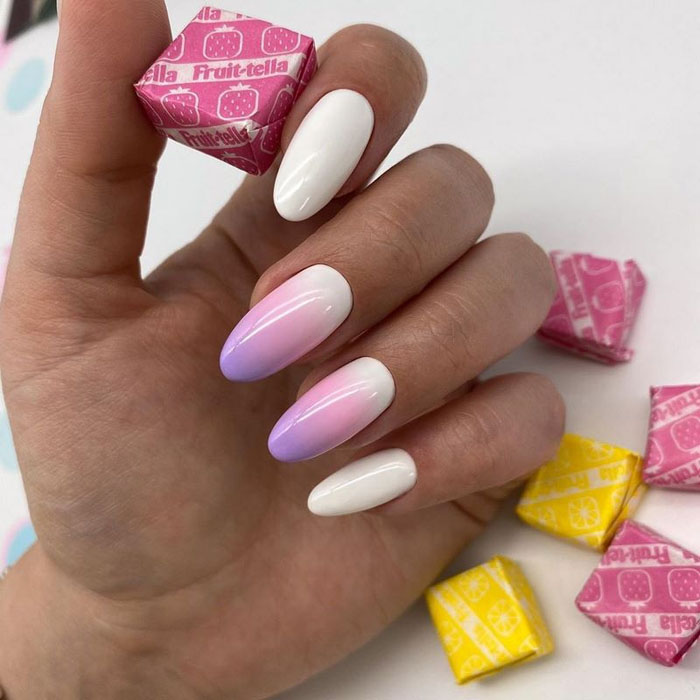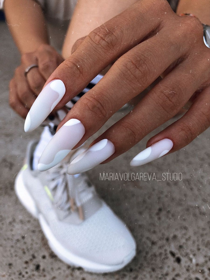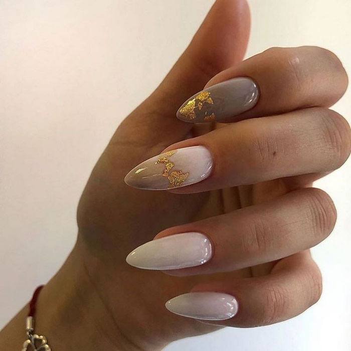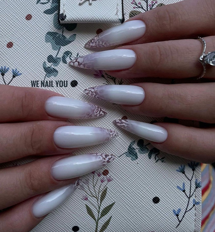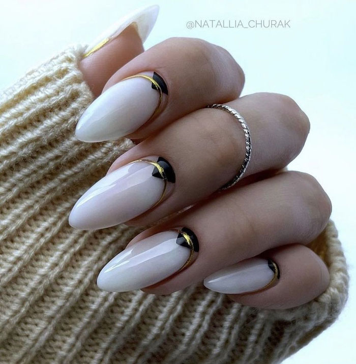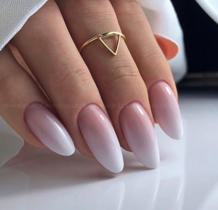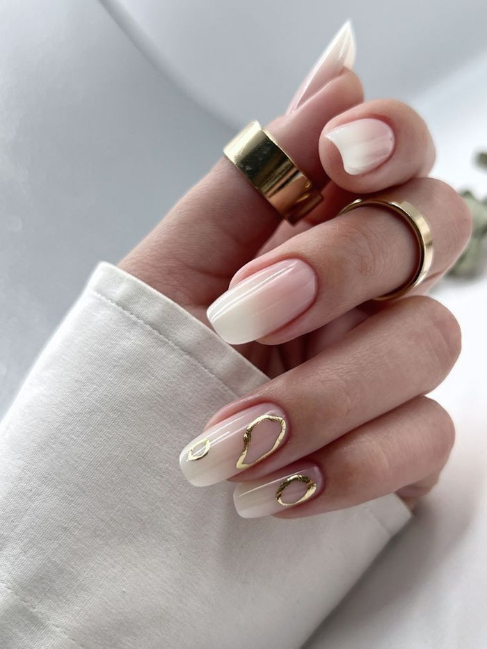 Очень стильно на молочной базе смотрится градиентный дизайн. Как правило, мастер начинает с яркого оттенка, располагая его в зоне лунулы. Затем оттенок постепенно светлеет и переходит в молочный. Это стильный и интересный вариант дизайна, который делает маникюр дорогим и заметным.