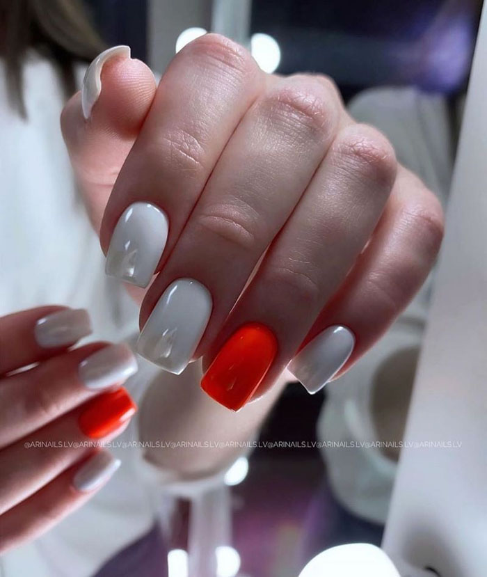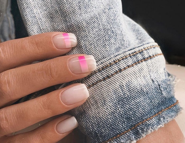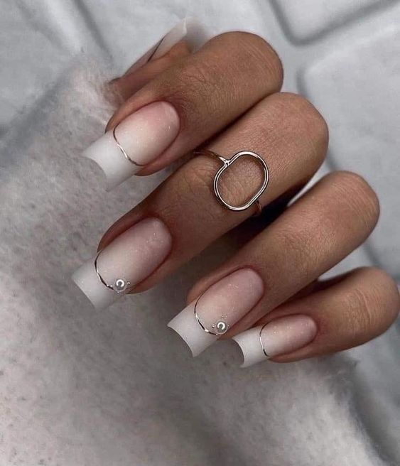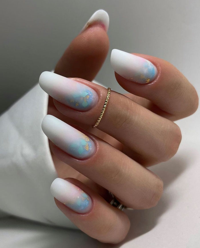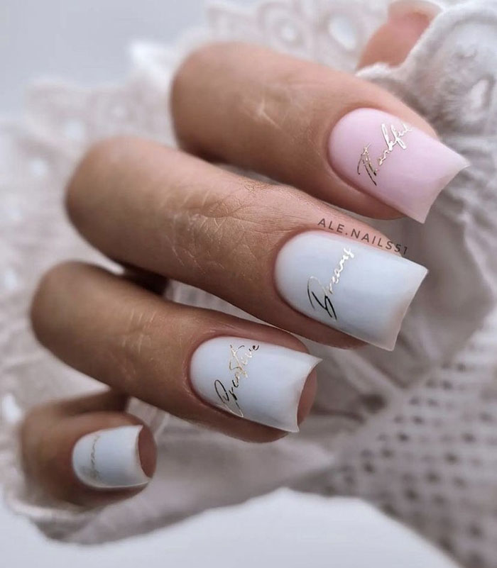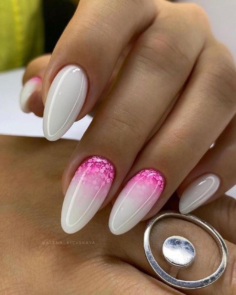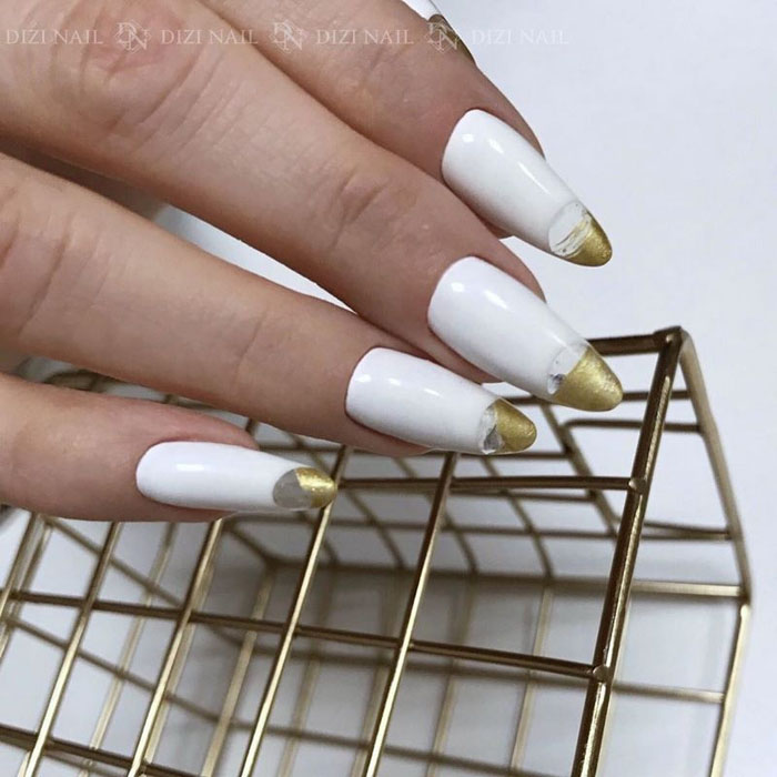 Очень стильно на молочной базе смотрится градиентный дизайн. Как правило, мастер начинает с яркого оттенка, располагая его в зоне лунулы. Затем оттенок постепенно светлеет и переходит в молочный. Это стильный и интересный вариант дизайна, который делает маникюр дорогим и заметным.