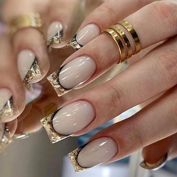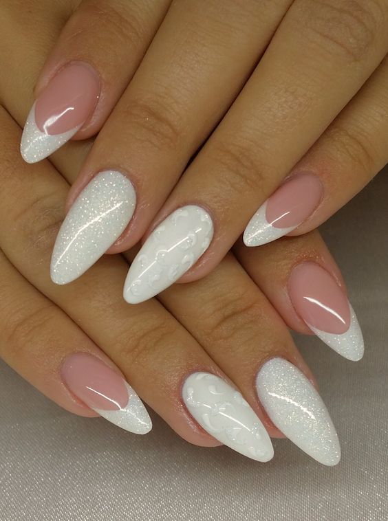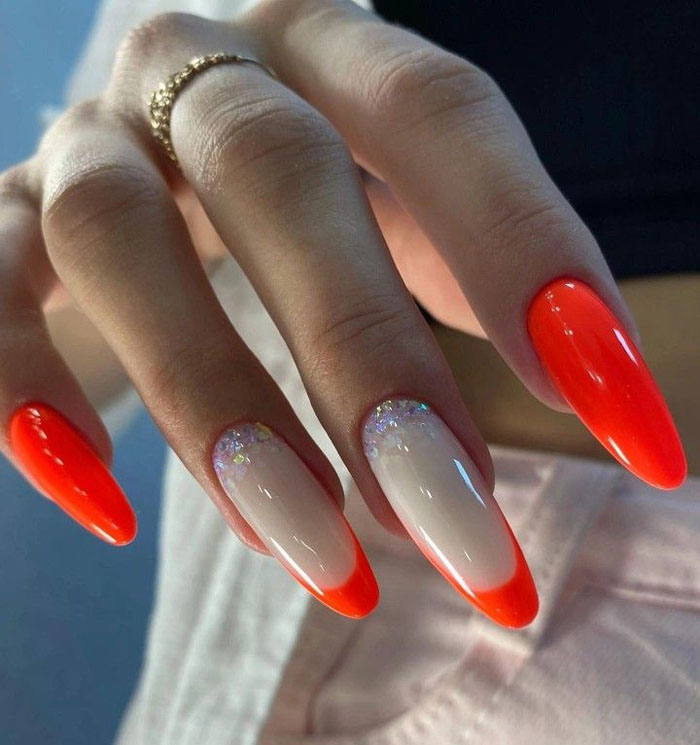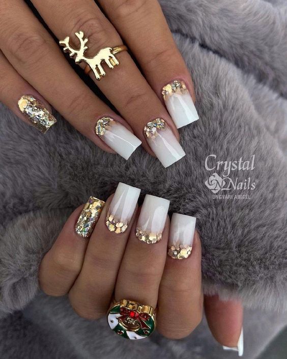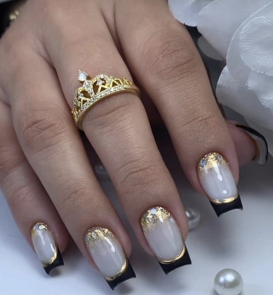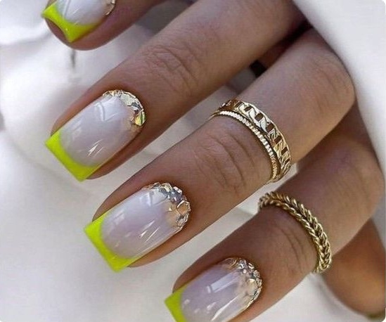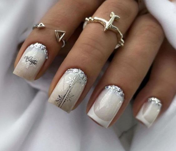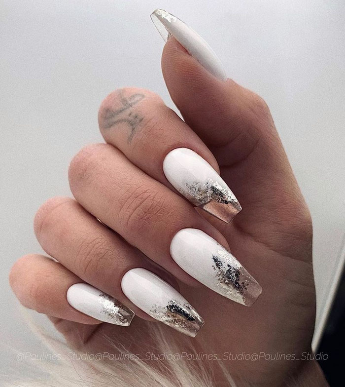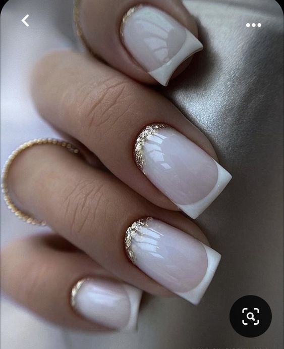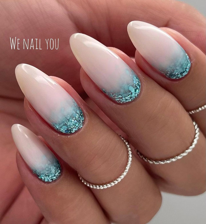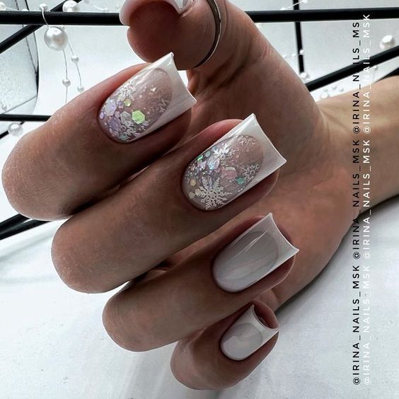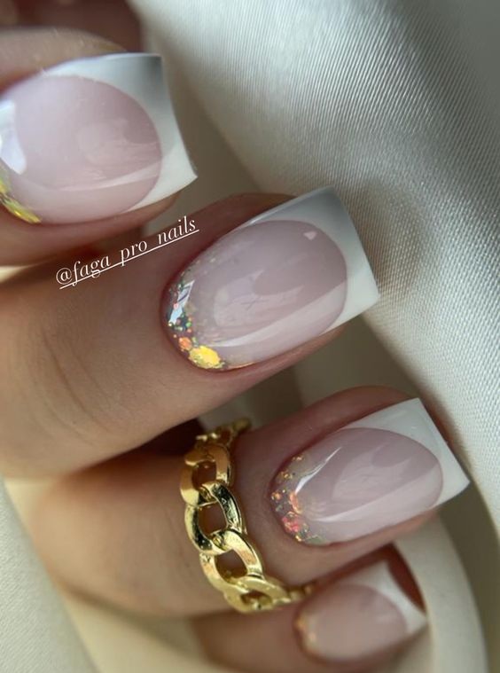 - френч с блестками: вместо обычной белой полосы на ногтях сделайте френч маникюр с блестками. Это придаст классическому дизайну особое великолепие;