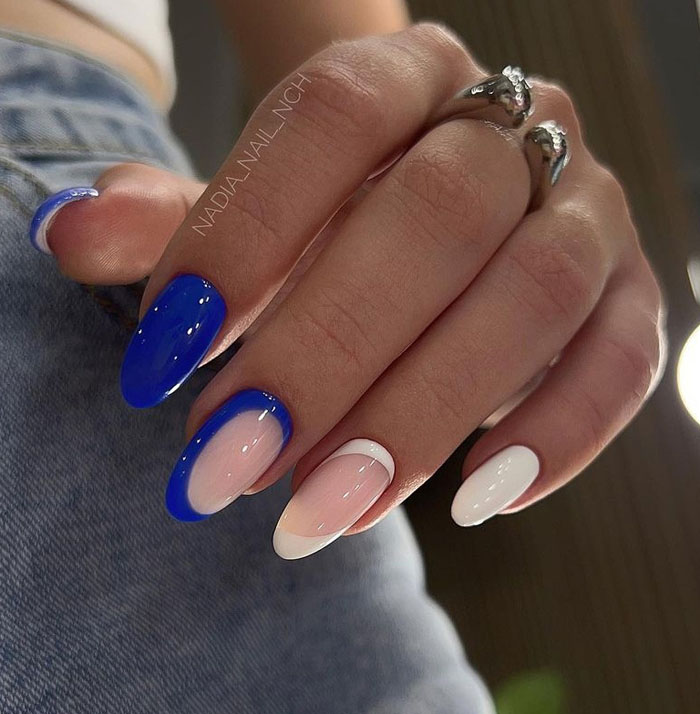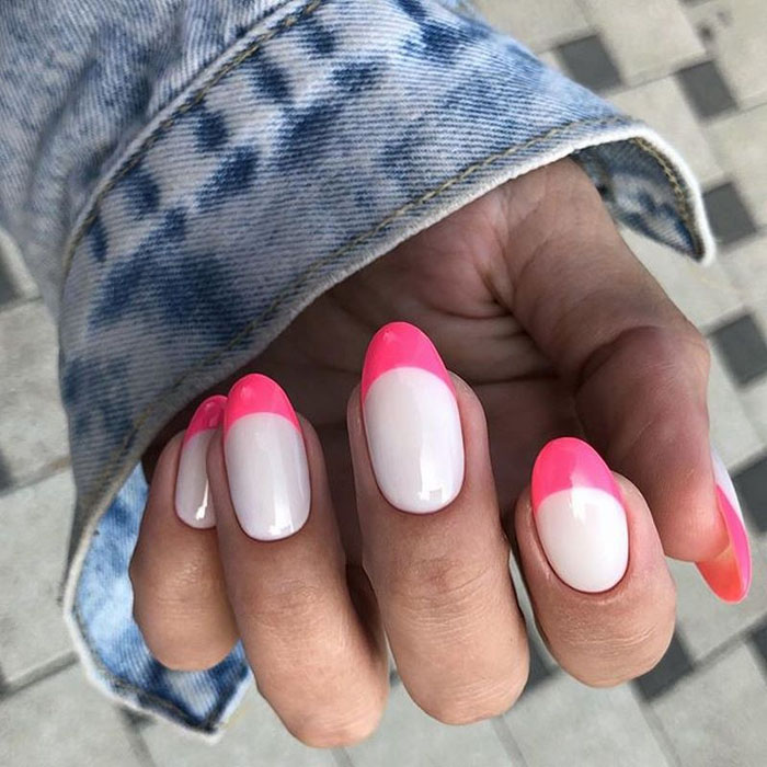 В классическом варианте френча для базы используется прозрачный лак. Современный вариант французского маникюра предполагает более интересные решения — цветную окантовку, блестящий декор и базу иного оттенка. Чаще всего используют полупрозрачную основу молочного оттенка. А улыбку френча можно сделать как классической плотной белой, так и яркой цветной.