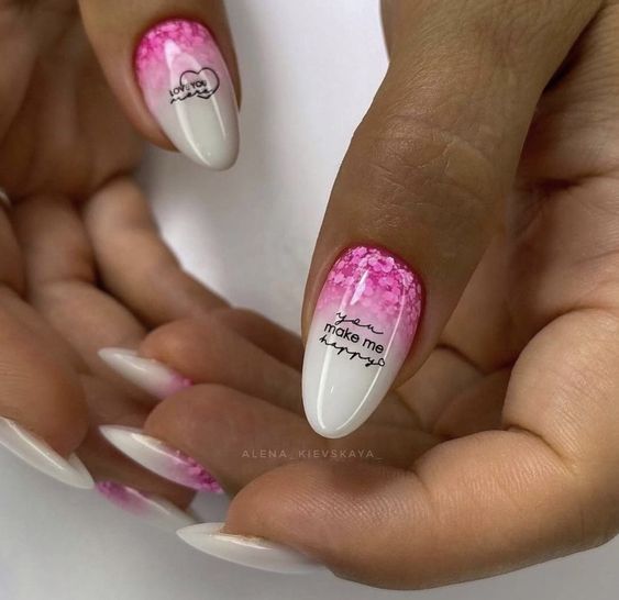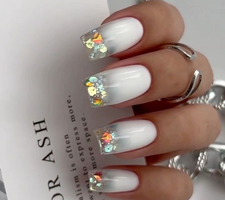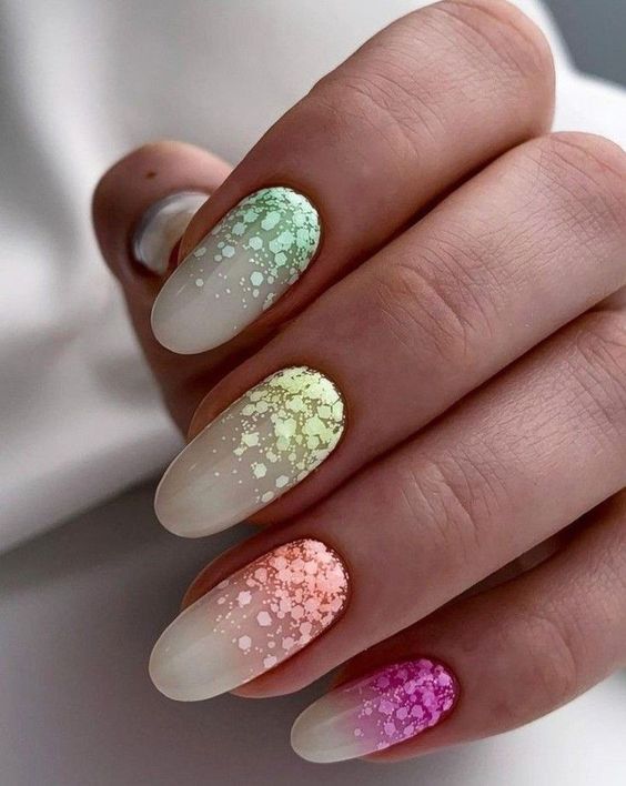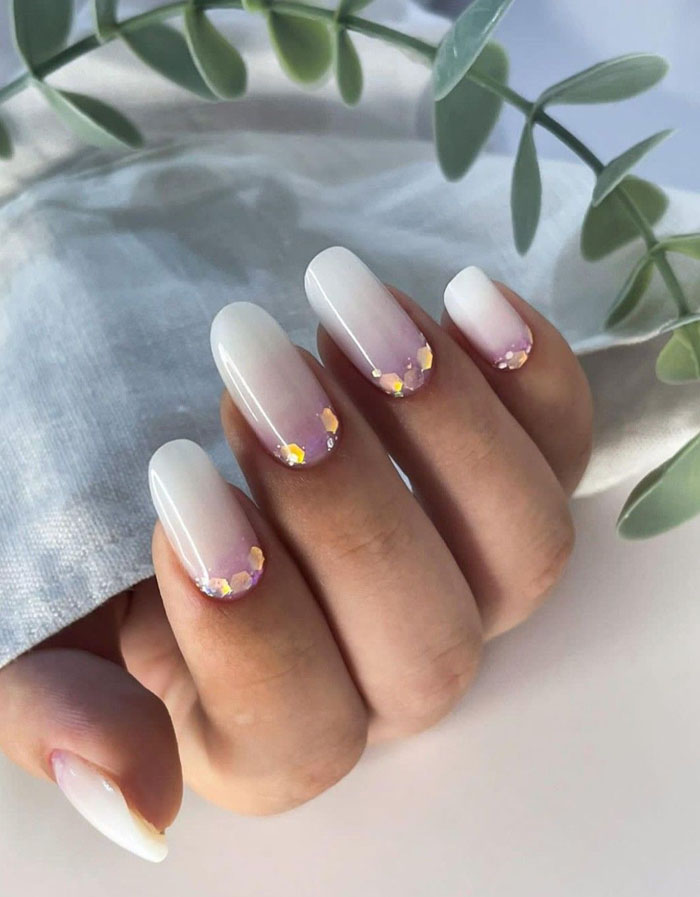 Совет: дополните яркий градиент на молочной базе блестками, чтобы сделать дизайн более ярким и праздничным.