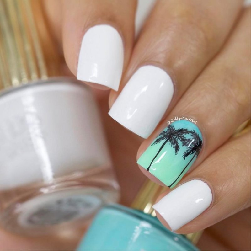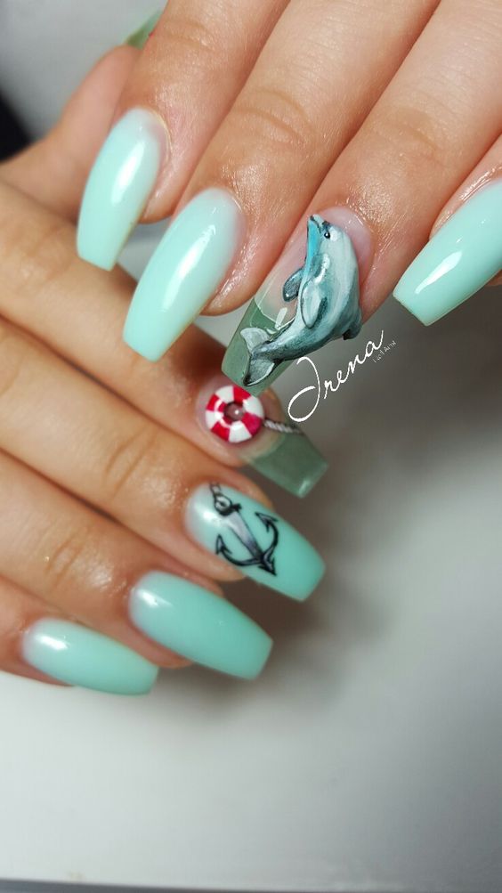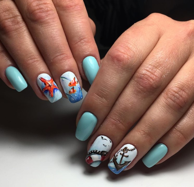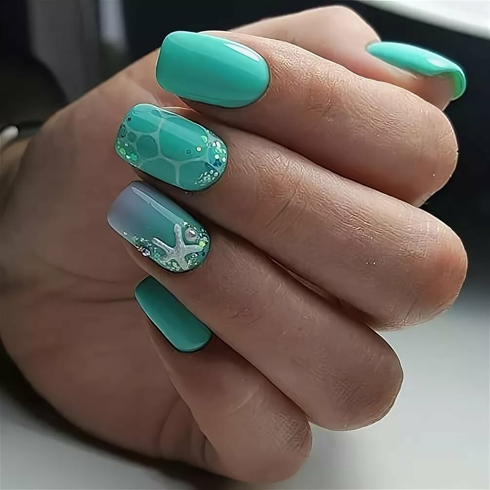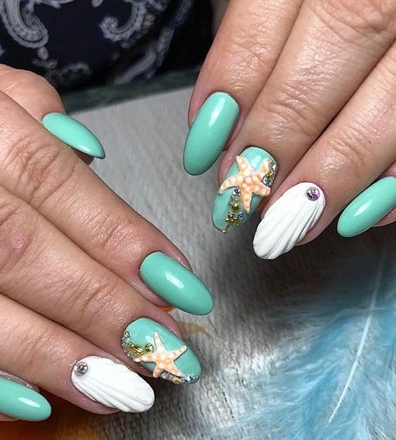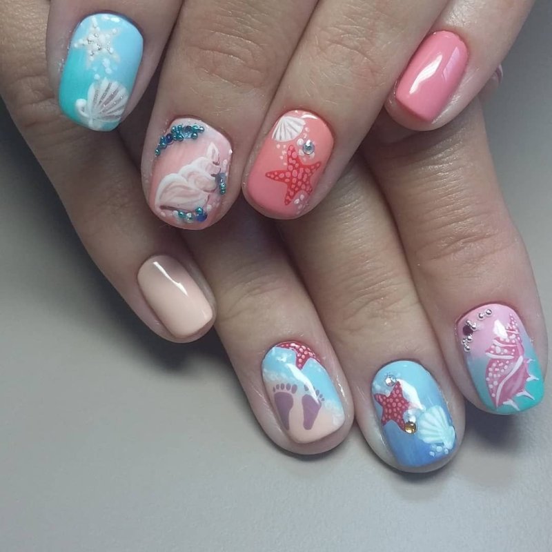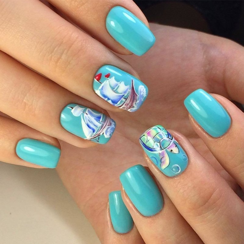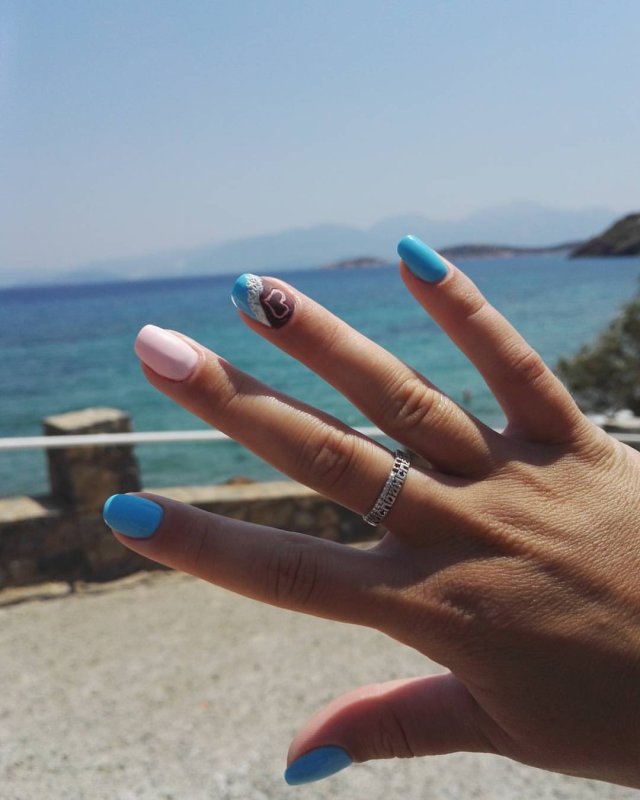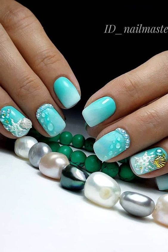 Это хорошая альтернатива голубой и синей палитре. Сочетание голубого и зеленого — мятный — хорошо вписывается в любой образ на отдыхе. Обязательно дополните дизайн декоративными элементами. Интересный момент — мастера нейл-арта делятся на две категории. Одни полагают, что на отдыхе необходимо дать пластинам отдых и отказаться от активного арта. Да и вообще снять нарощенные ногти, отказаться от дизайнов и заняться питанием и лечением ногтей. Другие, наоборот, предлагают использовать все варианты дизайнов. Ведь летом практически невозможно сделать арт чрезмерным. Лето так коротко, что не стоит скромничать и делать слишком скромные варианты.