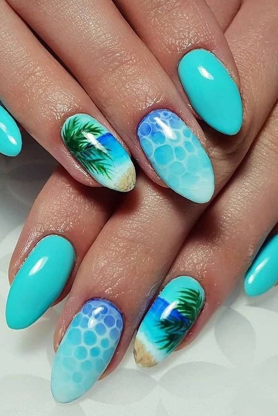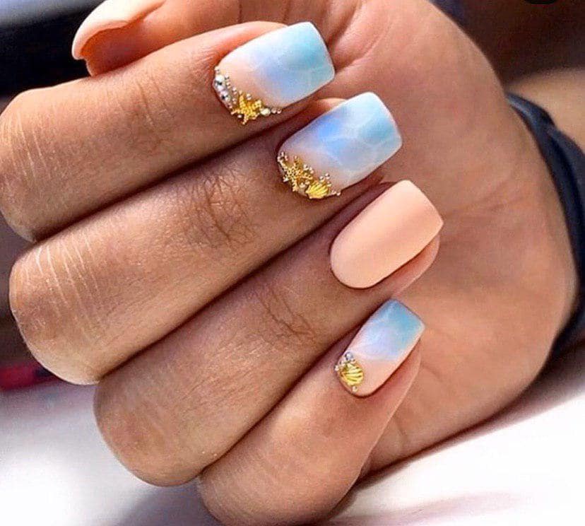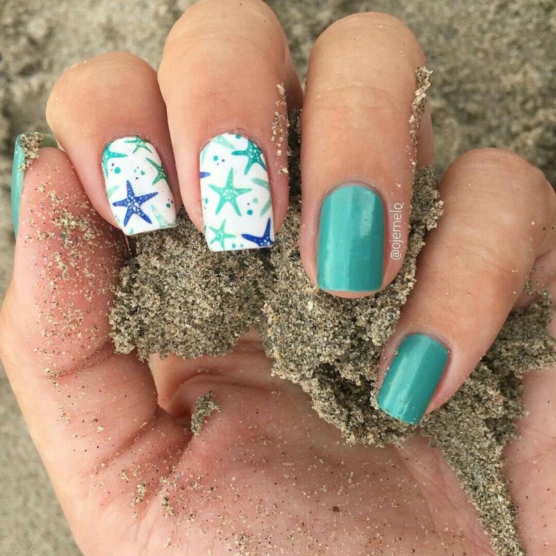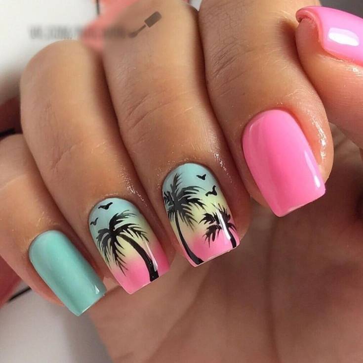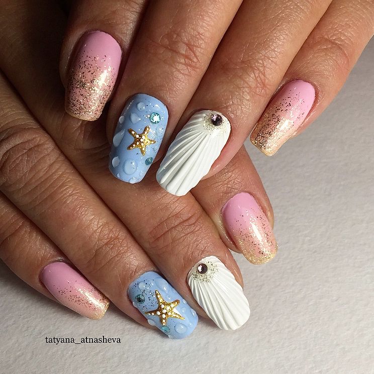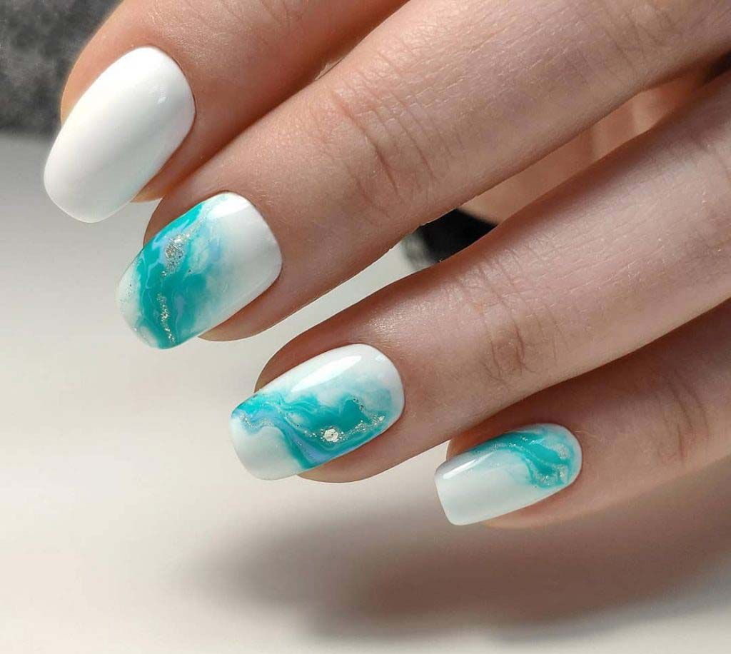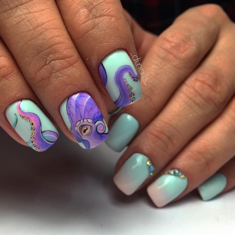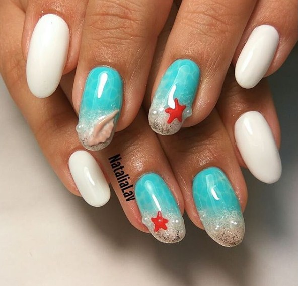 Это хорошая альтернатива голубой и синей палитре. Сочетание голубого и зеленого — мятный — хорошо вписывается в любой образ на отдыхе. Обязательно дополните дизайн декоративными элементами. Интересный момент — мастера нейл-арта делятся на две категории. Одни полагают, что на отдыхе необходимо дать пластинам отдых и отказаться от активного арта. Да и вообще снять нарощенные ногти, отказаться от дизайнов и заняться питанием и лечением ногтей. Другие, наоборот, предлагают использовать все варианты дизайнов. Ведь летом практически невозможно сделать арт чрезмерным. Лето так коротко, что не стоит скромничать и делать слишком скромные варианты.