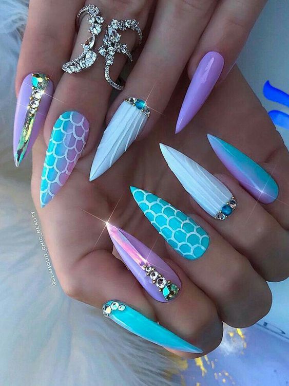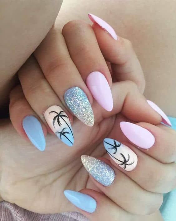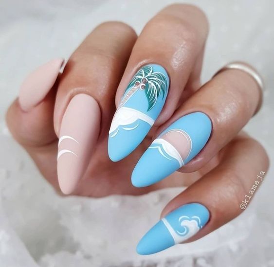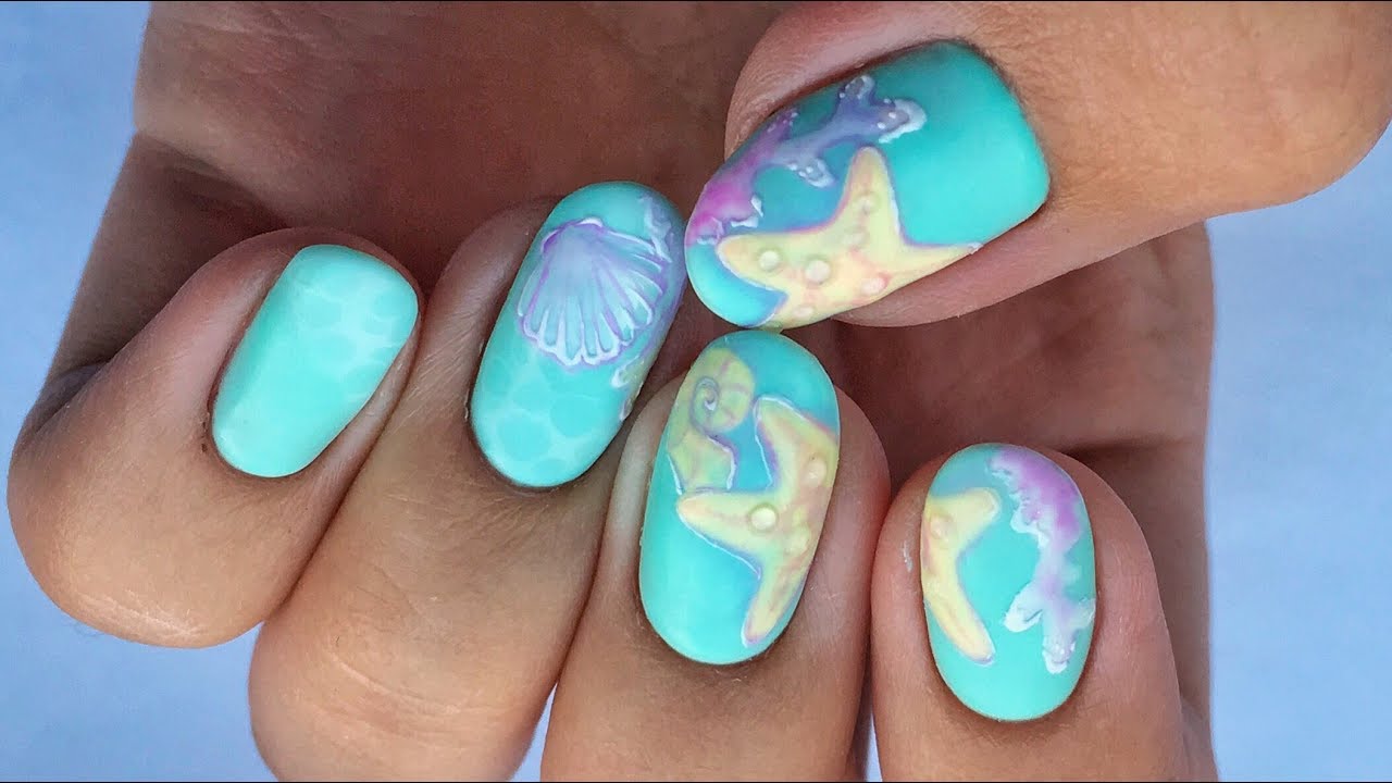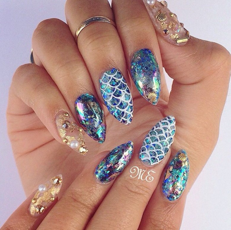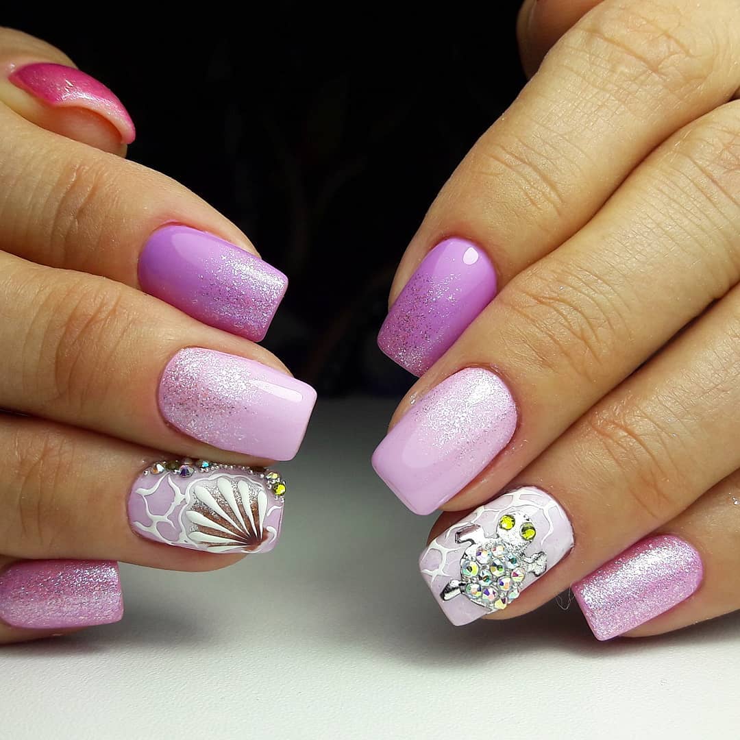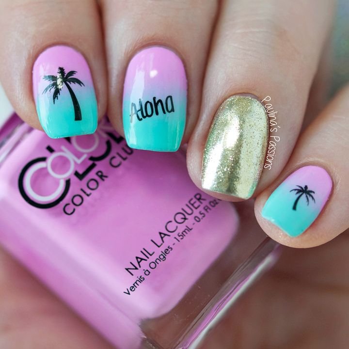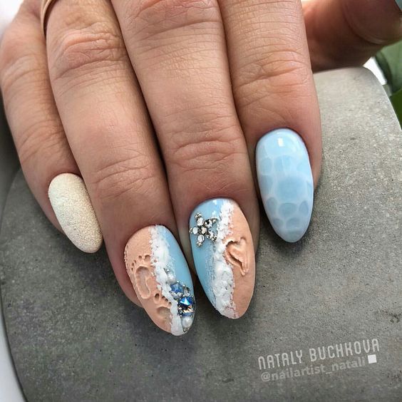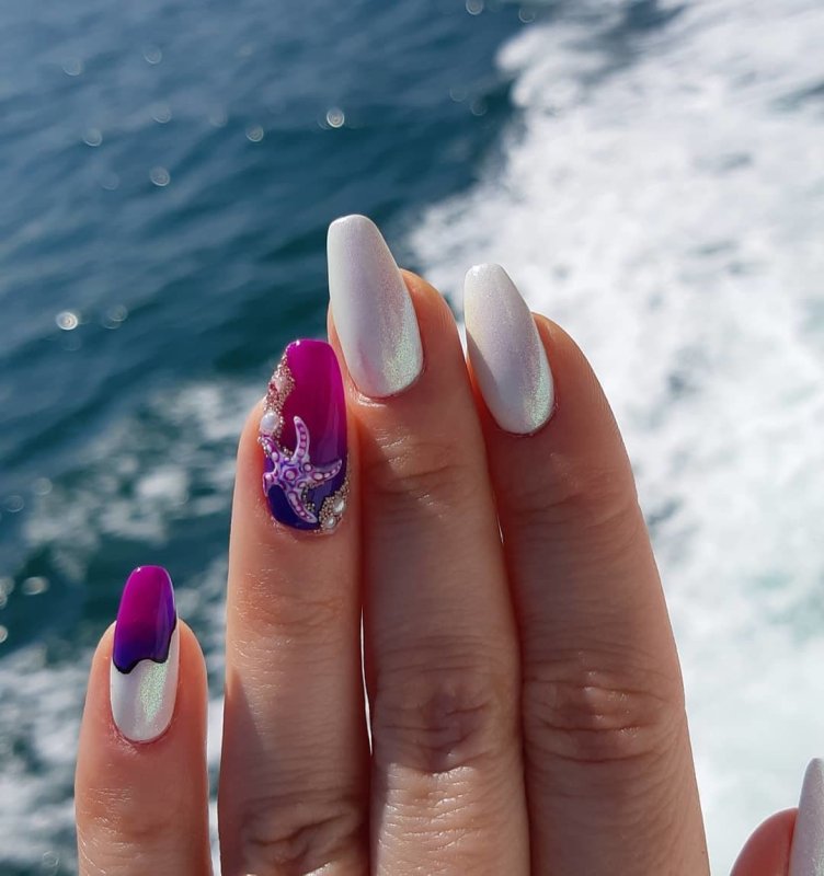 Это хорошая альтернатива голубой и синей палитре. Сочетание голубого и зеленого — мятный — хорошо вписывается в любой образ на отдыхе. Обязательно дополните дизайн декоративными элементами. Интересный момент — мастера нейл-арта делятся на две категории. Одни полагают, что на отдыхе необходимо дать пластинам отдых и отказаться от активного арта. Да и вообще снять нарощенные ногти, отказаться от дизайнов и заняться питанием и лечением ногтей. Другие, наоборот, предлагают использовать все варианты дизайнов. Ведь летом практически невозможно сделать арт чрезмерным. Лето так коротко, что не стоит скромничать и делать слишком скромные варианты.