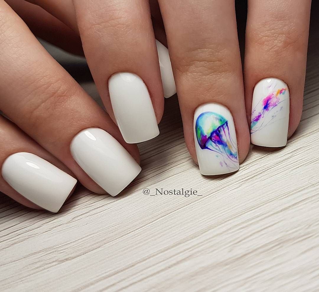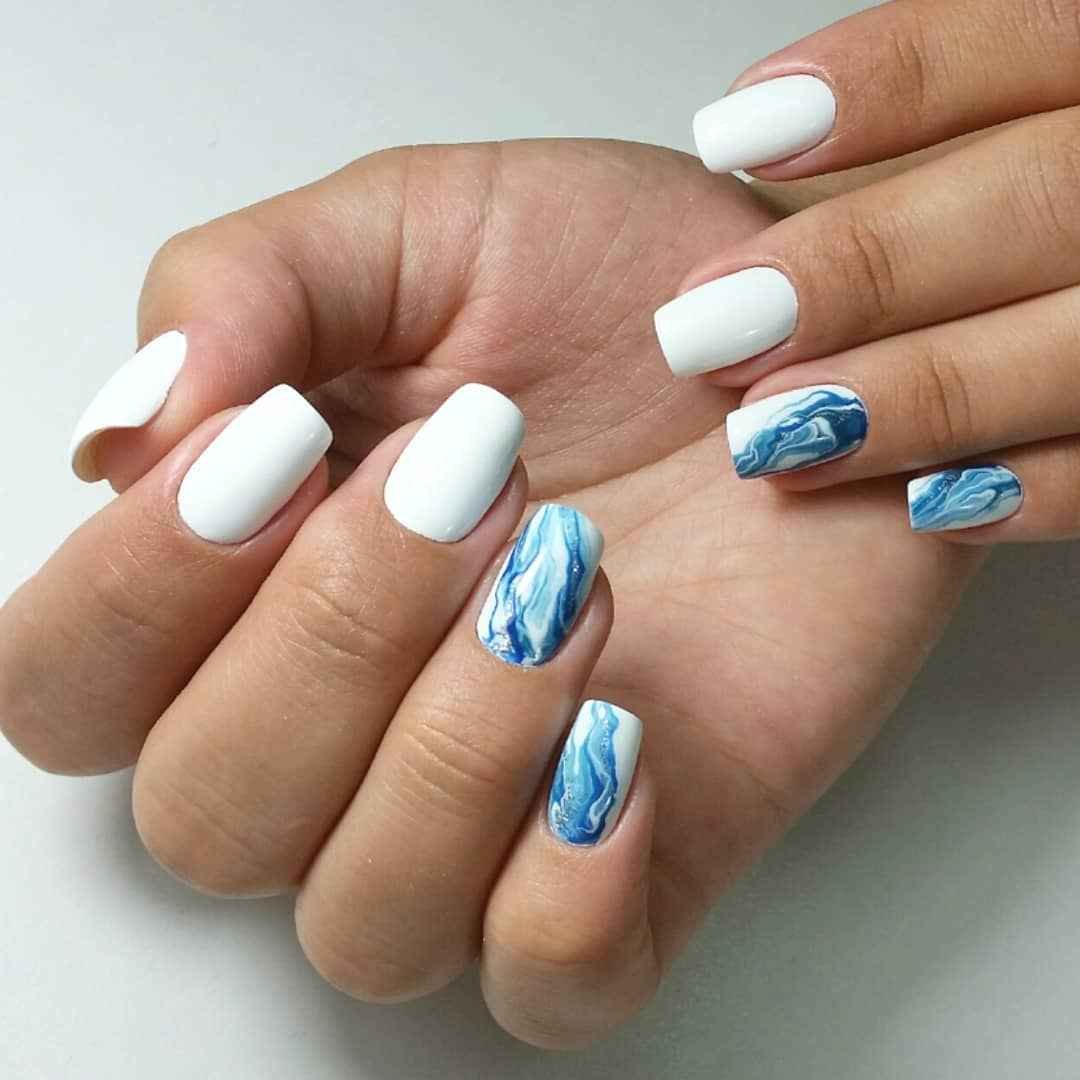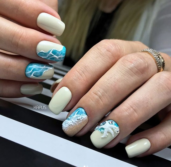 Рекомендуем использовать белый как базу в морском дизайне. Все дело в том, что этот оттенок отлично подходит загорелой коже. Так вы сможете подчеркнуть эффектный загар и создать стильный маникюр. Синие яркие волны отлично смотрятся на белой полупрозрачной основе. Дополнить дизайн можно камнями или тематическими рисунками типа морской звезды, ракушек и всего того, что можно встретить на морском дне.