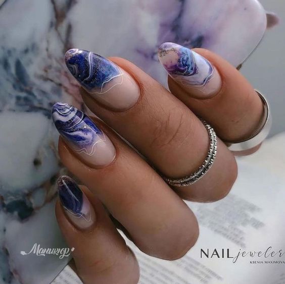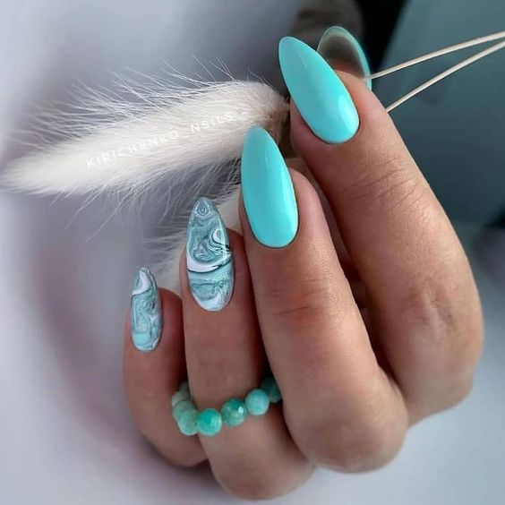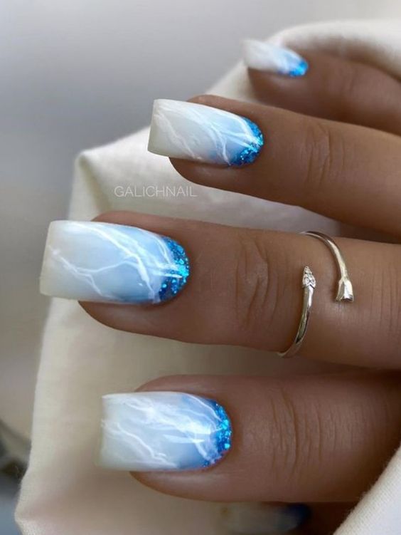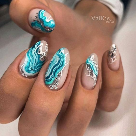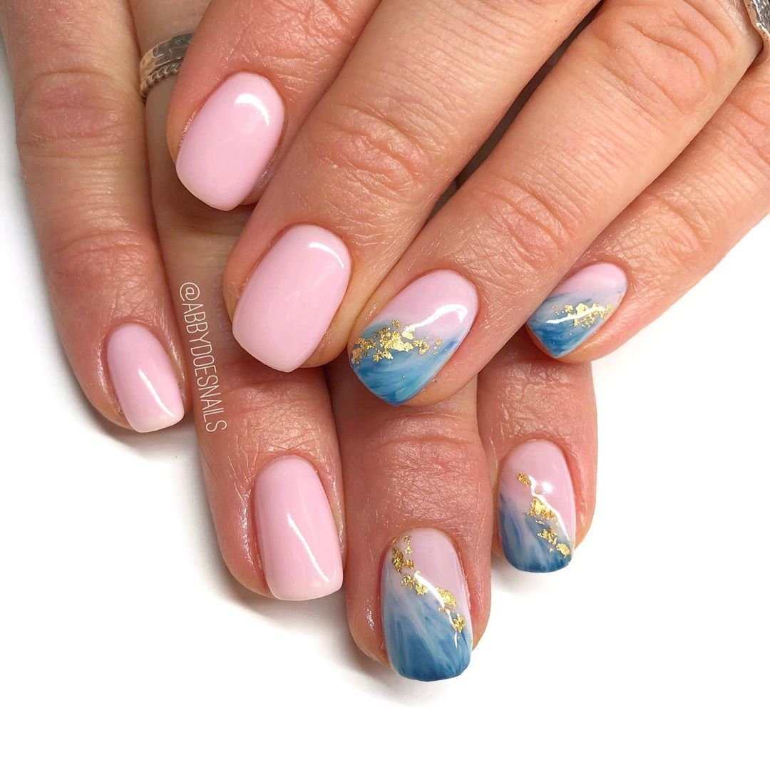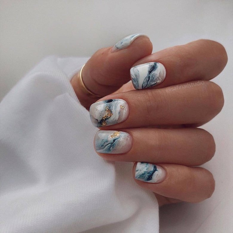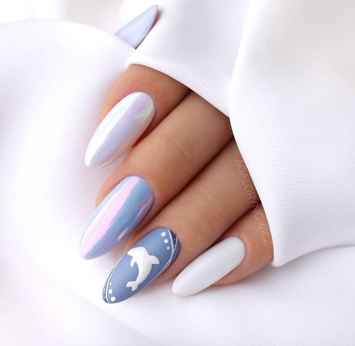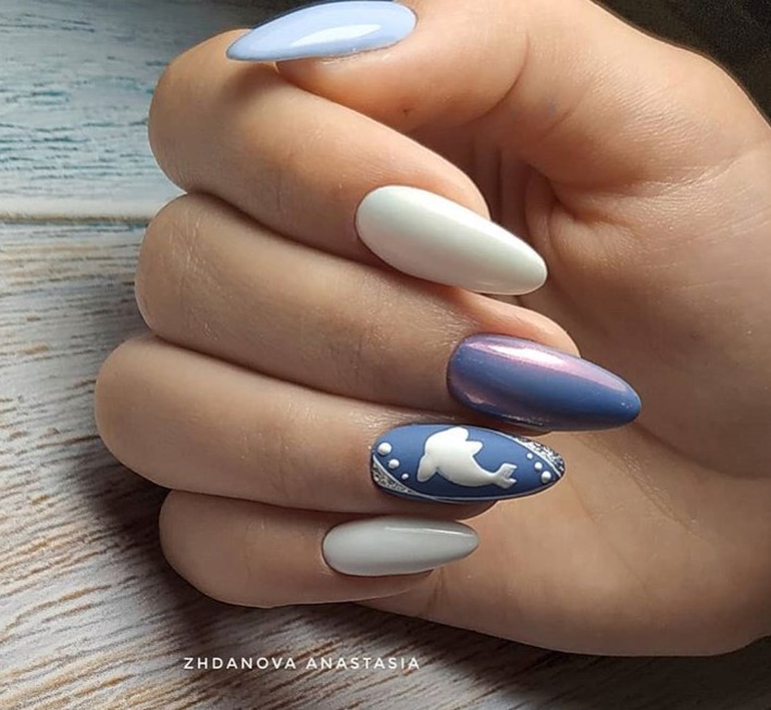Эти два оттенка отлично подходят для дополнения рисунка моря в летнем дизайне. Небольшие тонкие акценты сделают маникюр максимально актуальным, стильным и уникальным. Добавить блеска вы можете с помощью лака, пудры или глиттера. Подойдет и фольга.