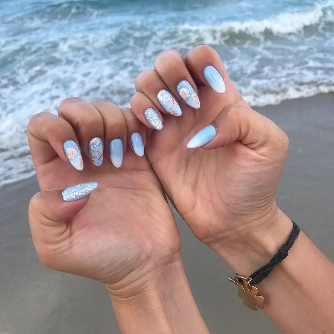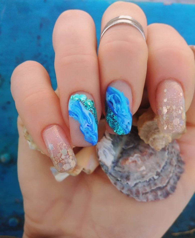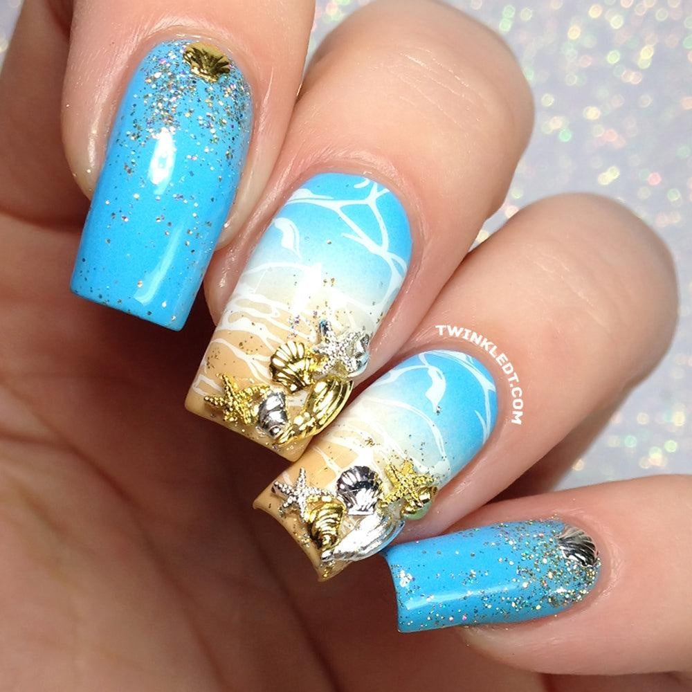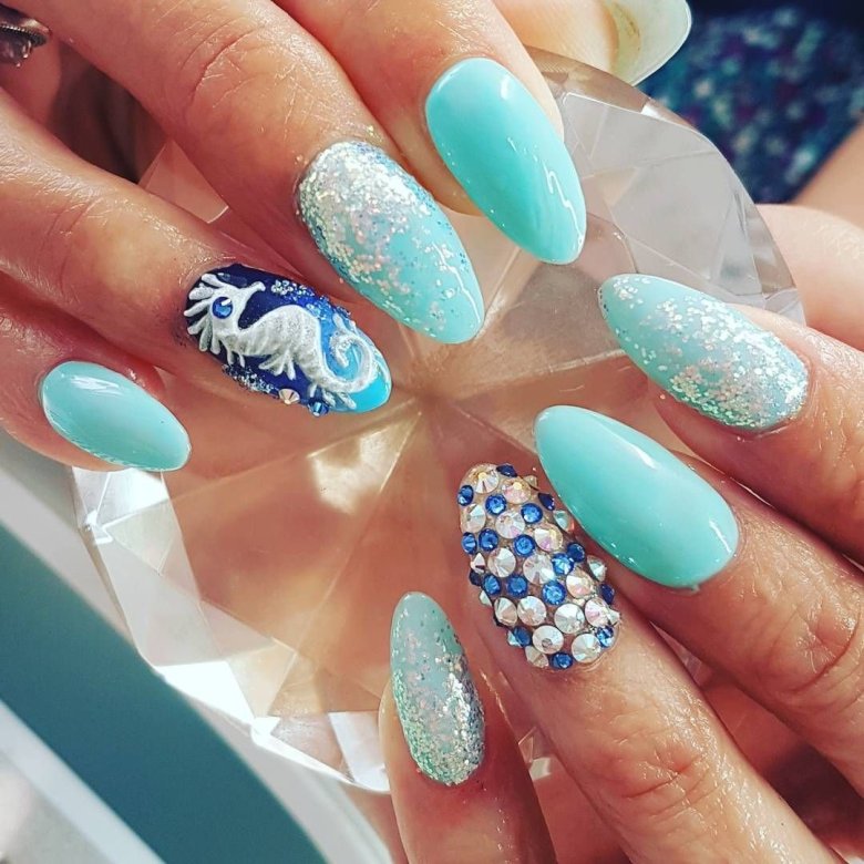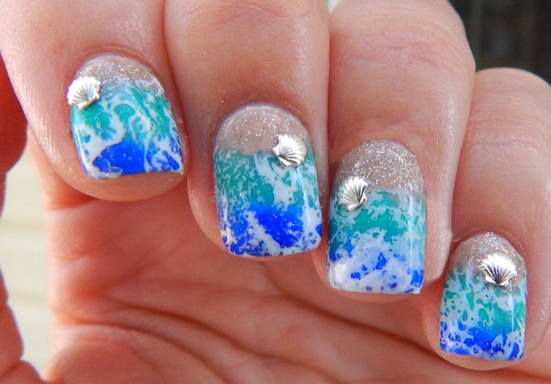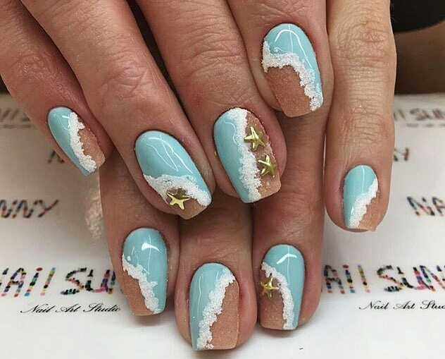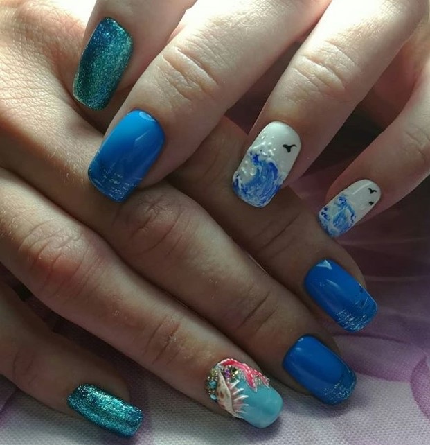 Немного блеска красивому маникюру с морем точно не помешает. Вспомните как блестит пляжный песок и ярко сверкают на солнце волны. Используйте глиттер, акриловую пудру, камифубуки и другие блестящие элементы декора. Но не стоит слишком усердствовать. если вы планируете носить маникюр в условиях города и пока еще не отправились на отдых, перегружать дизайн не нужно.