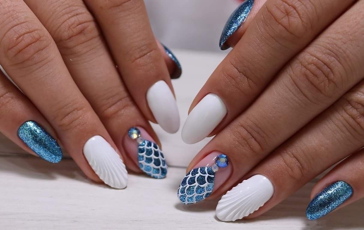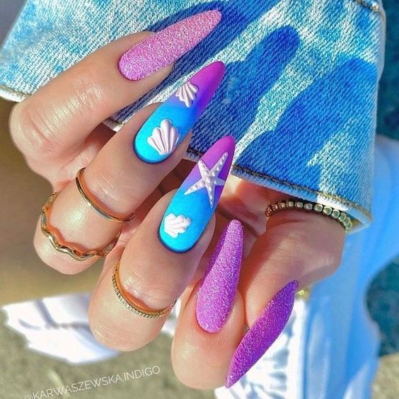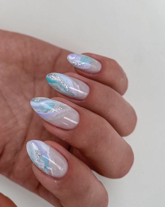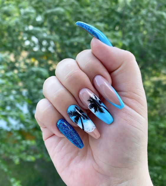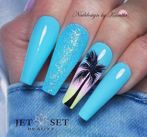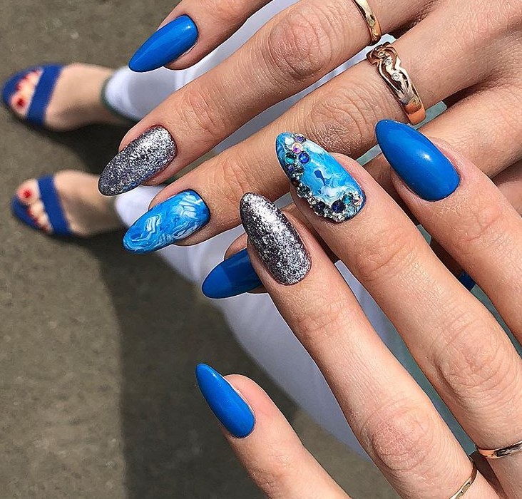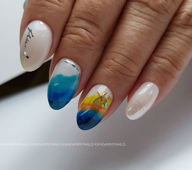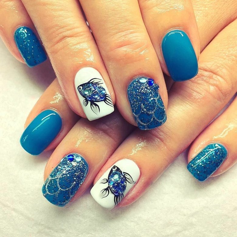 Немного блеска красивому маникюру с морем точно не помешает. Вспомните как блестит пляжный песок и ярко сверкают на солнце волны. Используйте глиттер, акриловую пудру, камифубуки и другие блестящие элементы декора. Но не стоит слишком усердствовать. если вы планируете носить маникюр в условиях города и пока еще не отправились на отдых, перегружать дизайн не нужно.