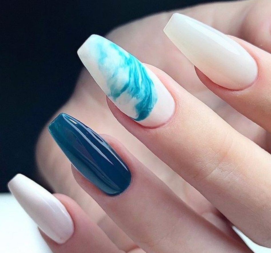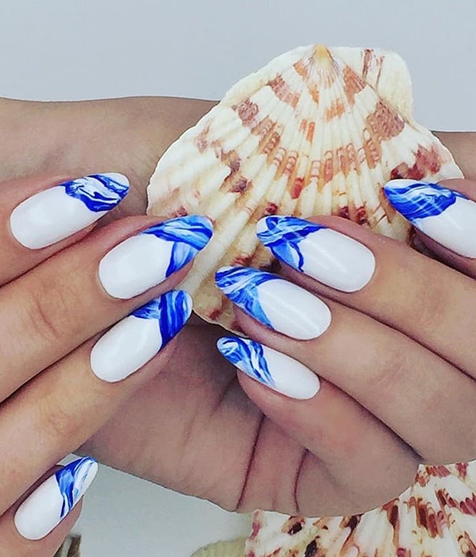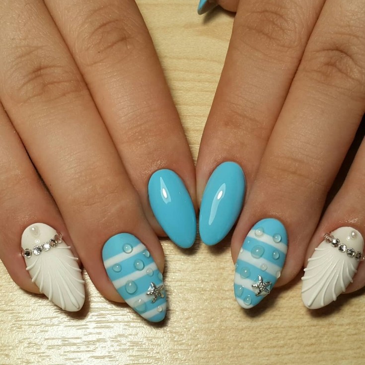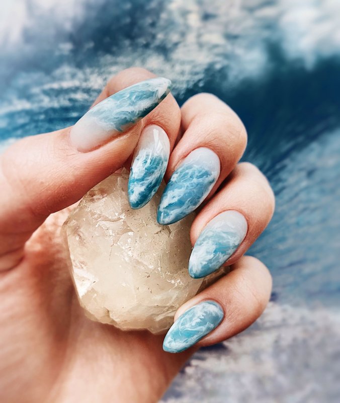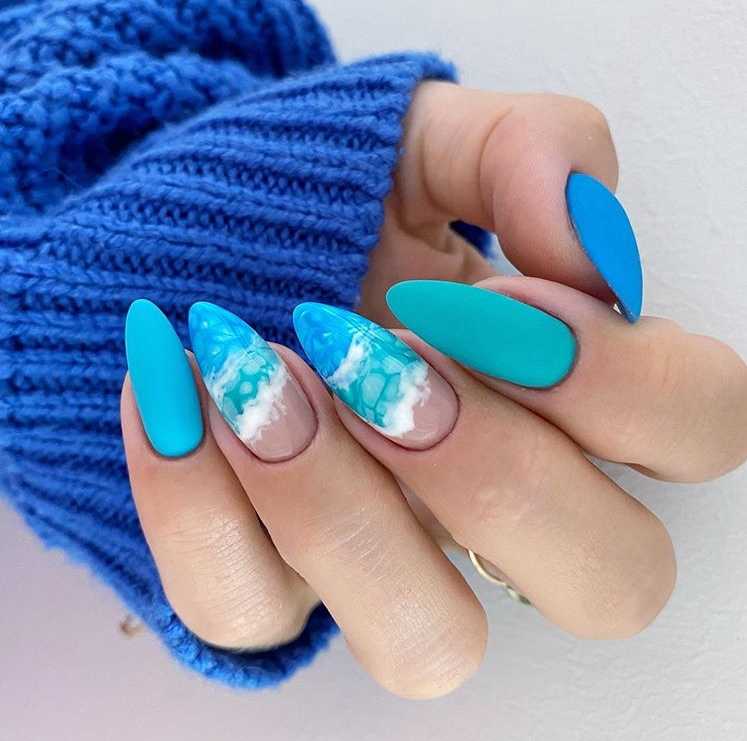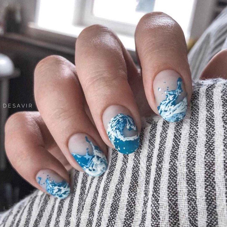 В каких оттенках сделать маникюр с морем? Не стоит, наверное, говорить, что прежде всего это все оттенки синего и голубого. Море изменчиво и те, кто проводит на нем много времени скажут вам — морские волны бывают самых разных оттенков. От яркого голубого до практически черного. И не забывайте о белом, ведь морская волна — это еще и красивая яркая пена. Из которой, по легенде, родилась богиня Афродита.