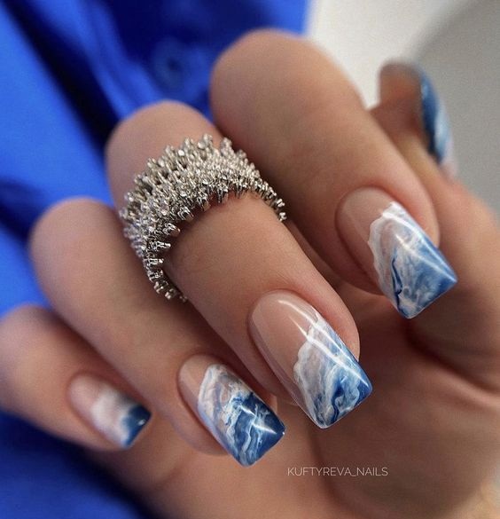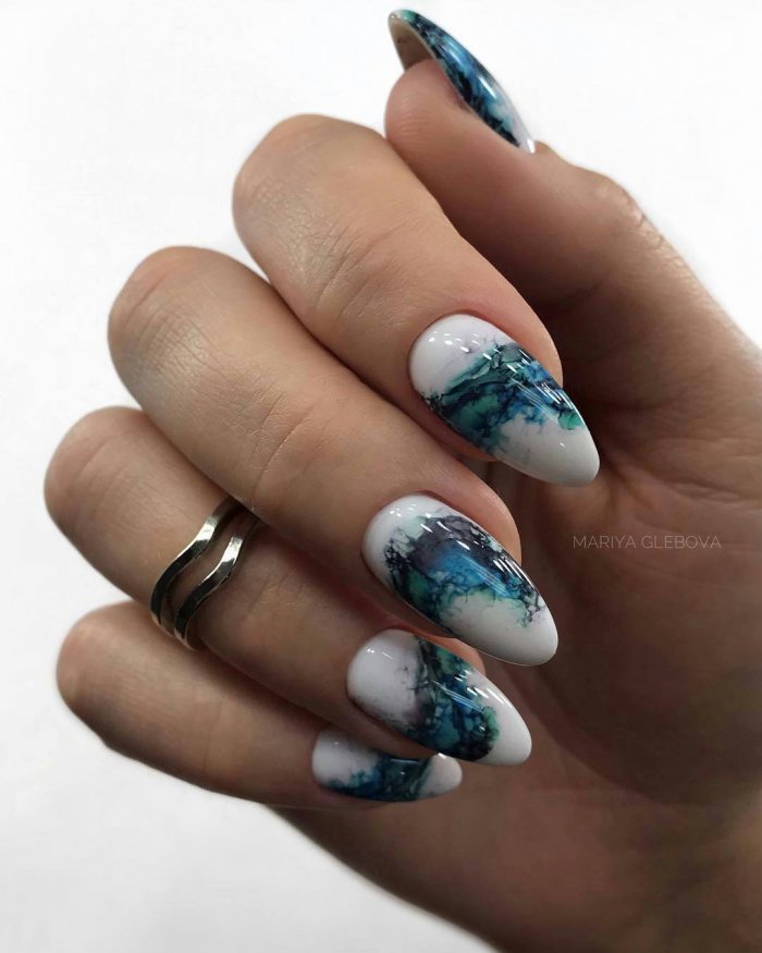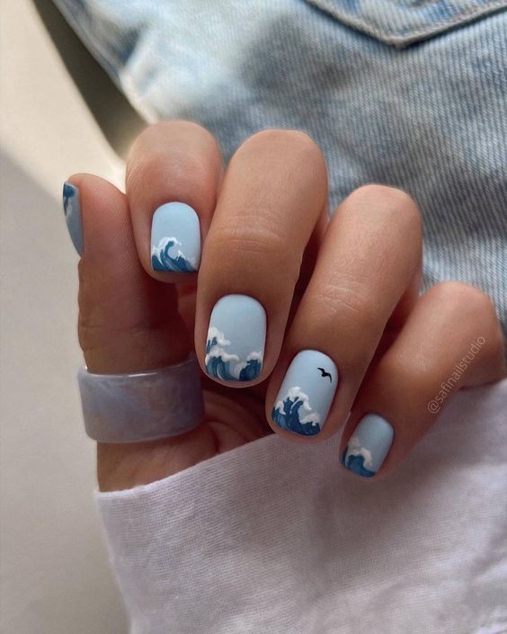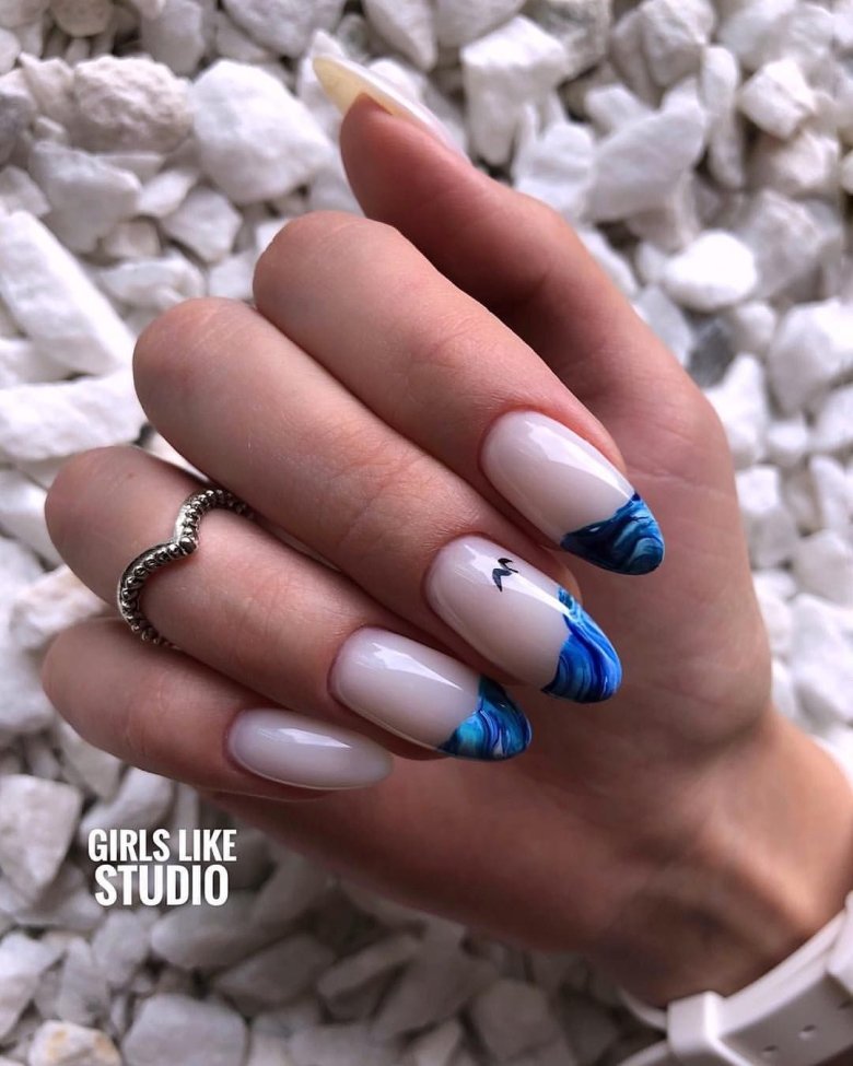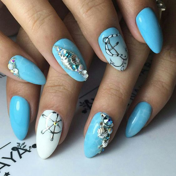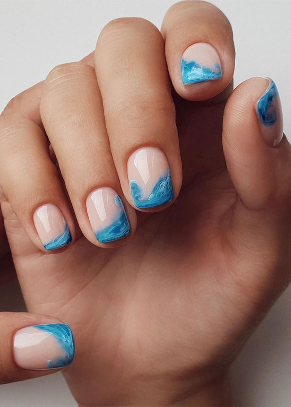 В каких оттенках сделать маникюр с морем? Не стоит, наверное, говорить, что прежде всего это все оттенки синего и голубого. Море изменчиво и те, кто проводит на нем много времени скажут вам — морские волны бывают самых разных оттенков. От яркого голубого до практически черного. И не забывайте о белом, ведь морская волна — это еще и красивая яркая пена. Из которой, по легенде, родилась богиня Афродита.
