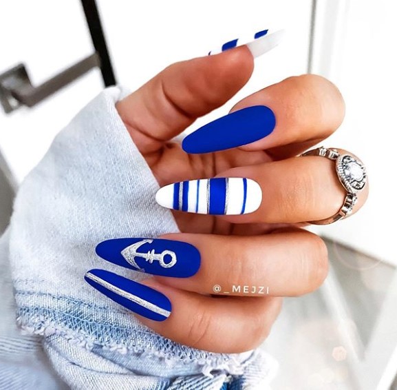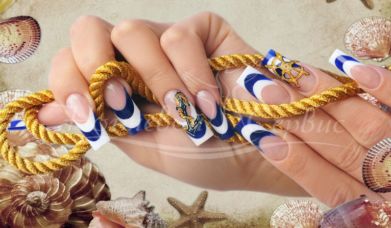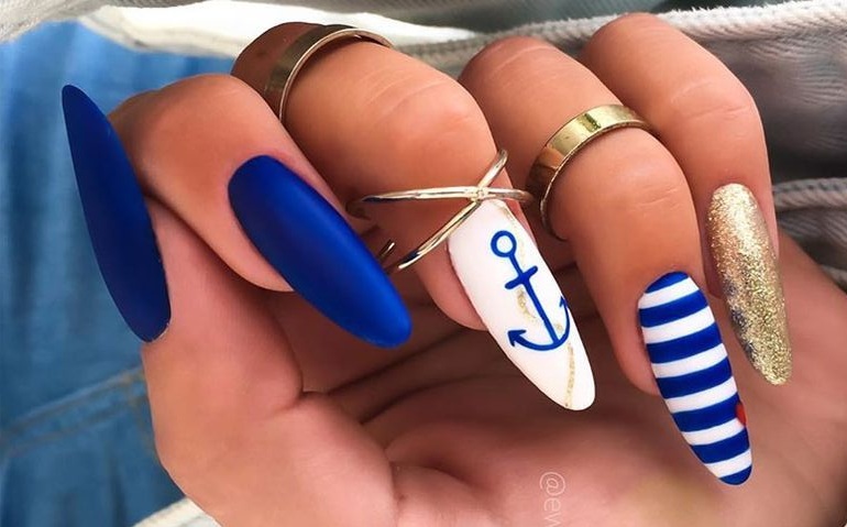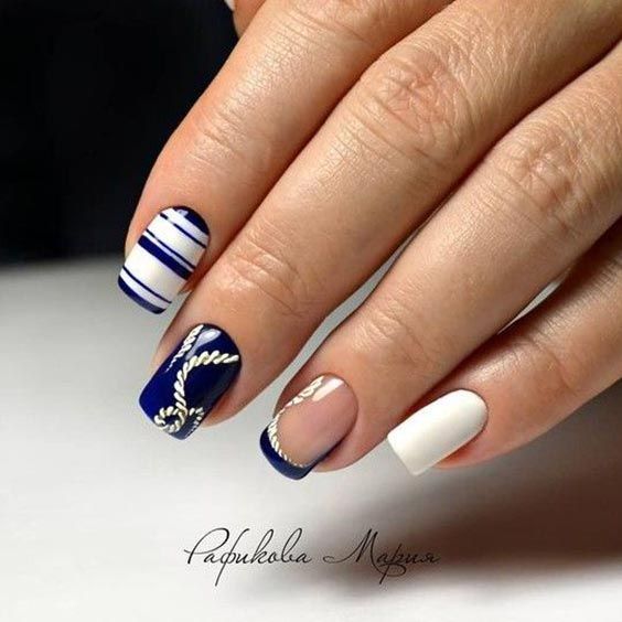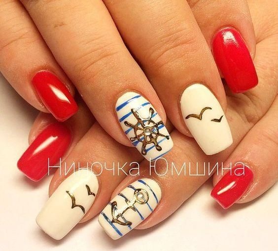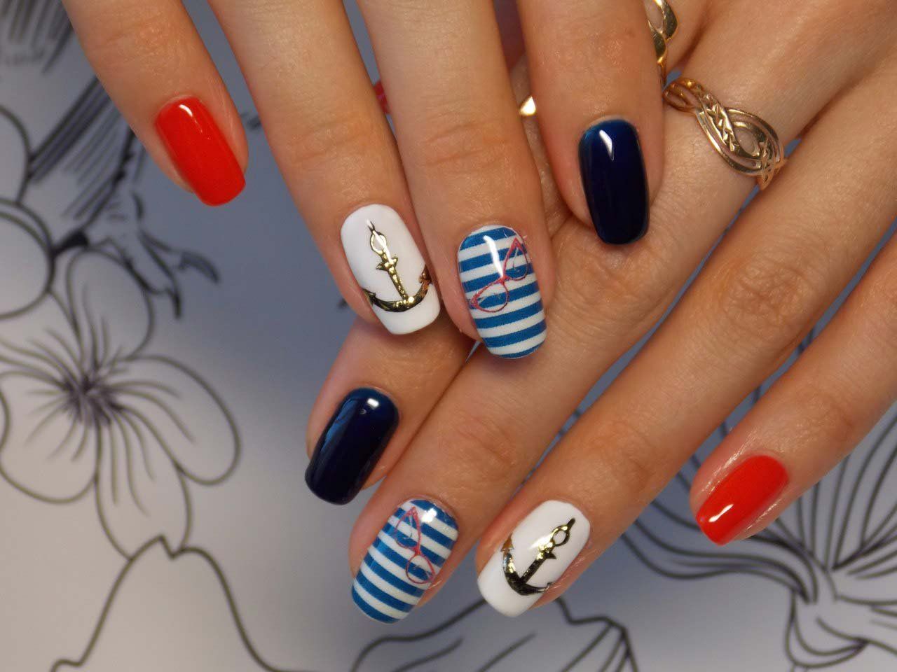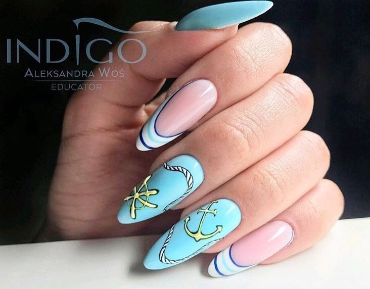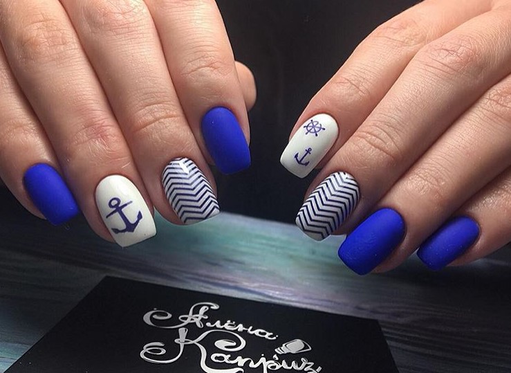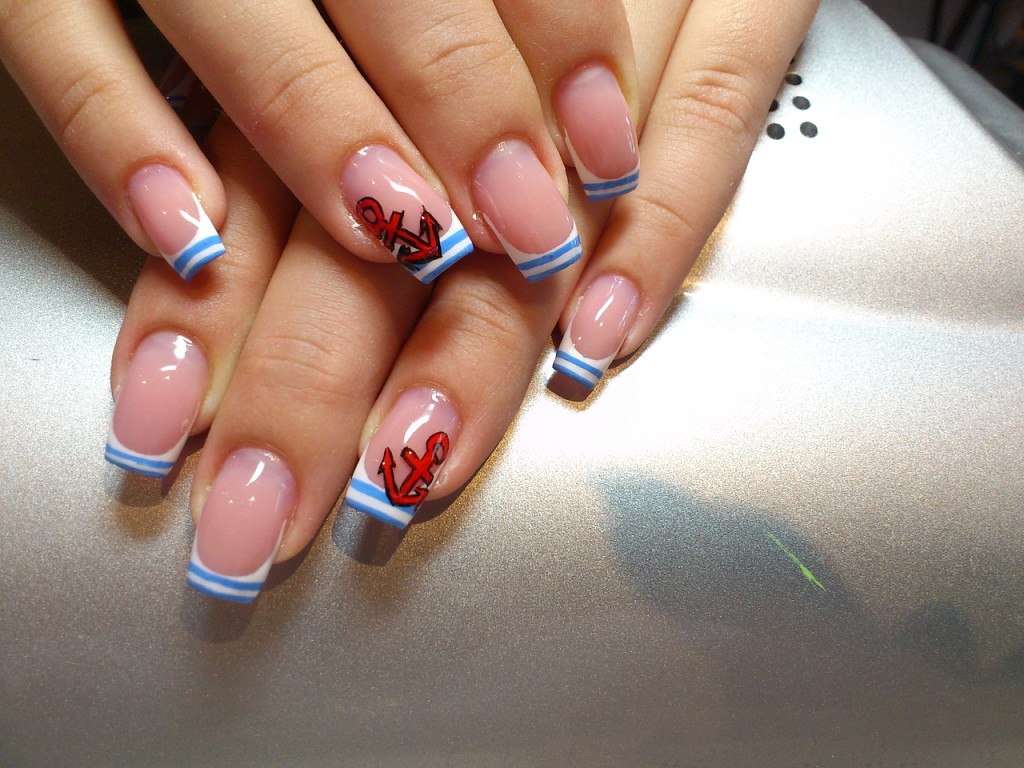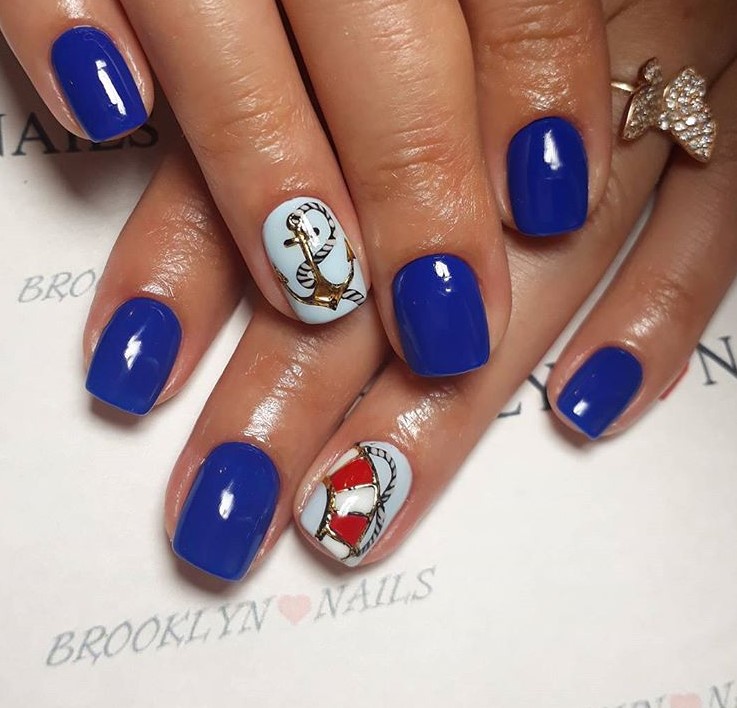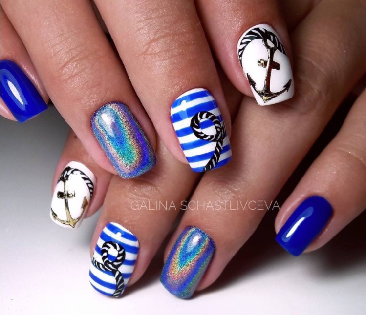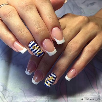 Теперь поговорим более подробно о том, с какими техниками и вариантами дизайна можно сочетать рисунок в морском стиле. Без преувеличения можно сказать, что здесь открывается целое море возможностей. Но, конечно же, есть наиболее актуальные для сезона варианты.