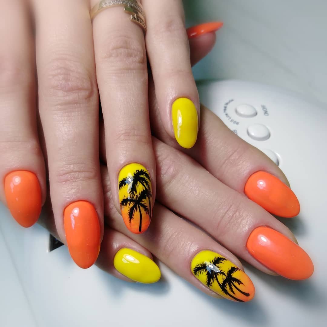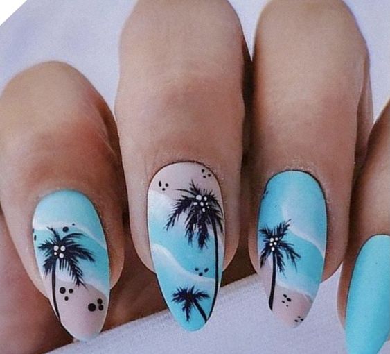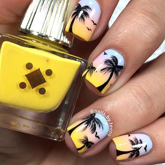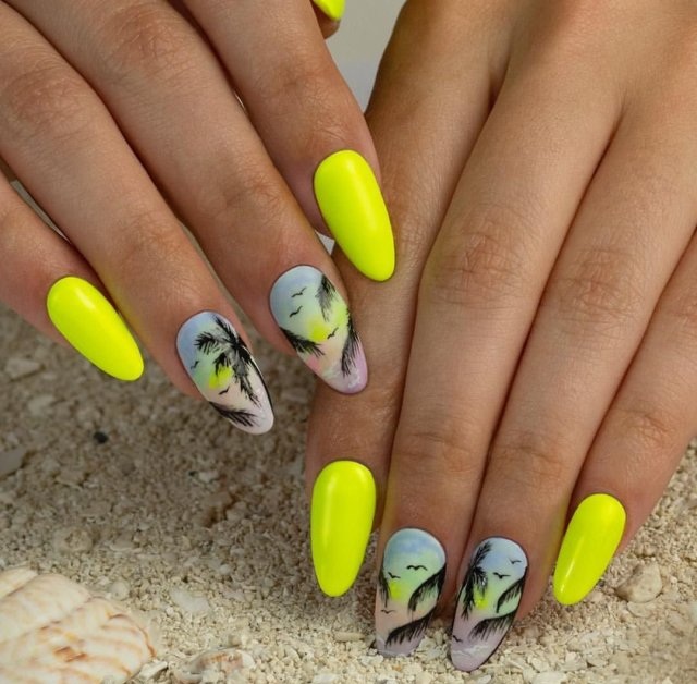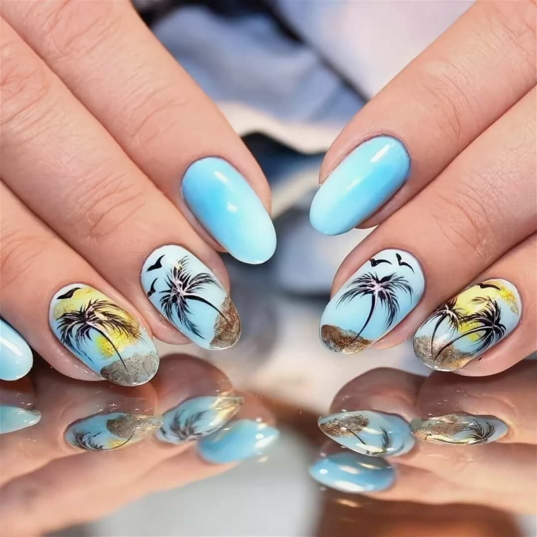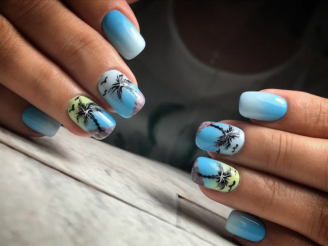 Разве можно представить себе отдых на морском побережье без пальм и яркого солнца? Конечно, нет. Если только вы не решили отдать предпочтение экстремальному отдыху и отправились любоваться на холодные моря севера. Красивые пальмы, нежный песок и морская волна — стильный и актуальный дизайн ногтей готов.