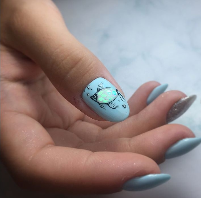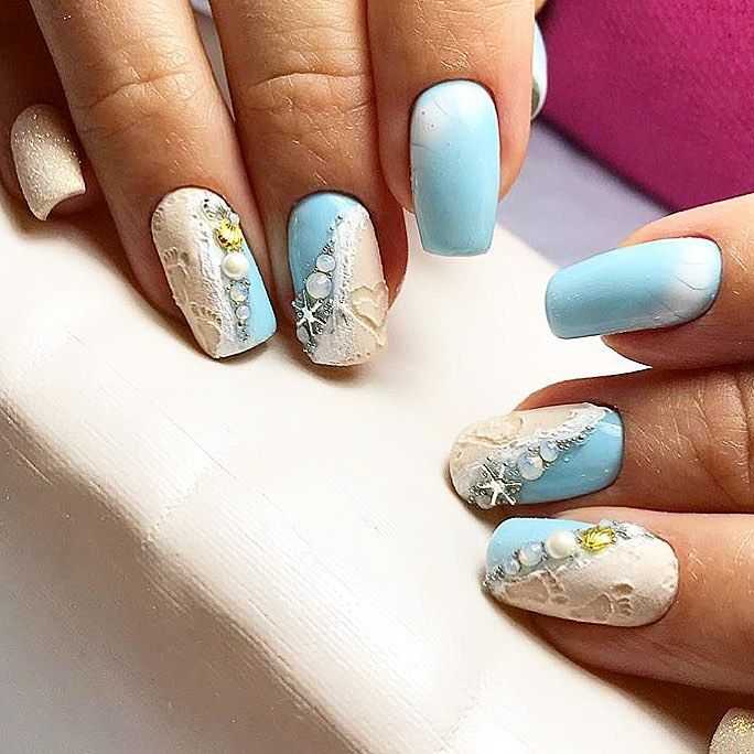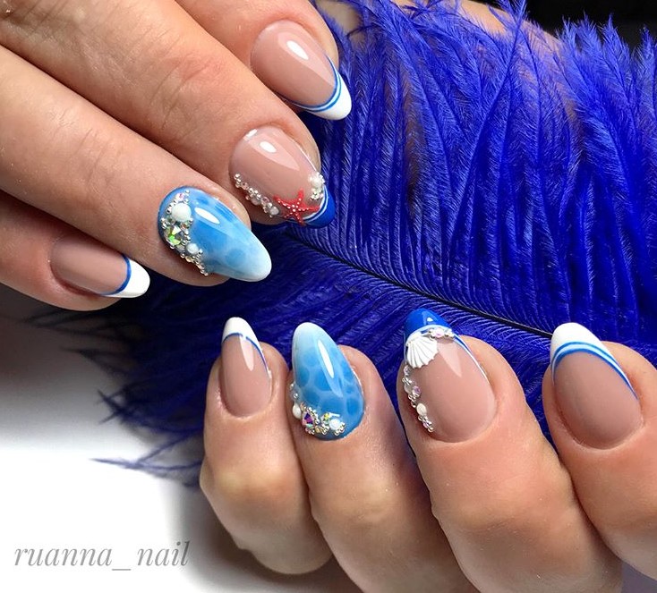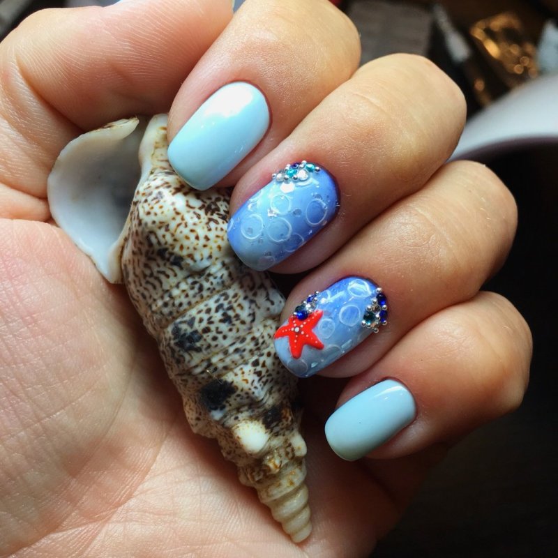 - универсальность. Маникюр с морем сможет подружиться почти с любой другой техникой маникюра. Морской дизайн можно сочетать с френчем, блестками и стразами, фольгой, техникой омбре или матовой текстурой. Все самые популярные у нынешних модниц техники могут дополнять этот популярный мотив.