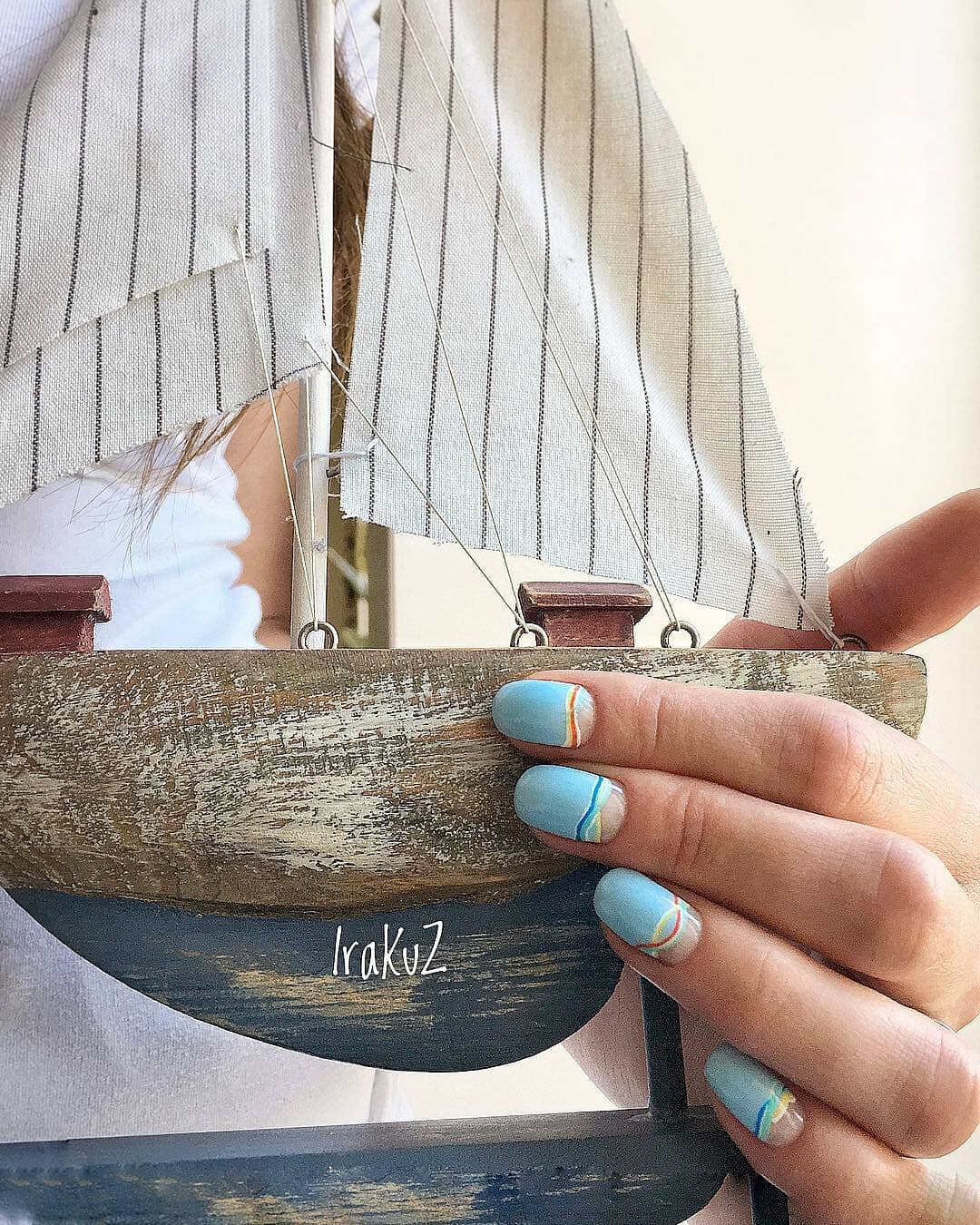 - адаптивность. Если вам кажется, что маникюр с морем можно вписать исключительно в расслабленный образ для отдыха, вы ошибаетесь. Все дело в том, что строгих правил при создании такого дизайна нет. Поэтому вы можете спокойно добавить морской маникюр в ваш повседневный и даже офисный образ. Просто сделайте небольшой намек на море — волны могут быть разными. У вас останется напоминанием о близком или прошедшем отпуске, но при этом дизайн ногтей хорошо впишется в строгий образ и на работе не возникнет никаких проблем;