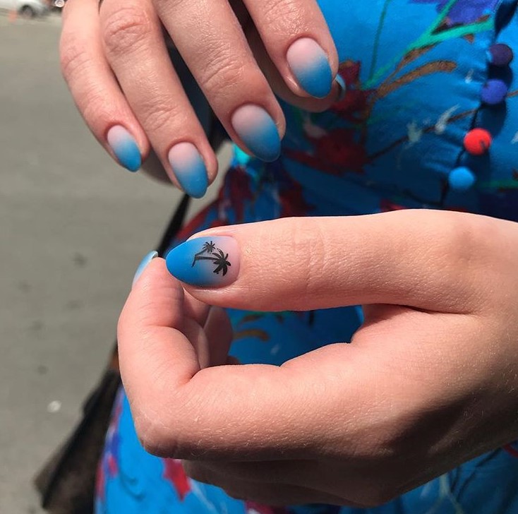 Кто сказал, что маникюр с морем должен быть очень ярким и разнообразным. Да, конечно, летний дизайн — это яркие ногти, которые украшает максимум декора. Но такой стиль соседствует с прямо противоположным направлением — минимализмом. Отлично смотрится матовое омбре в качестве базы и схематичные рисунки морских волн, пальм и других атрибутов пляжного отдыха.