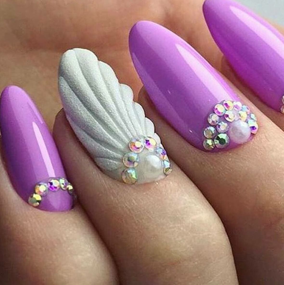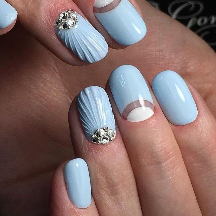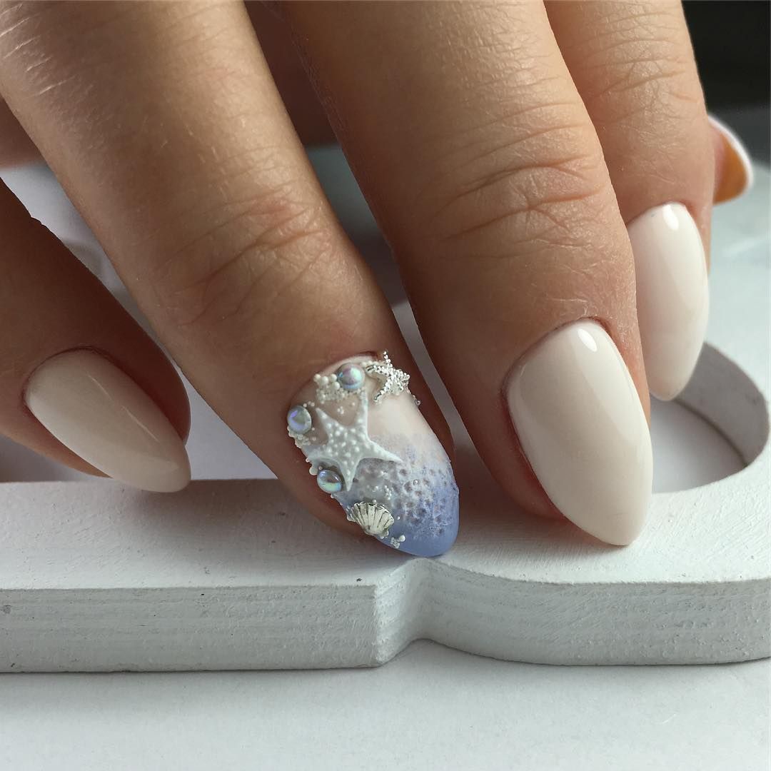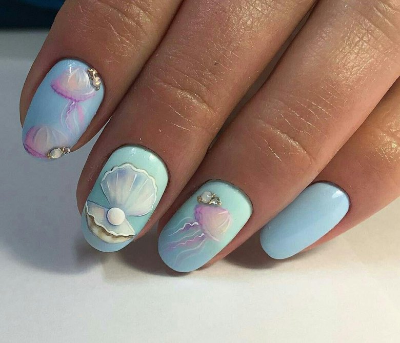 Совет: если решили использовать для декора стразы, обратите внимание на камни Синджу. Эти маленькие жемчужинки больше подходят для маникюра с морем, чем обычные стразы. Они словно недавно лежали в ракушке на морском дне и вот уже оказались на ваших пальчиках.