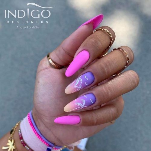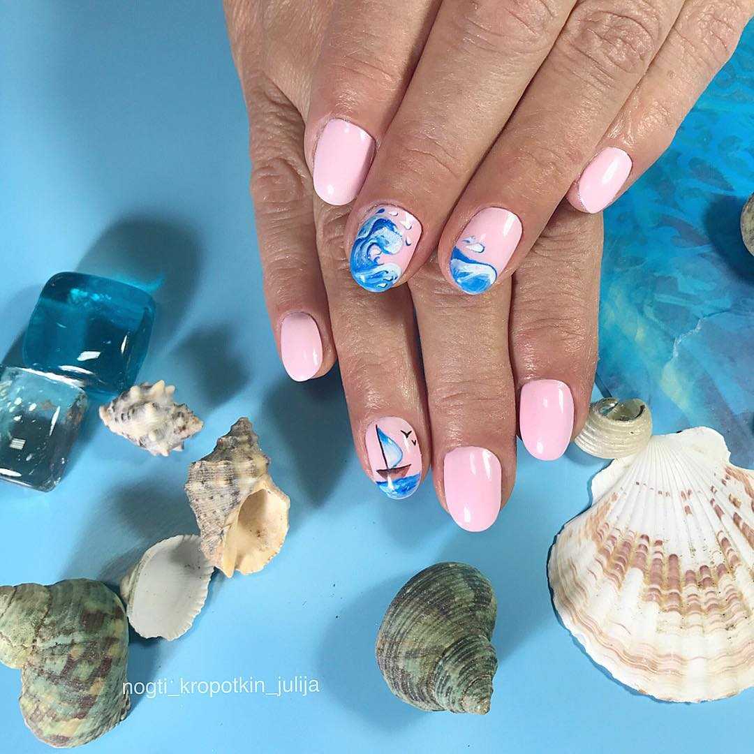 Палитра розового — хорошее решение для модниц, которые обожают создавать романтичные образы. База может быть розовой и, например, неоновой. Это отличный прием. если вы находитесь на отдыхе и обожаете вечерние прогулки по пляжу. Ваш маникюр будет загадочно светиться в ночи и привлекать внимание. Кстати, розовый можно выбрать для создания более объемного вида морских волн. Не забывайте о том, что на закате они загадочно подсвечиваются именно этим оттенком.
