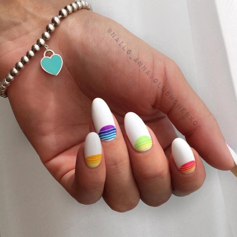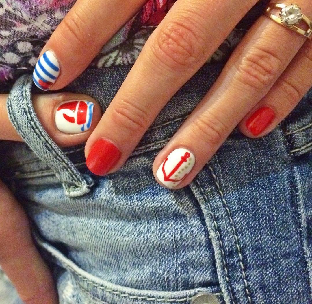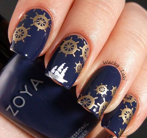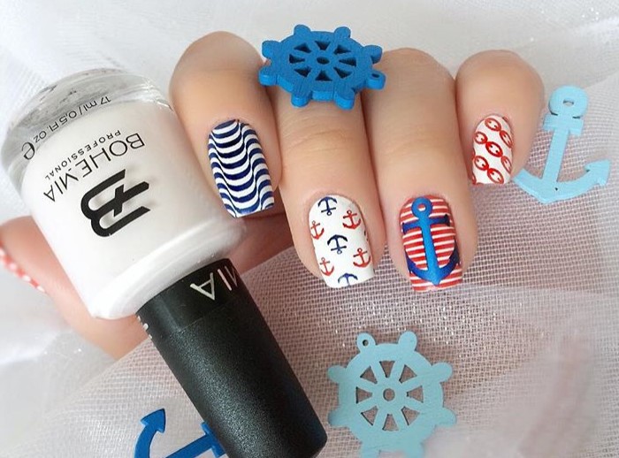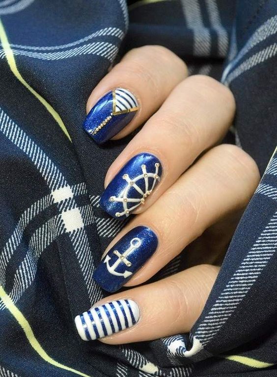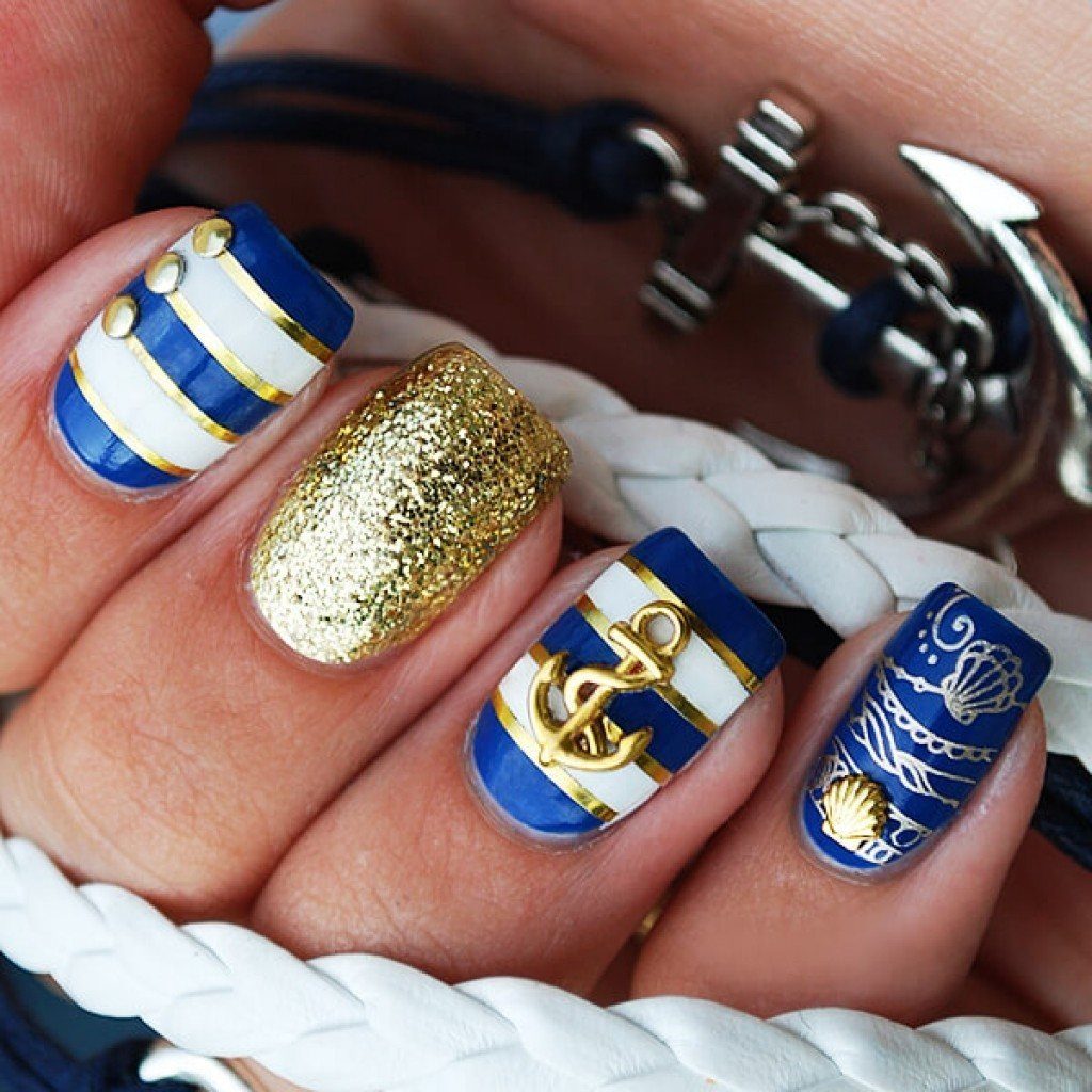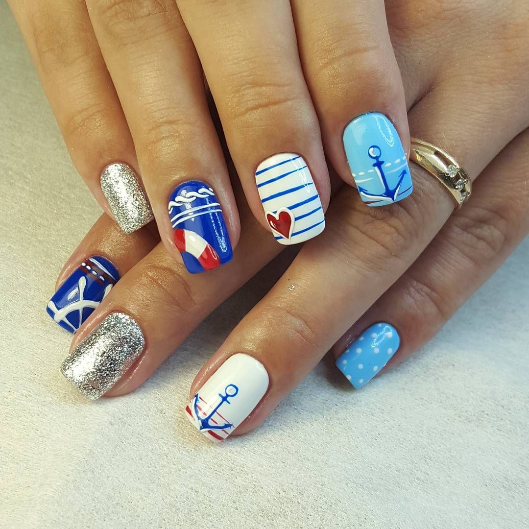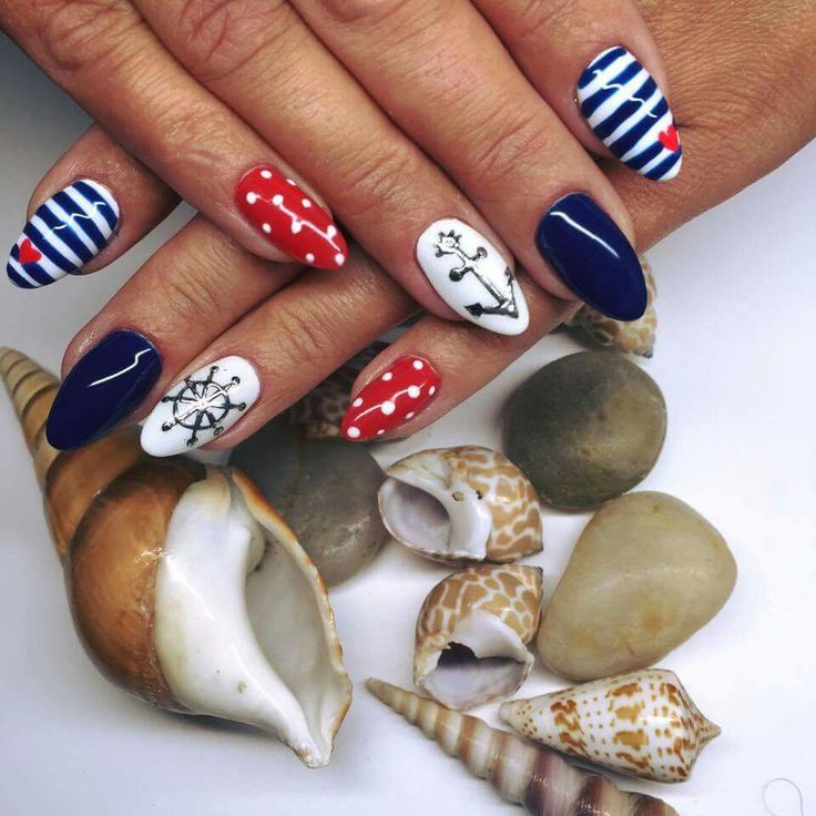 Чем дополнить рисунок моря на ногтях? Классика — морская тематика с полосками, якорями, спасательными кругами и горошком. Все ноготки вы можете оформить в разном стиле, а роль моря выполнит полосатый ноготок. Ведь волны не обязательно должны быть реалистичными.