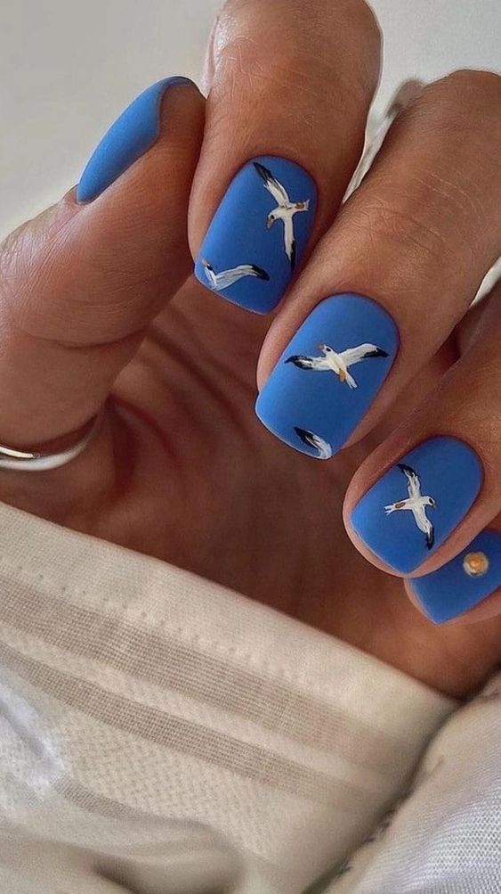 - Рисуем чаек. При желании вы можете дополнить маникюр с морем чайками — для этого нам понадобится кисточка волосок и черная тушь лайнер. Птиц рисовать просто — размашистые галочки.