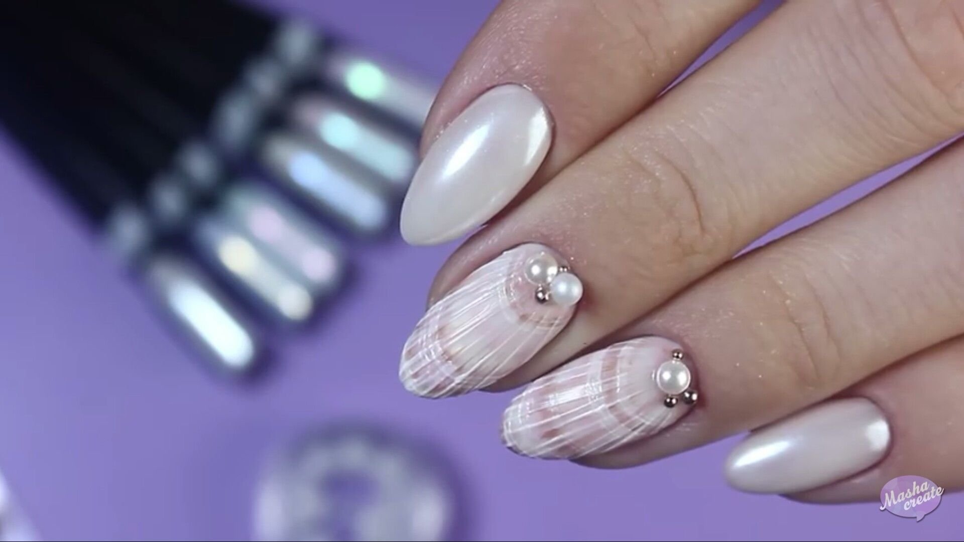 Предлагаем вам немного отойти от традиций рисования моря на ногтях и сделать жемчужный маникюр. Используйте жемчужную втирку, а волны оформите в технике «ракушка». Такой маникюр отлично смотрится с любым летним нарядом. В качестве базового оттенка рекомендуем выбрать пастельный. Например, голубой, мятный или нежный розовый. Имитация ракушки может быть также в приглушенном матовом исполнении, что более уместно для повседневного морского нейл-дизайна на лето.