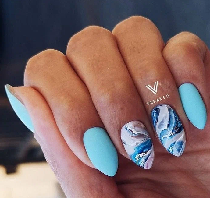 Если решили сделать маникюр с морем, обязательно обратите внимание на эту текстуру. Матовый топ придает любому оттенку более глубокий и загадочный вид. вы увидите как изменится, например, цвет морской волны, если закроете его матовым топом. Кроме того, на такой базе гораздо лучше смотрится блестящий дизайн. Например, серебристые или золотые волны, рисунок якоря или нежной рыбки.