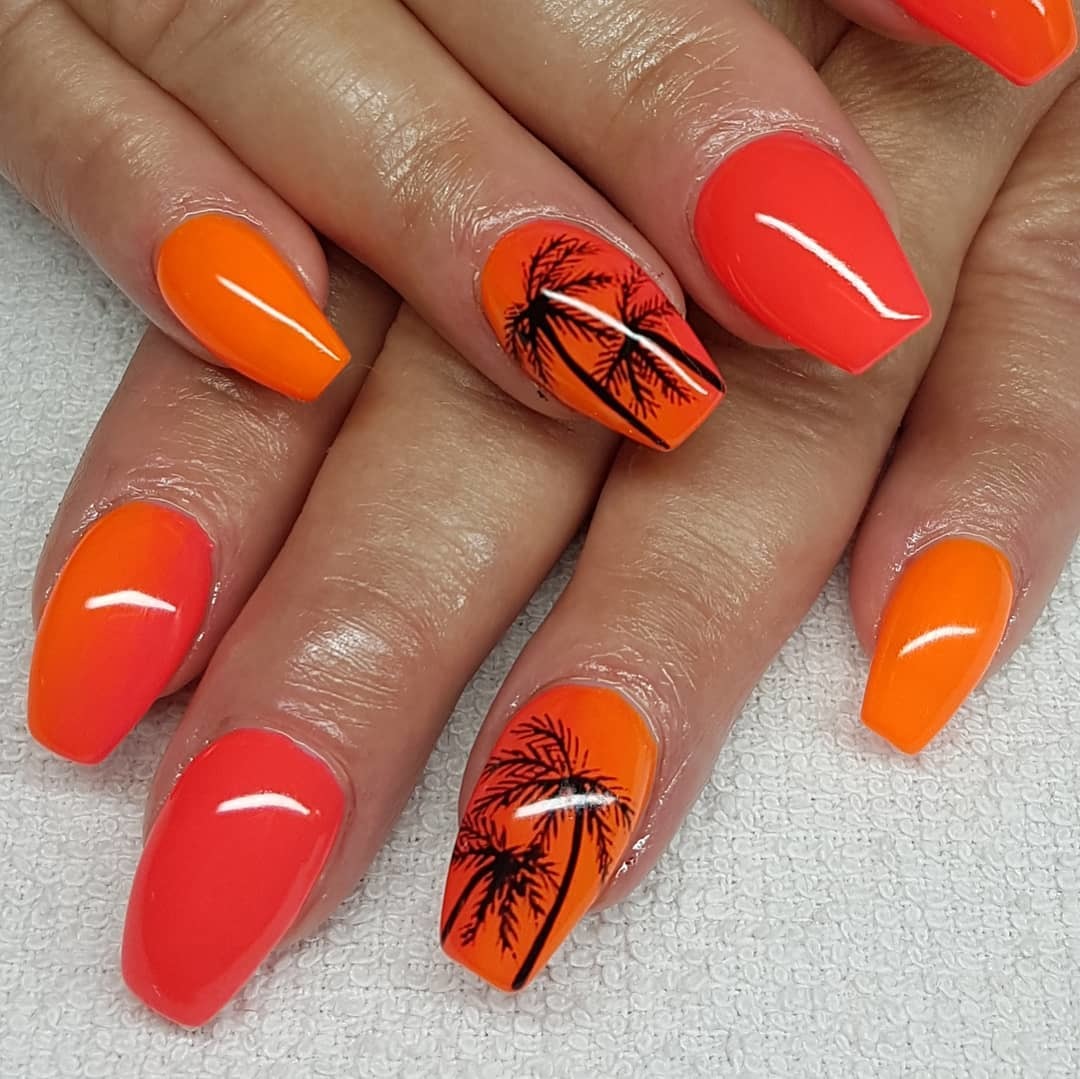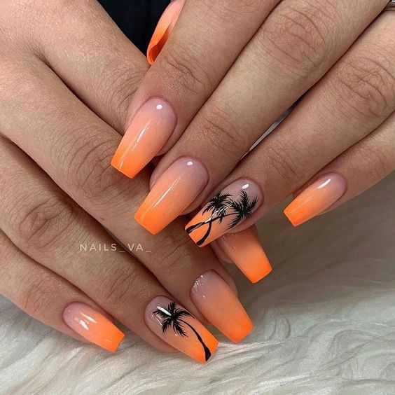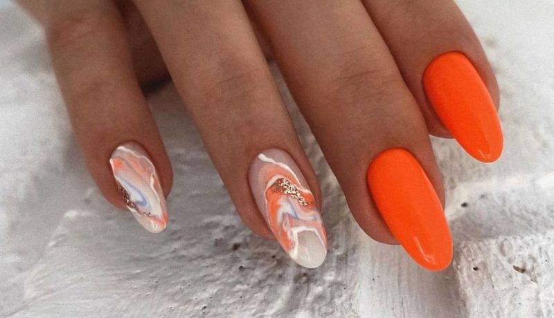 Оранжевые оттенки летом востребованы как никогда. Это солнце, экзотические фрукты и яркий песок. Конечно, последний может быть самых разных оттенков — от белого до практически красного, но чаще всего используют песочно-оранжевый. Для создания эффекта песка в маникюре с морем можно использовать акриловую пудру. Так у вас получится маникюр с пляжем и морем — один из актуальных в этом сезоне.