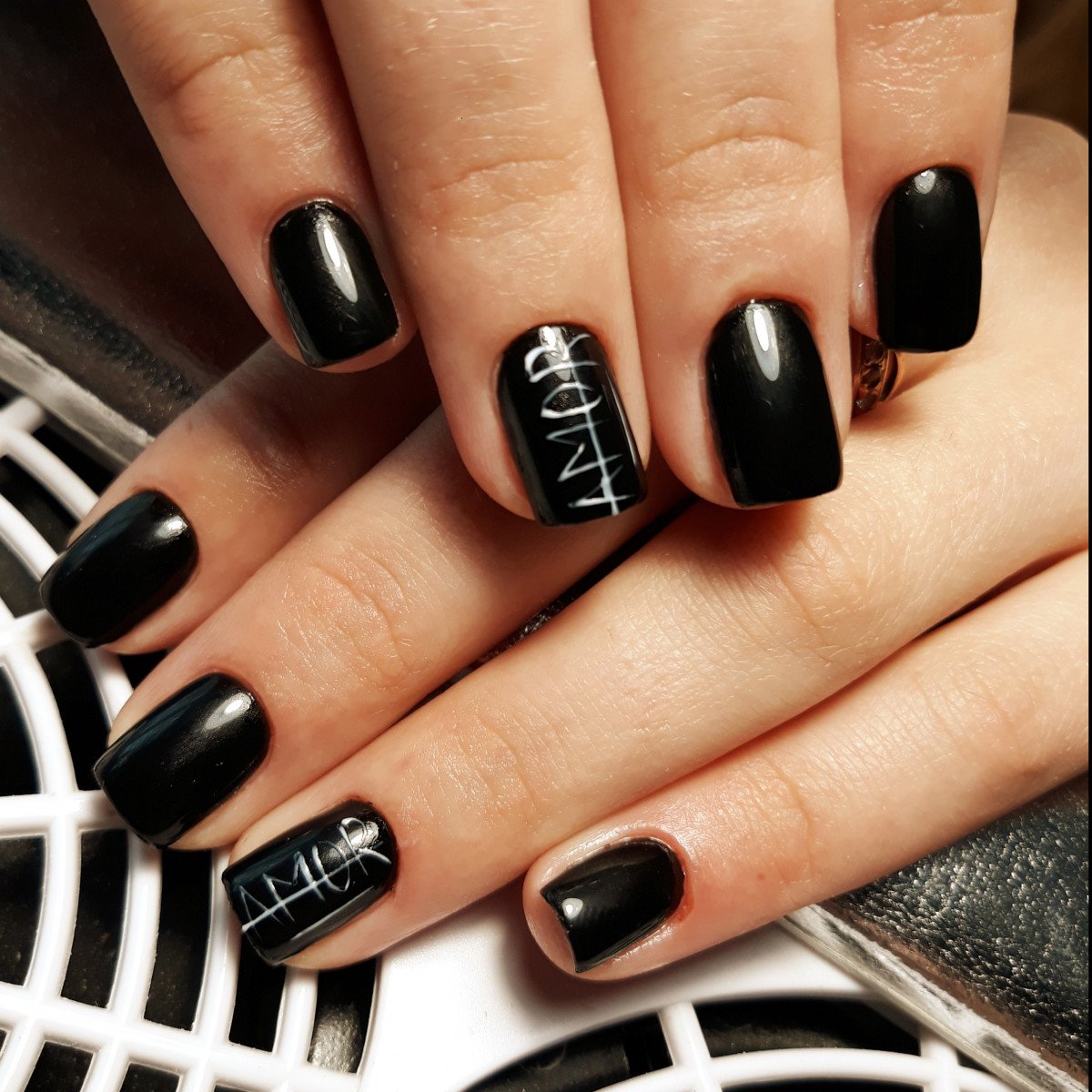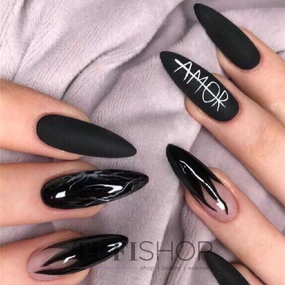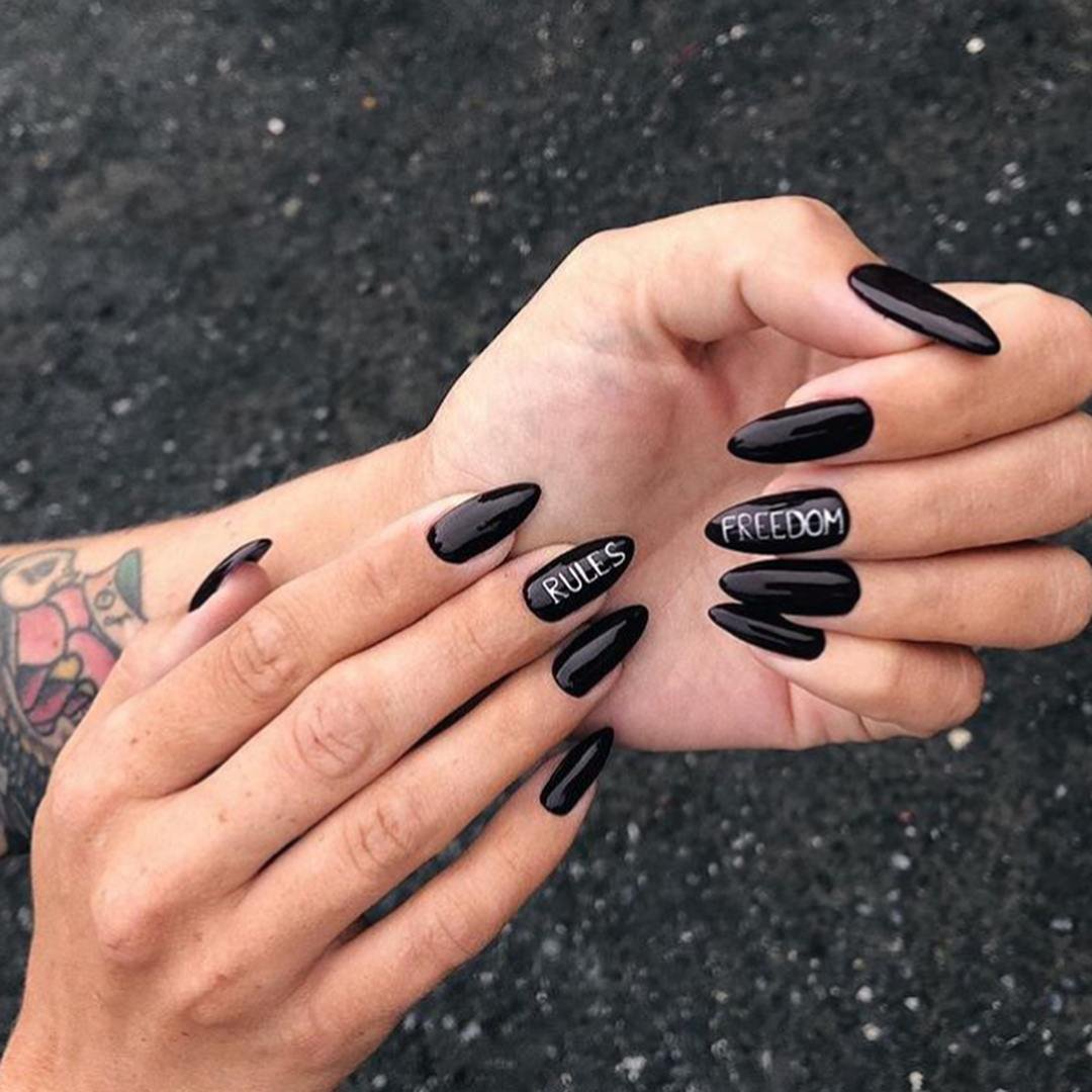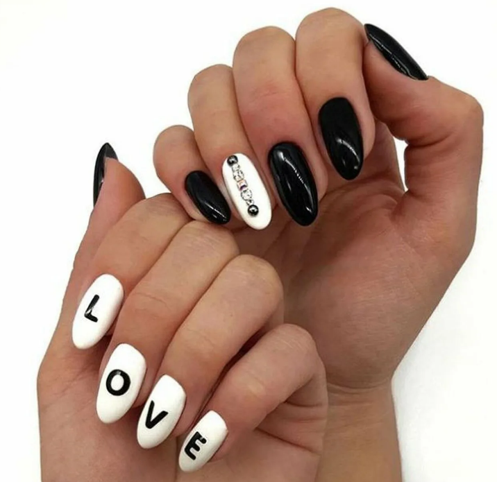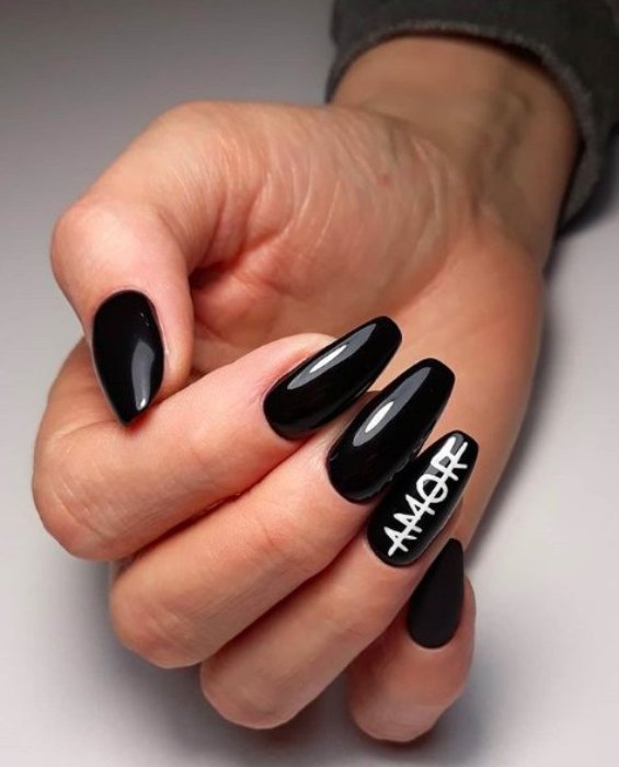 Черный маникюр — смело и модно. Он универсален и отлично подходит как под базовые джинсы, так и офисный образ. Хотите сделать его менее мрачным? Добавьте надпись — дату, буквы или слово. Выбирайте контрастный лак — белый, серебряный, золотой или другой цветной. Отметим, что слово может размещаться не на одном ногте. Вы можете разнести его по пластинам — по буквам, слогам.
