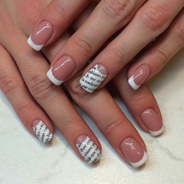 Нюдовый маникюр — спокойная нежная классика. Разбавить ее поможет газетный дизайн или любимые фразы. Просто нанесите их контрастным лаком с помощью слайдера или стемпинга. Можете сделать дизайн более ярким — добавить пару небольших страз, фольги или рисунок.