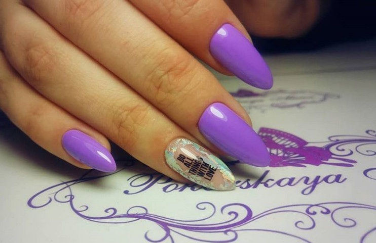 Миндаль — женственно и нежно. Рекомендуем дополнять такую форму ногтей мотивирующими надписями или такими, которые отлично впишутся в общий дизайн. Отлично смотрится нежный маникюр с рисунками цветов, под которыми есть надпись об их названии. Еще один вариант — газетный маникюр. Не решили что лучше написать? используйте «газетные» полосы.