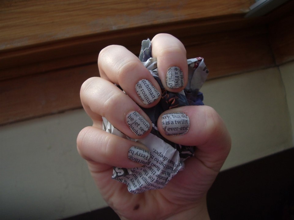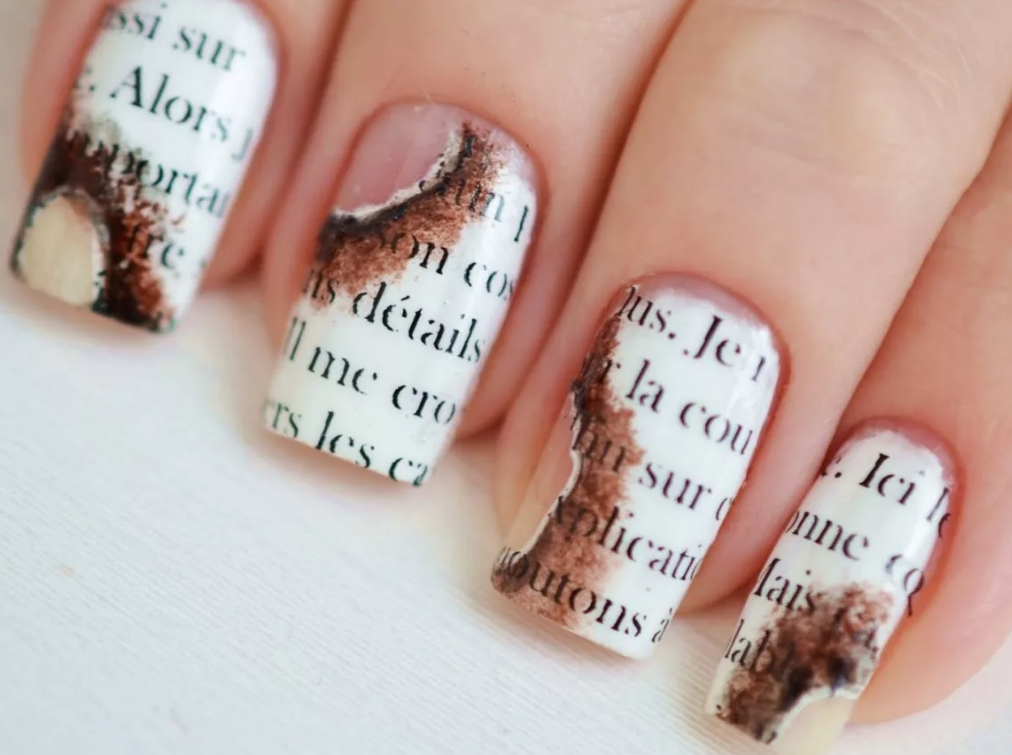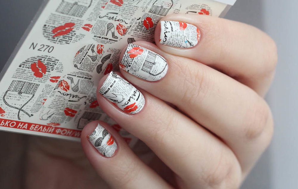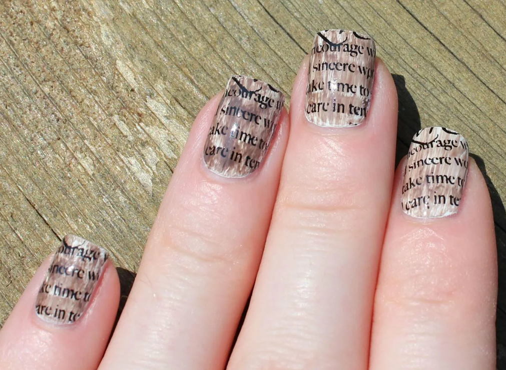 Маникюр с надписями в газетном стиле можно сделать с помощью наклейки-слайдера. Другой вариант — обычная газета. Как делать: