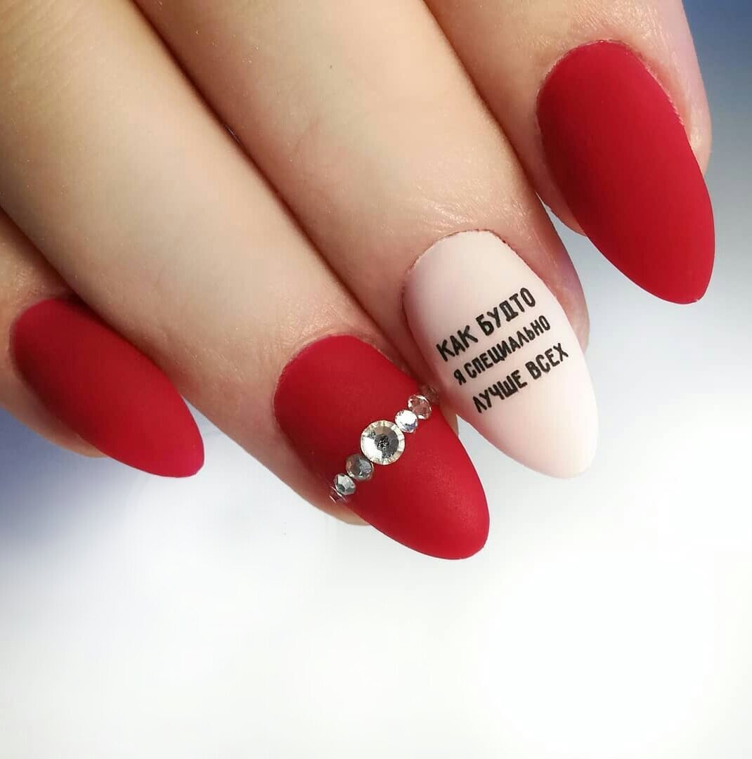 Красный лак — страстный и самодостаточный. Но иногда хочется дополнить такой маникюр небольшой изюминкой. ею может стать надпись. если хотите сделать ее максимально заметной, наносить поверх основного покрытия, а для букв выбирайте контрастный оттенок.