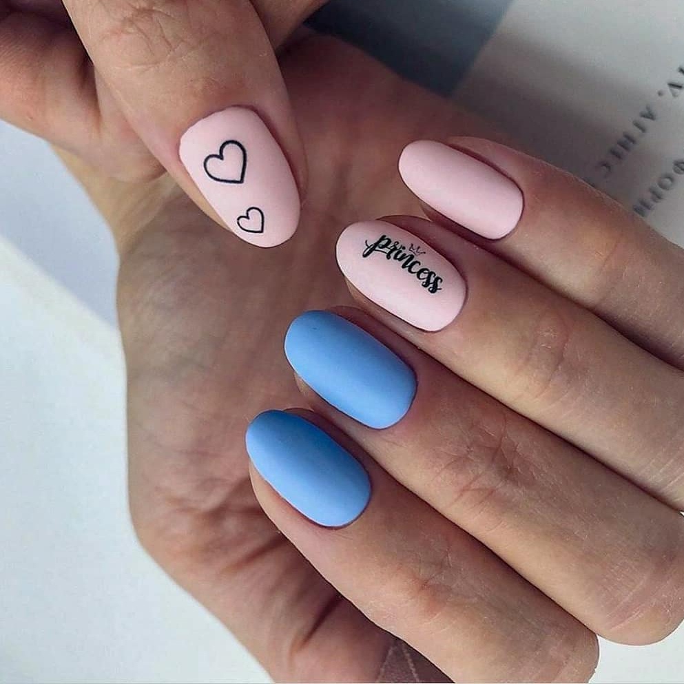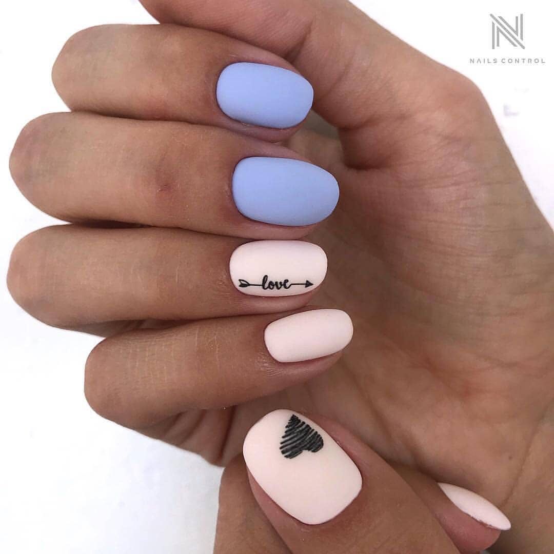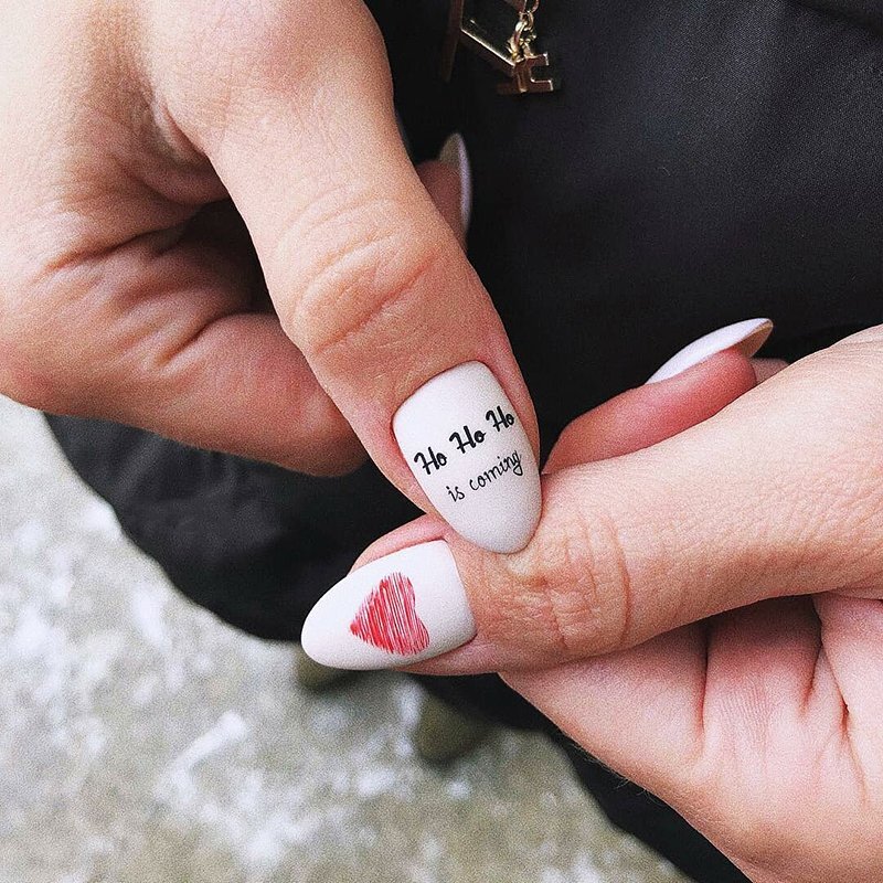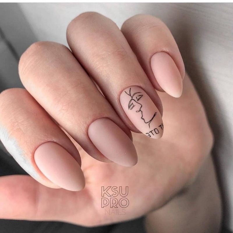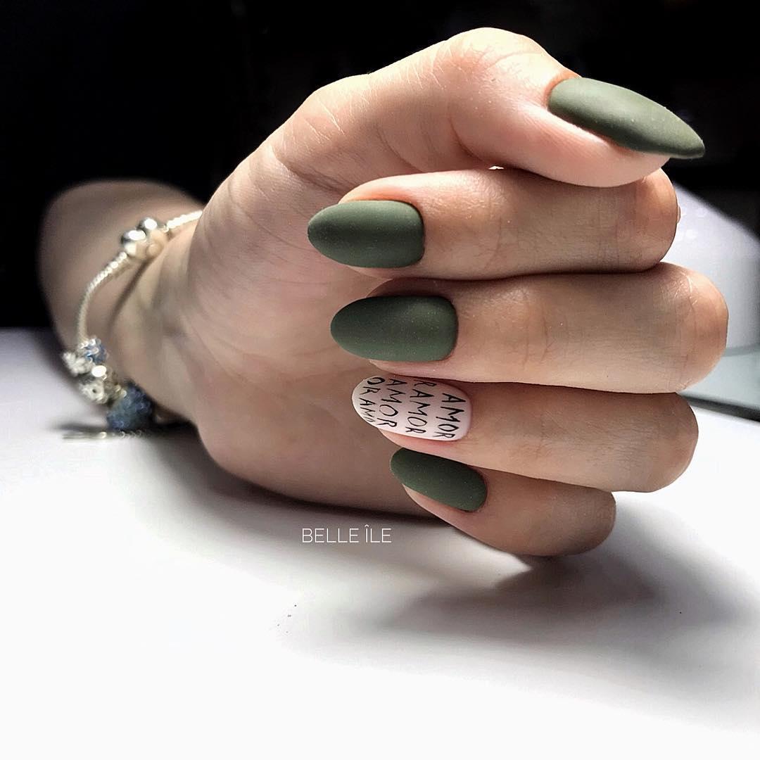 Матовый маникюр — несомненный тренд. На такой базе цифры, буквы и целые выражения будут выглядеть очень стильно и заметно. Глянцевое покрытие часто бликует и не дает передать общий смысл фразы.
