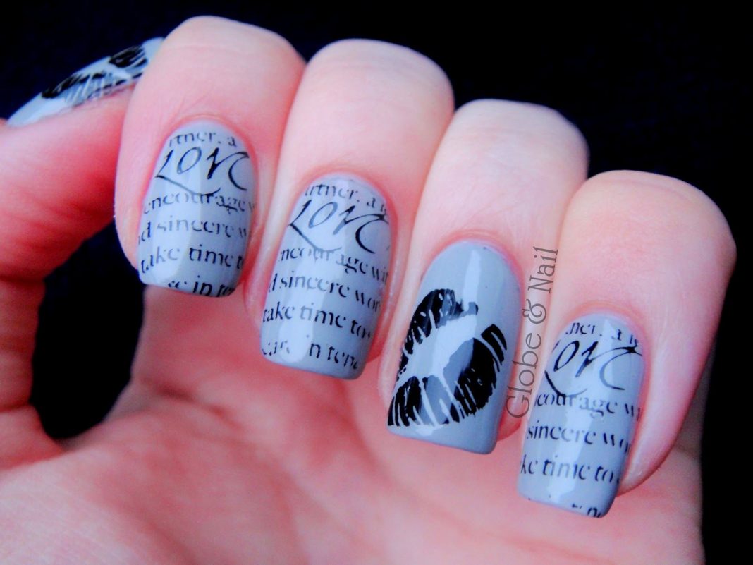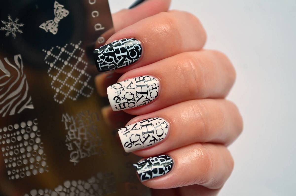 Стемпинг — еще один вариант дизайна, позволяющий создать потрясающий маникюр с надписями за пару минут. Причем сделать это можно самостоятельно. Но придется приобрести дополнительные аксессуары: специальные пластины, штампы и др.