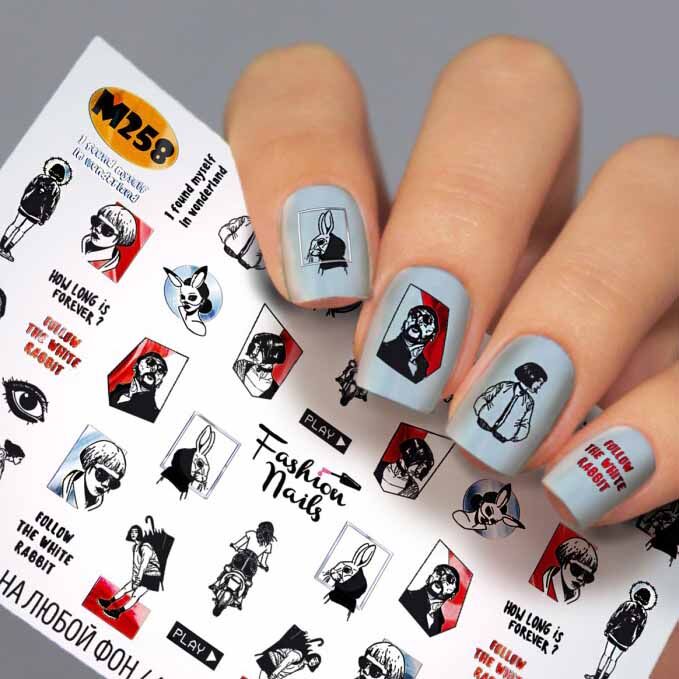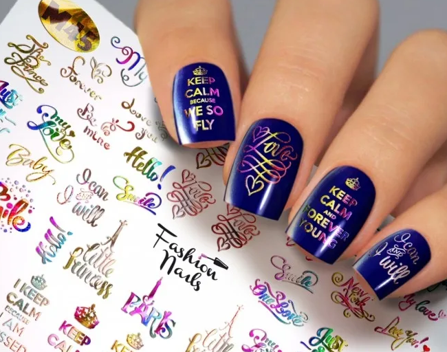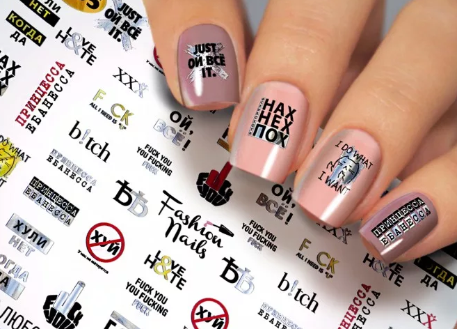 Со временем мода на надписи в маникюре трансформировалась и появились надписи на русском и других языках. Часто они носили провокационный характер или были, например, нецензурными. Затем стало можно использовать в маникюре смешные или мотивационных надписи.
