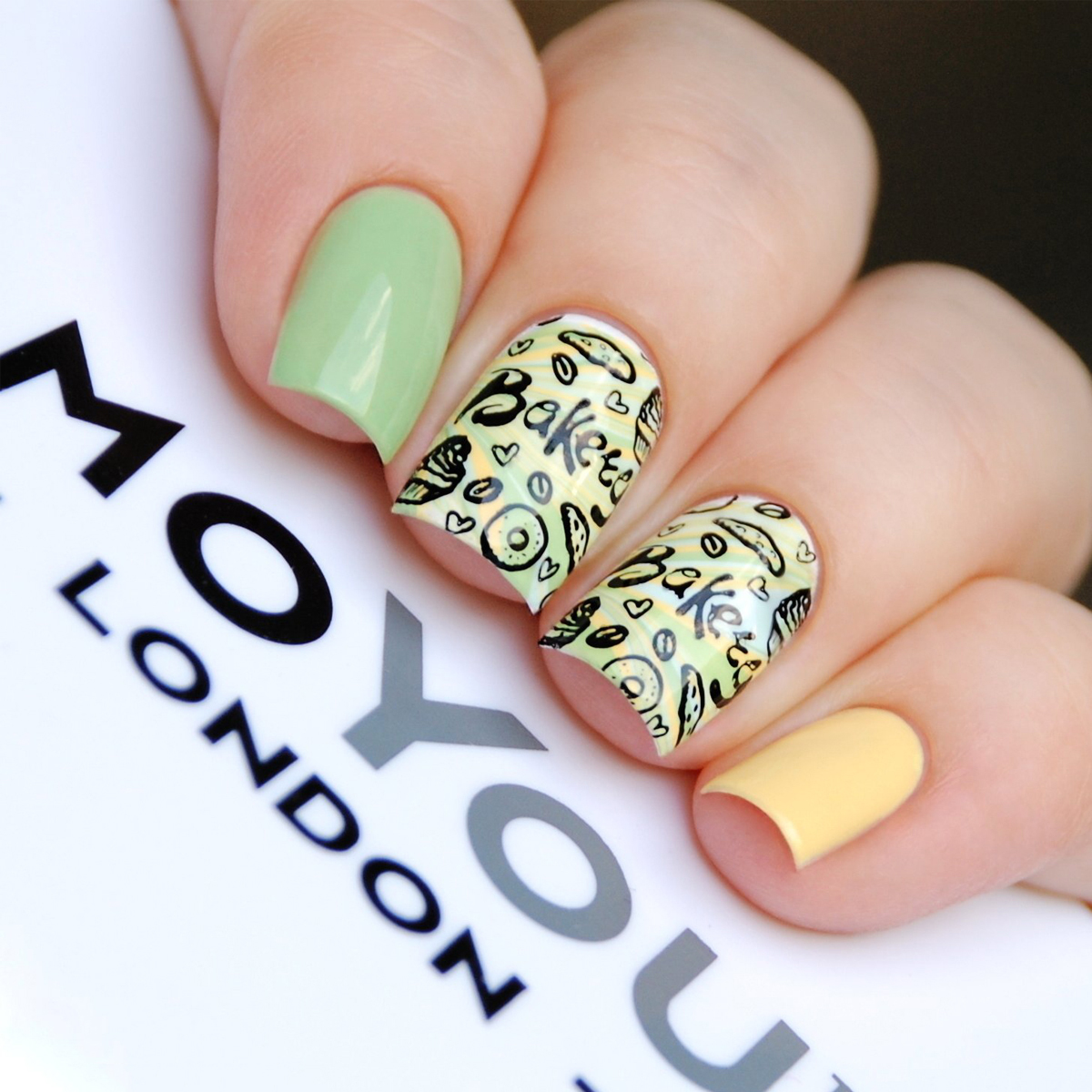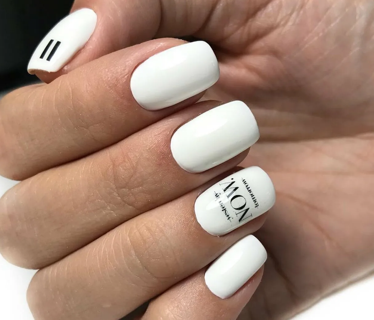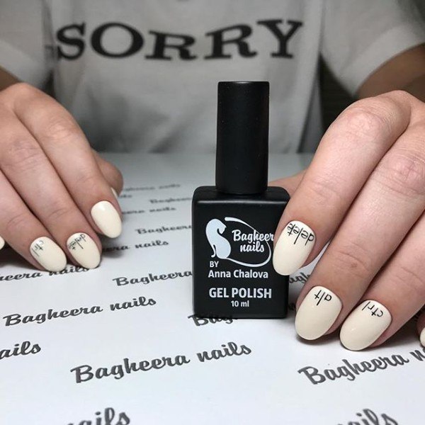 Черные буквы на белом или молочном фоне — классическое монохромное сочетание. Но не стоит замыкаться на нем. Если выбрать для букв цветной лак, дизайн станет более смелым и интересным.