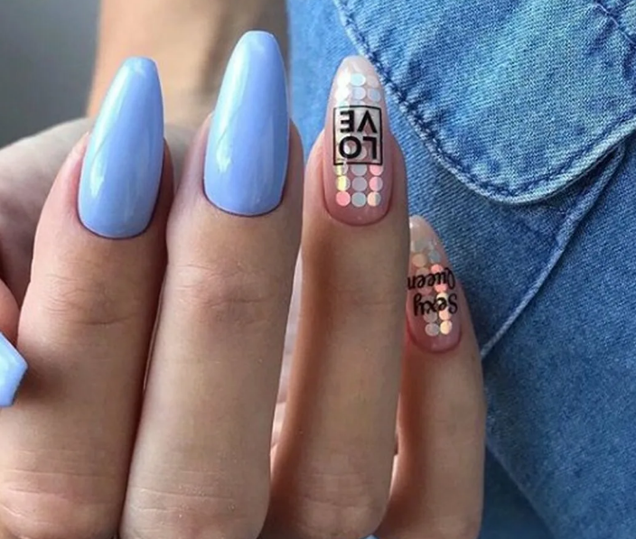 Маникюр с надписями на ногтях по форме и длине ногтей