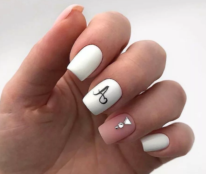 - классический вариант французского маникюра с нюдовой базой. При этом вместо надписи используем одиночные контрастные буквы — на каждом пальчике по одной;