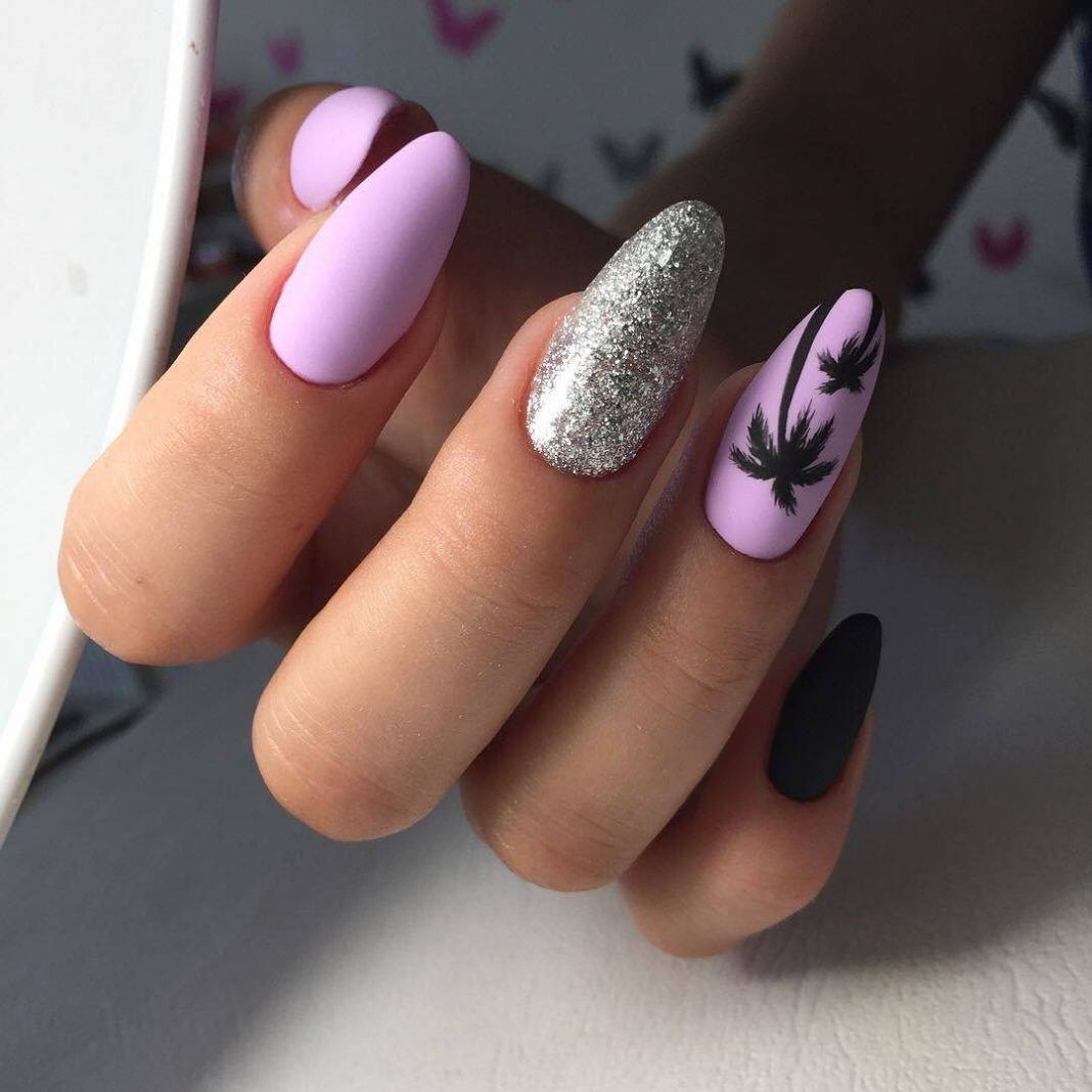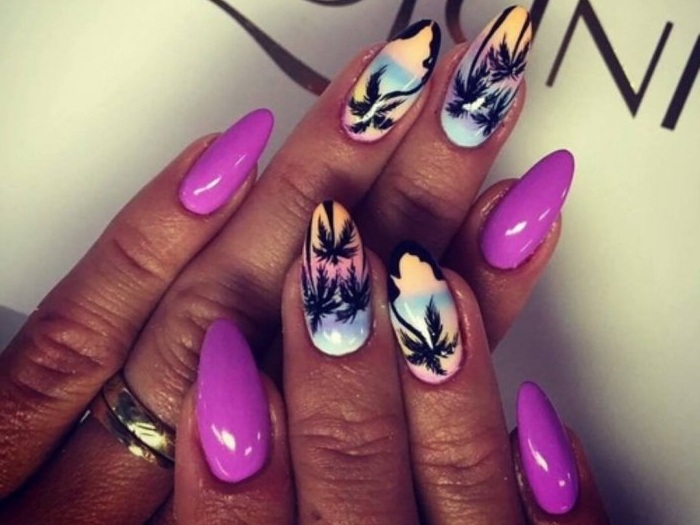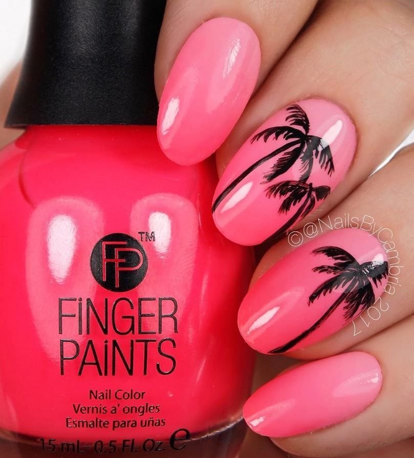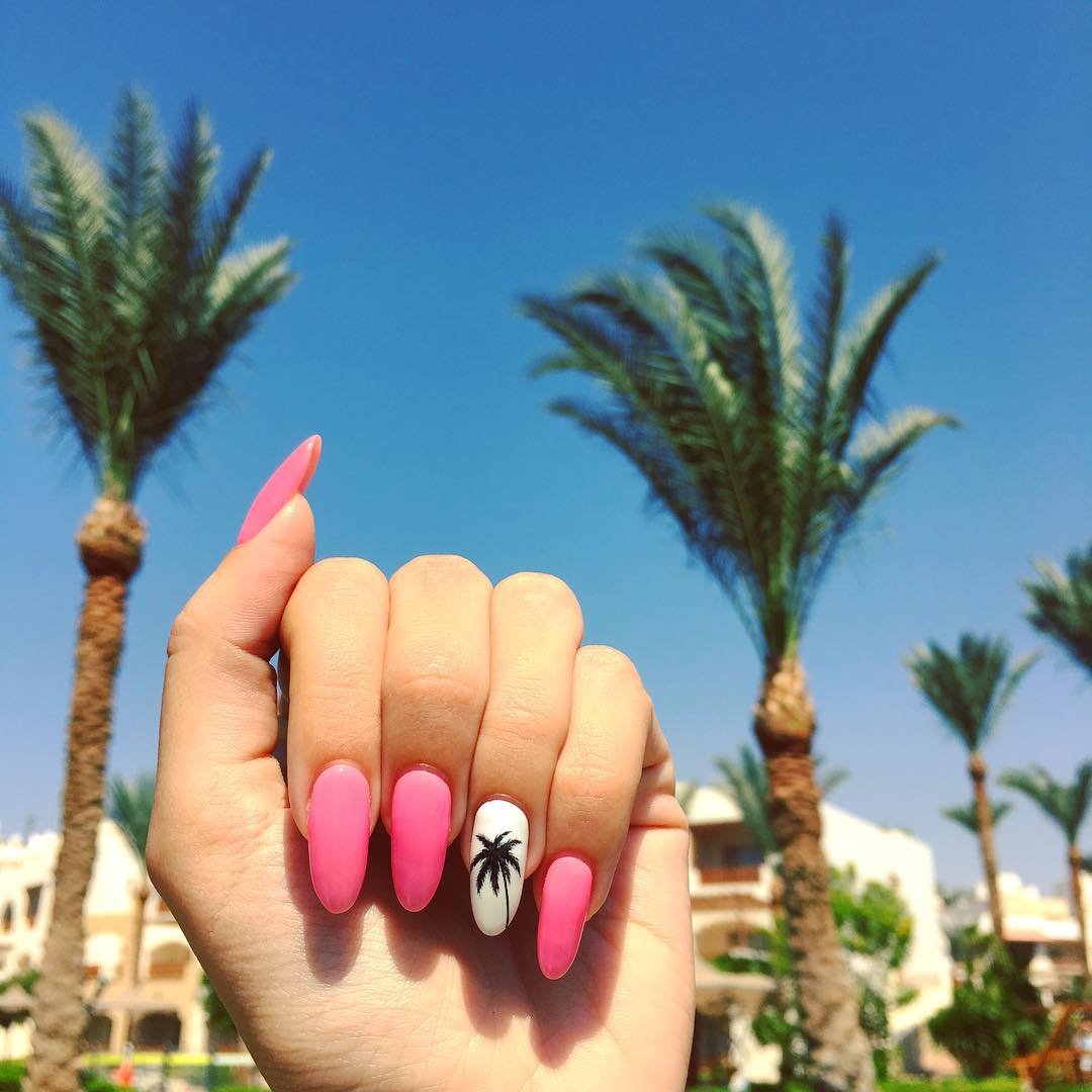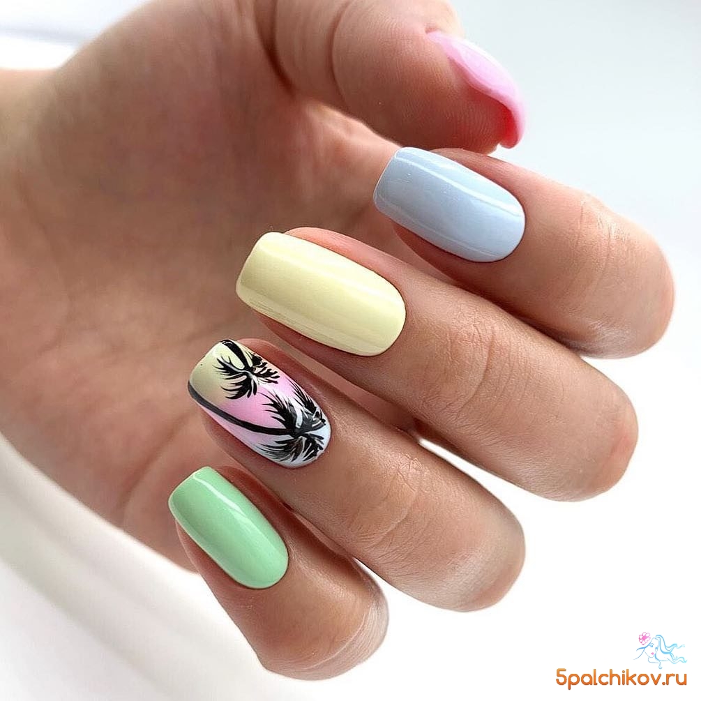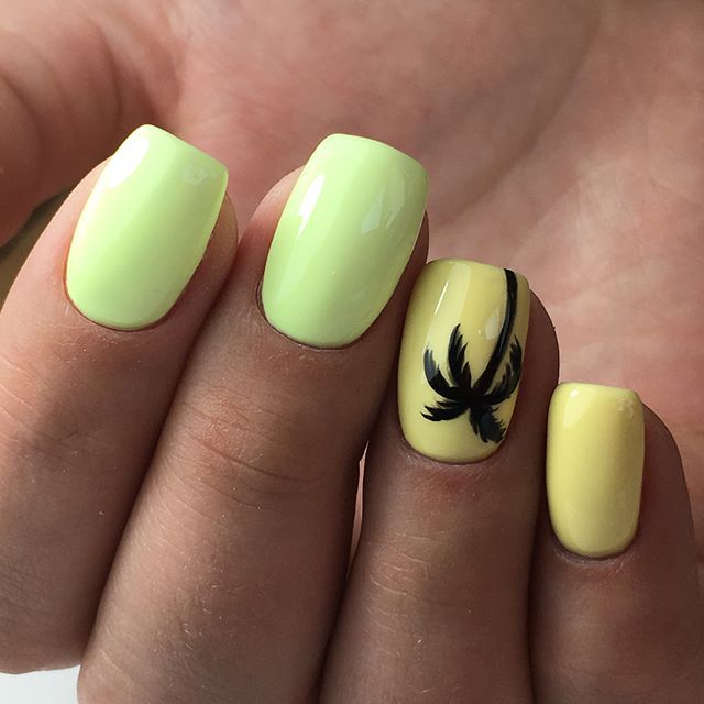 Стильно и интересно смотрится рисунок пальм на однотонном фоне. Какой оттенок выбрать? Тот, что подходит вам по цветотипу кожи или к летним нарядам. Если учесть, что пальма все же летний рисунок, для маникюра стоит выбирать яркие или пастельные оттенки. В этом сезоне особенно востребованными являются мятный, сиреневый или лавандовый, желтый, розовый, нюдовый, а также неоновые оттенки лаков.