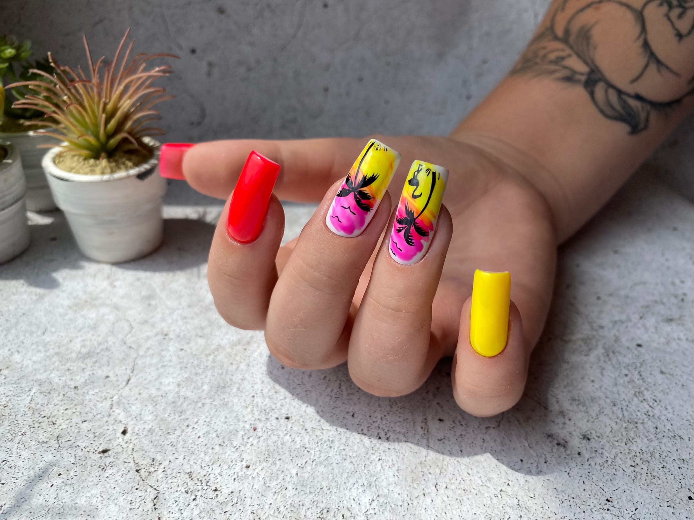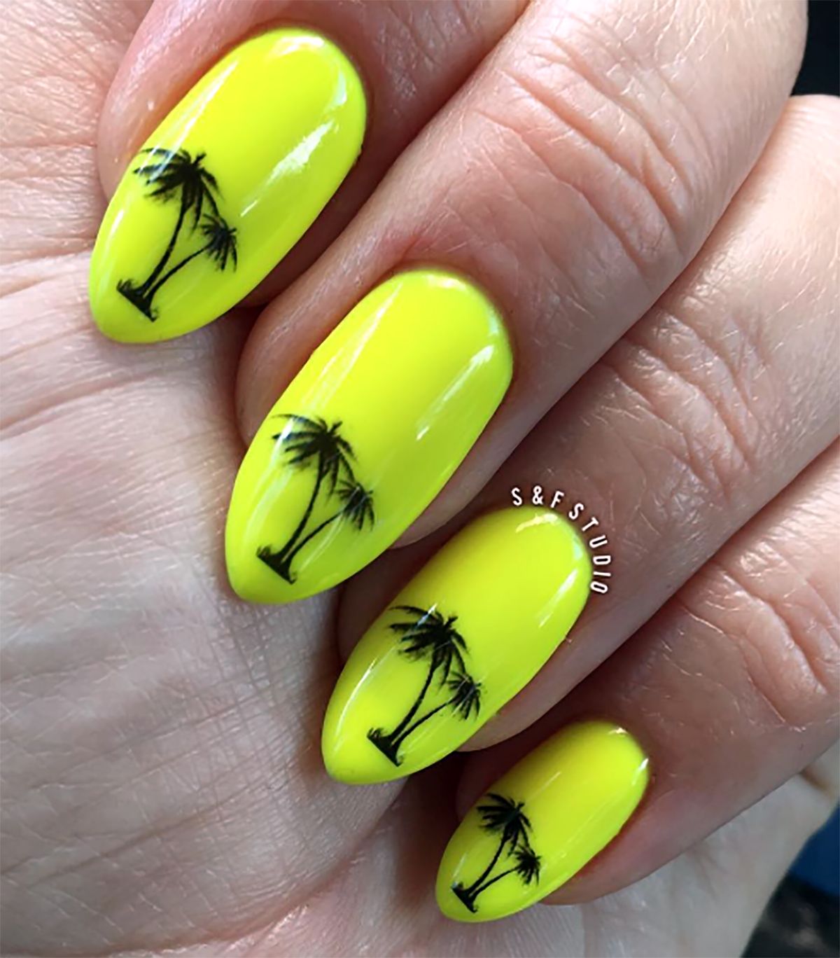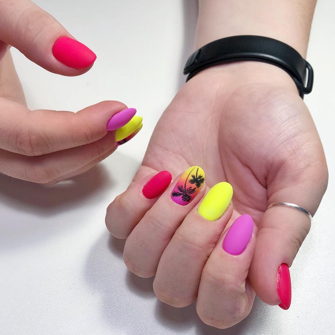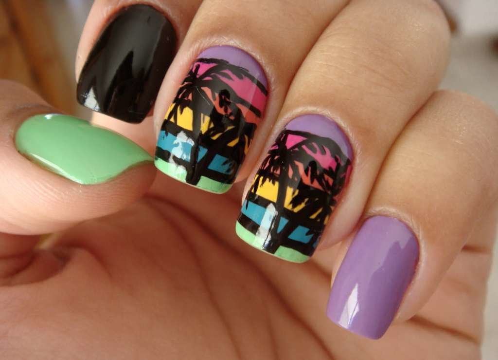 Стильно и интересно смотрится рисунок пальм на однотонном фоне. Какой оттенок выбрать? Тот, что подходит вам по цветотипу кожи или к летним нарядам. Если учесть, что пальма все же летний рисунок, для маникюра стоит выбирать яркие или пастельные оттенки. В этом сезоне особенно востребованными являются мятный, сиреневый или лавандовый, желтый, розовый, нюдовый, а также неоновые оттенки лаков.