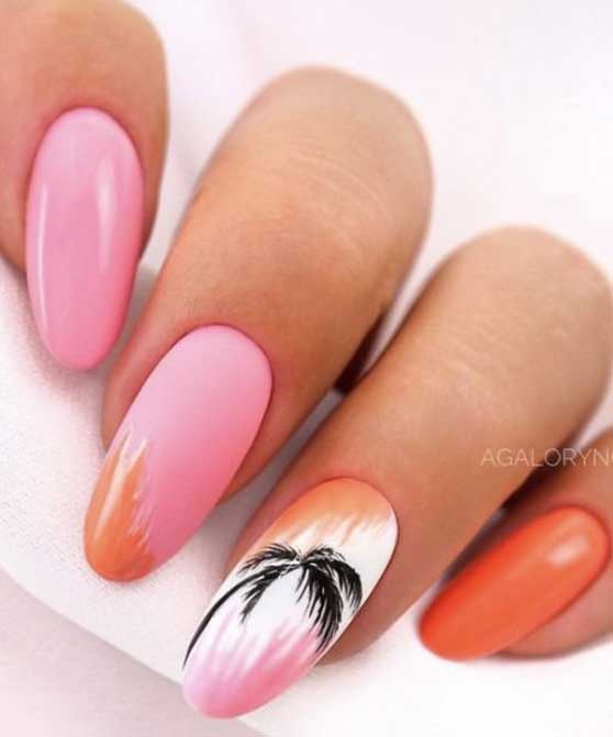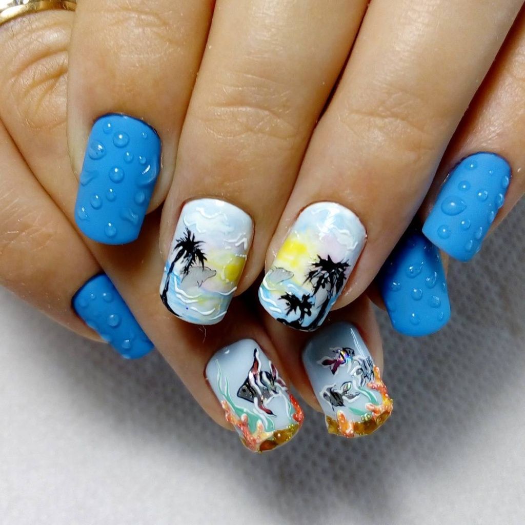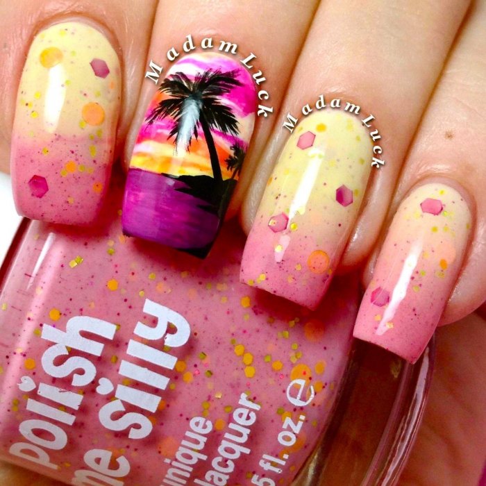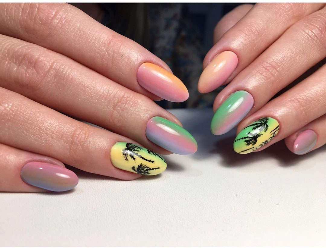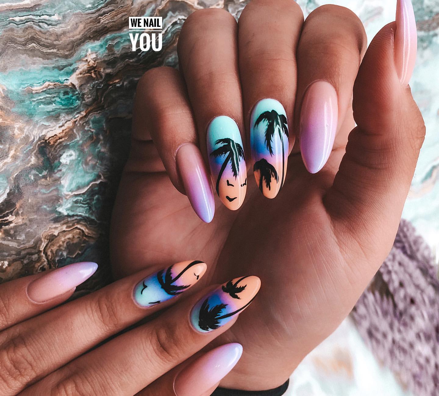 Техника омбре или градиент — отличное решение, если вам хочется создать многомерный рисунок. Сочетание нескольких синих и розовых оттенков сразу укажет на морскую тему. Розовые переливы помогут создать эффект рассвета, а желто-оранжевые — заката. При одном взгляде на такие ноготки будет казаться, что вы живете на тропическом острове.