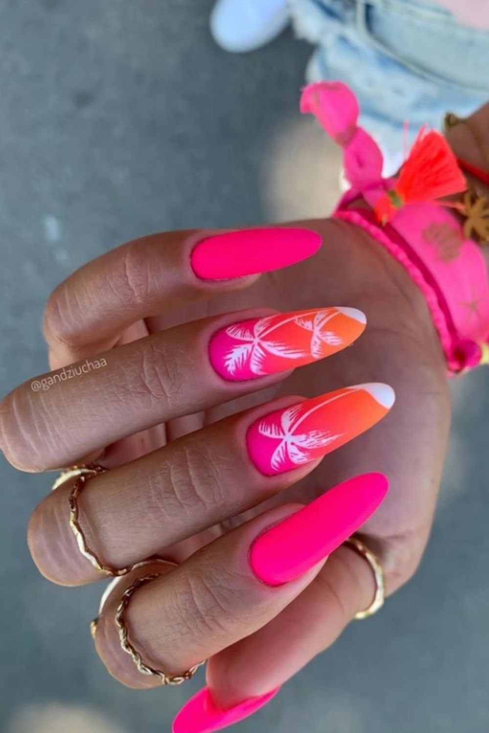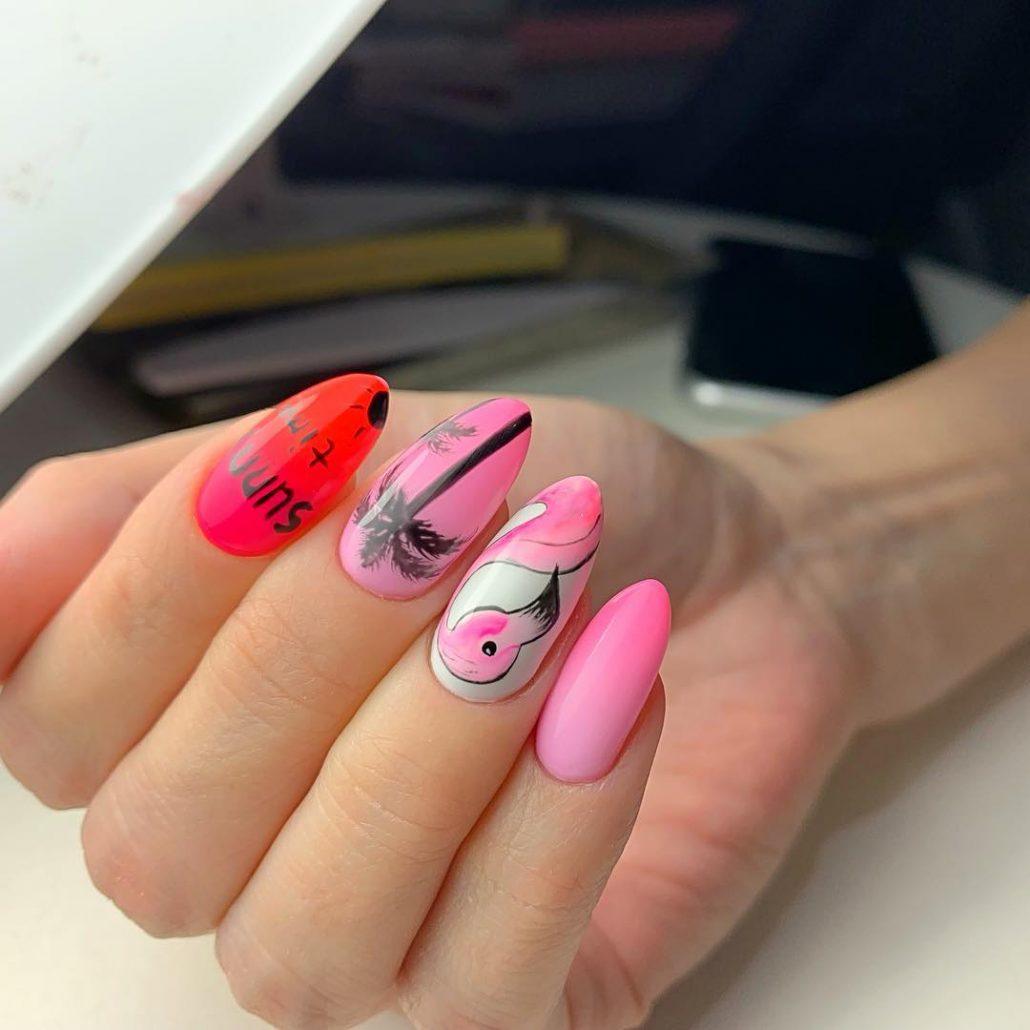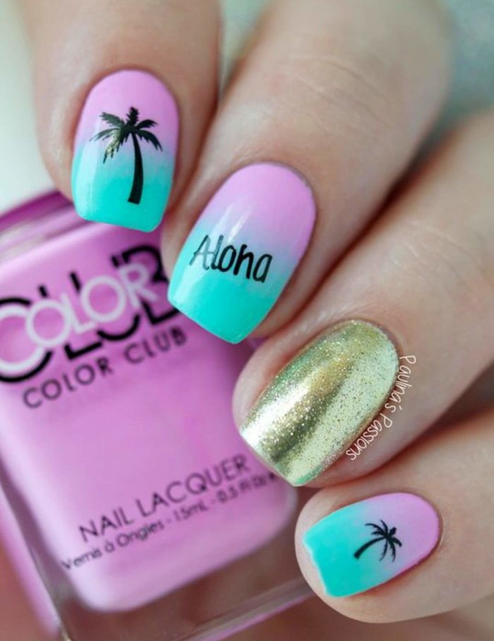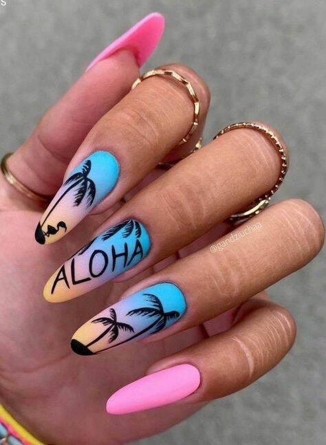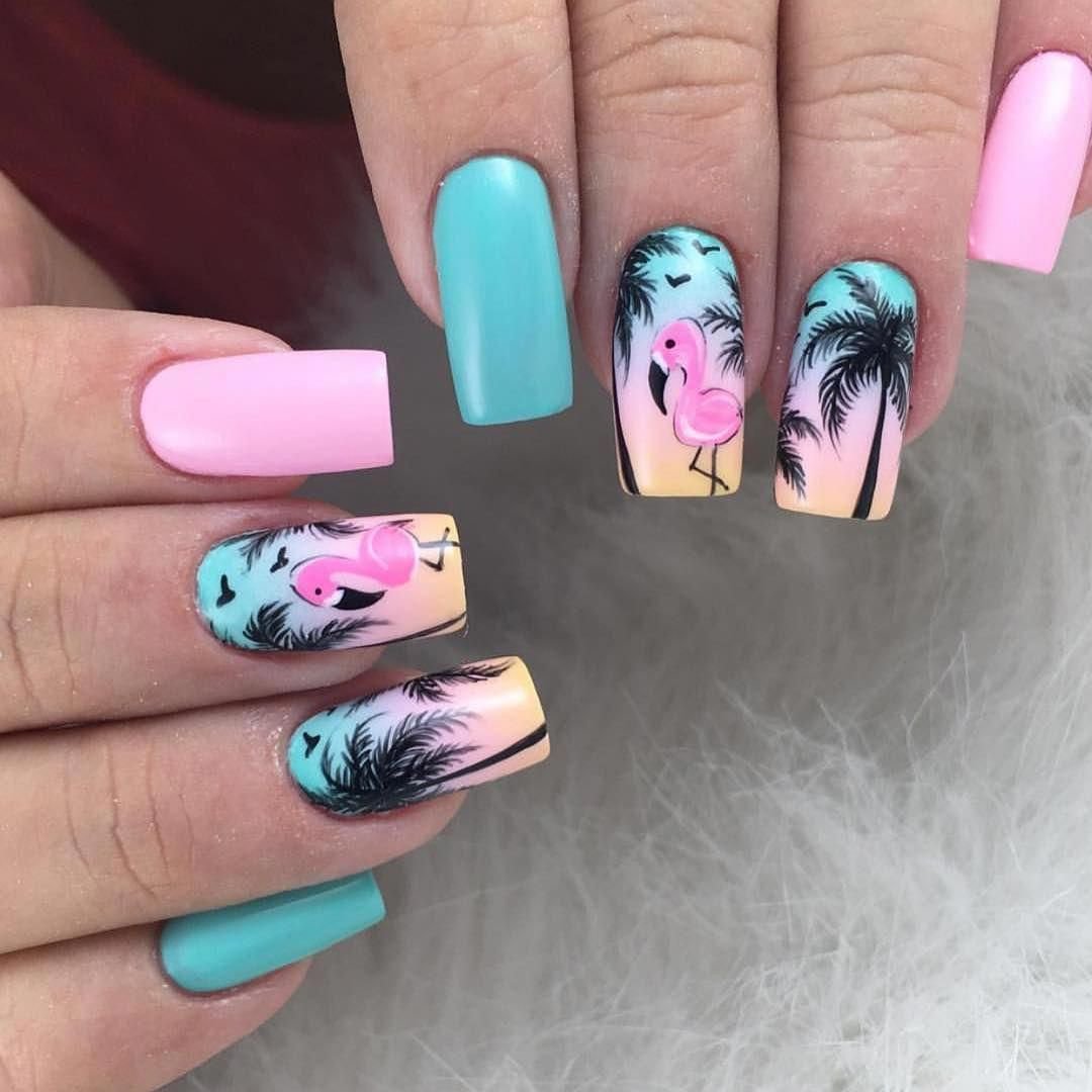 Техника омбре или градиент — отличное решение, если вам хочется создать многомерный рисунок. Сочетание нескольких синих и розовых оттенков сразу укажет на морскую тему. Розовые переливы помогут создать эффект рассвета, а желто-оранжевые — заката. При одном взгляде на такие ноготки будет казаться, что вы живете на тропическом острове.