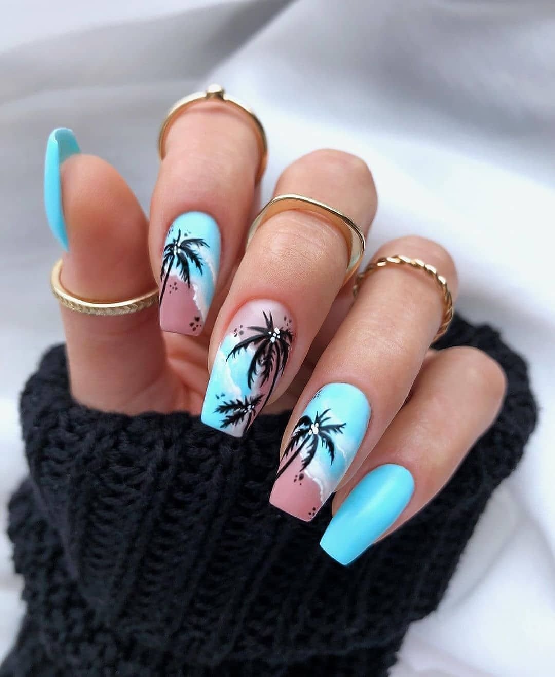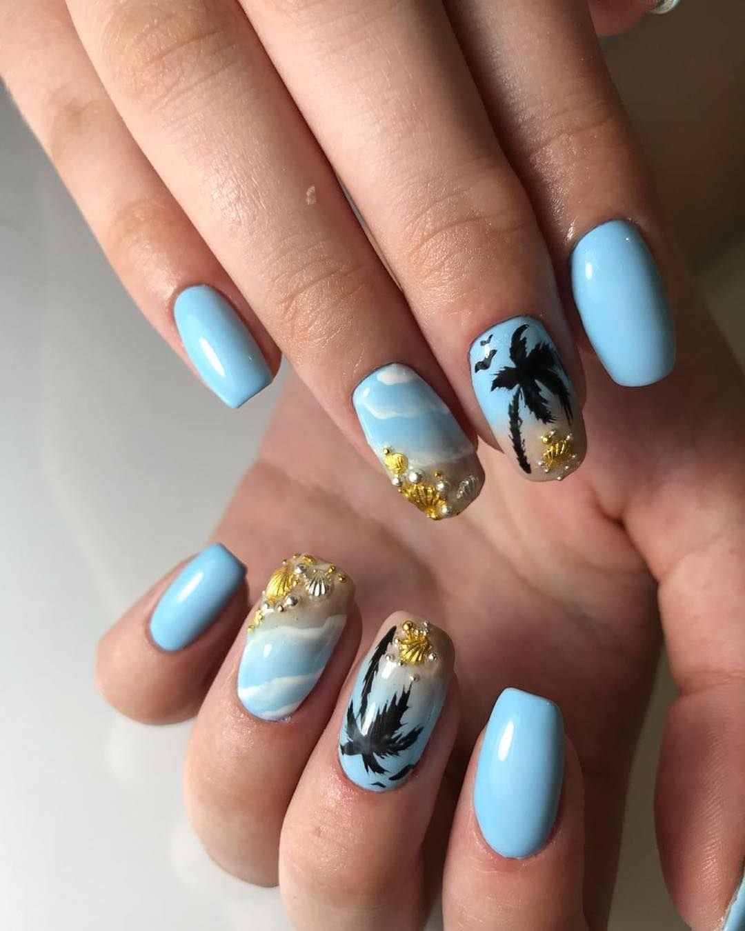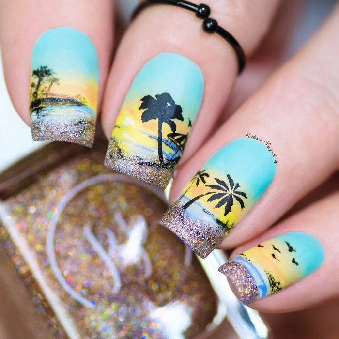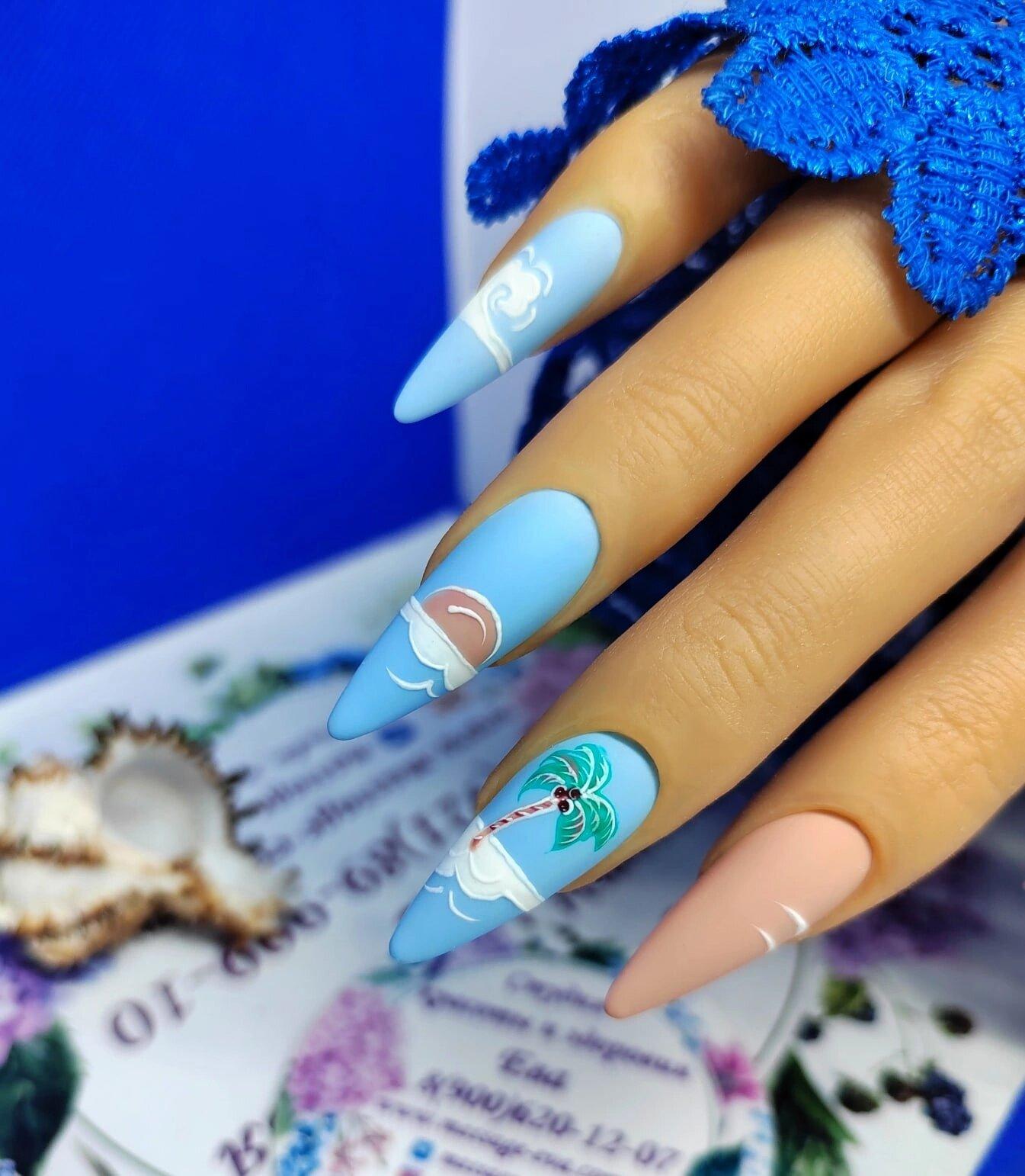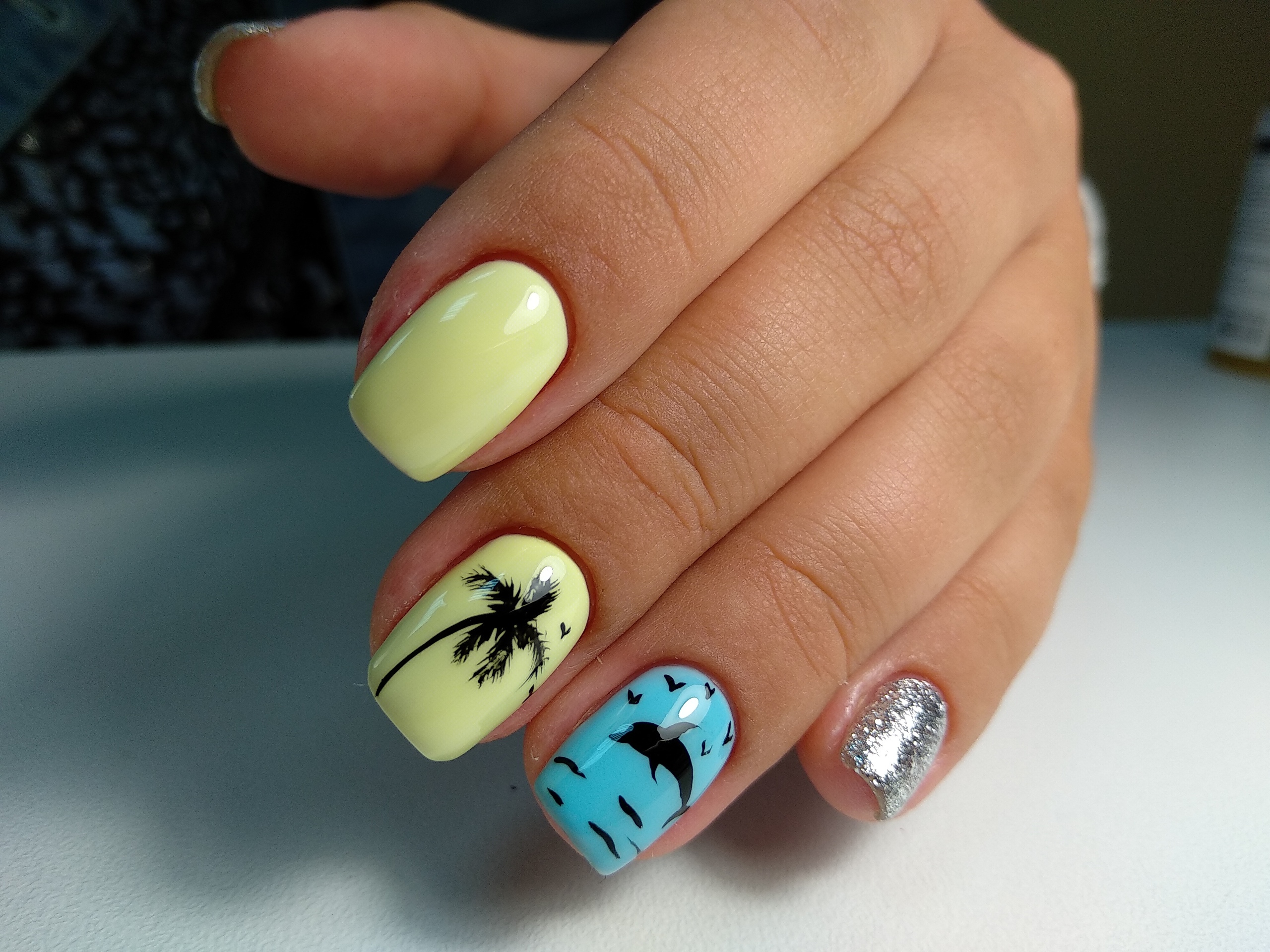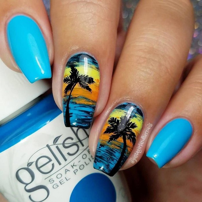 Длинные ногти требуют особого ухода и укрепления. Если не хотите отказываться от большой длины, для отпускного дизайна выбирайте не обычный, а гель-лак. Он более стойкий и позволит защитить пластину от воздействия внешних факторов. Что касается дизайна, на большой пластине можно нарисовать не только пальмы, но и целый морской пейзаж с чайками или альбатросами, океанскими волнами, песком и людьми, отдыхающими на пляже.