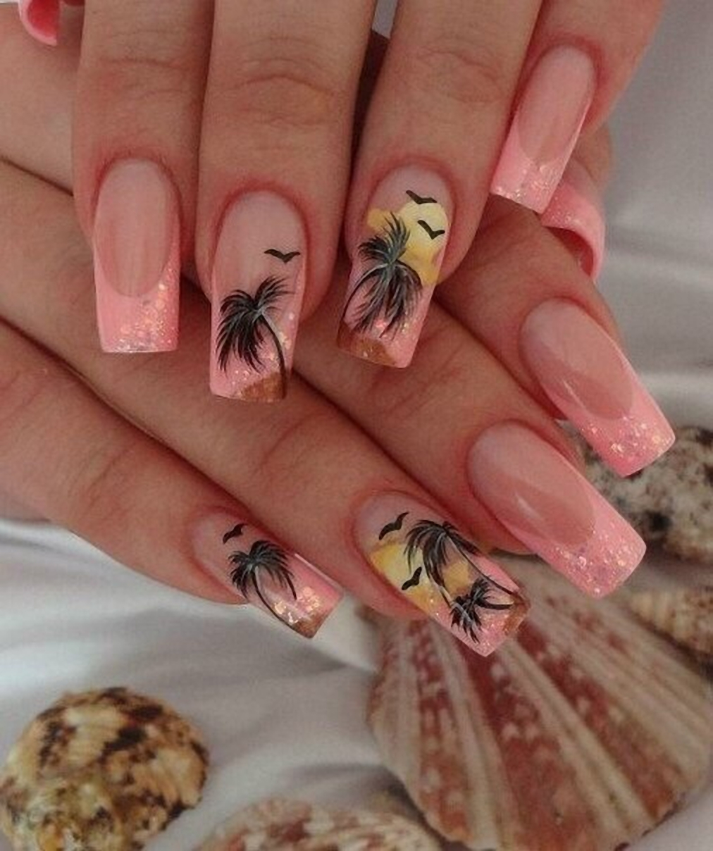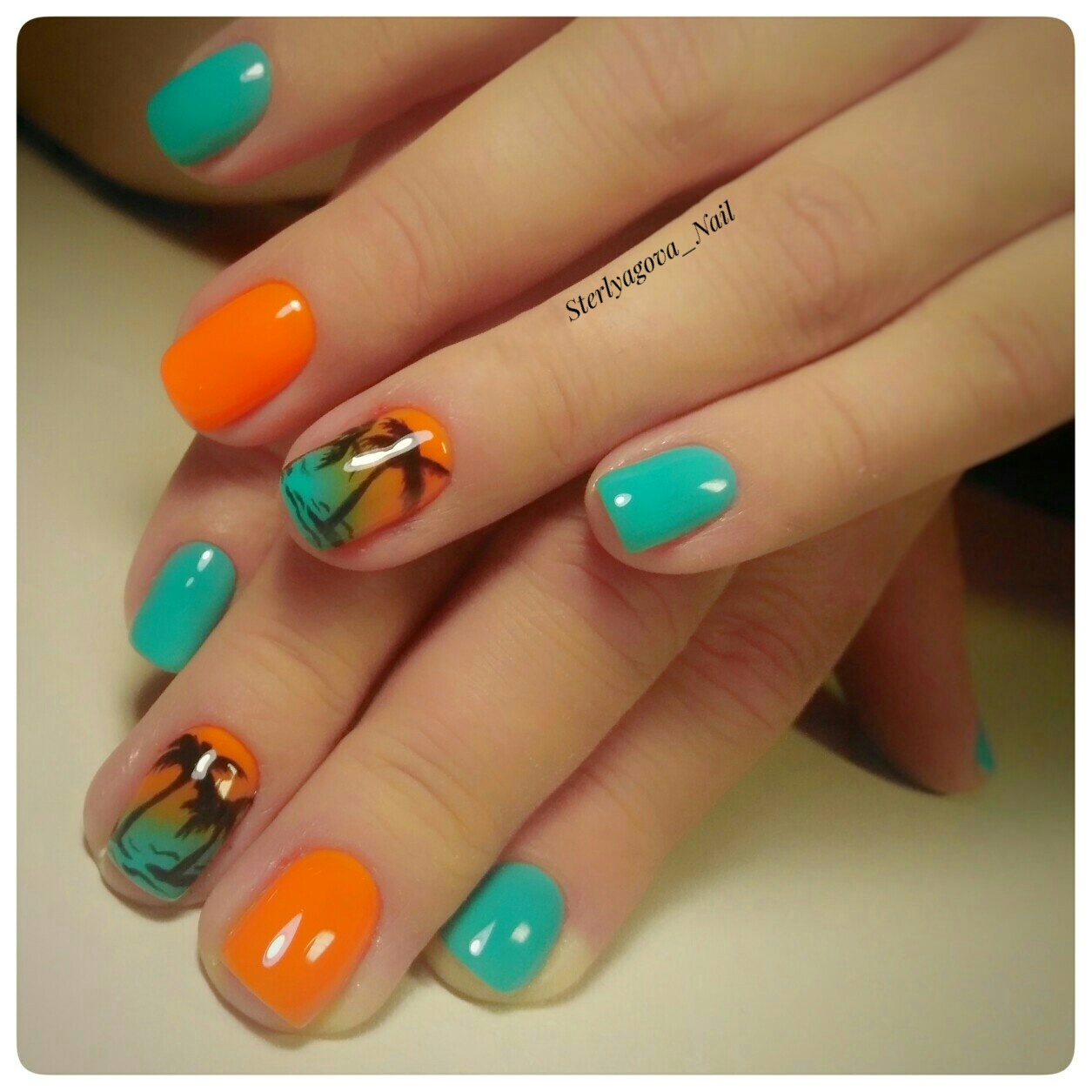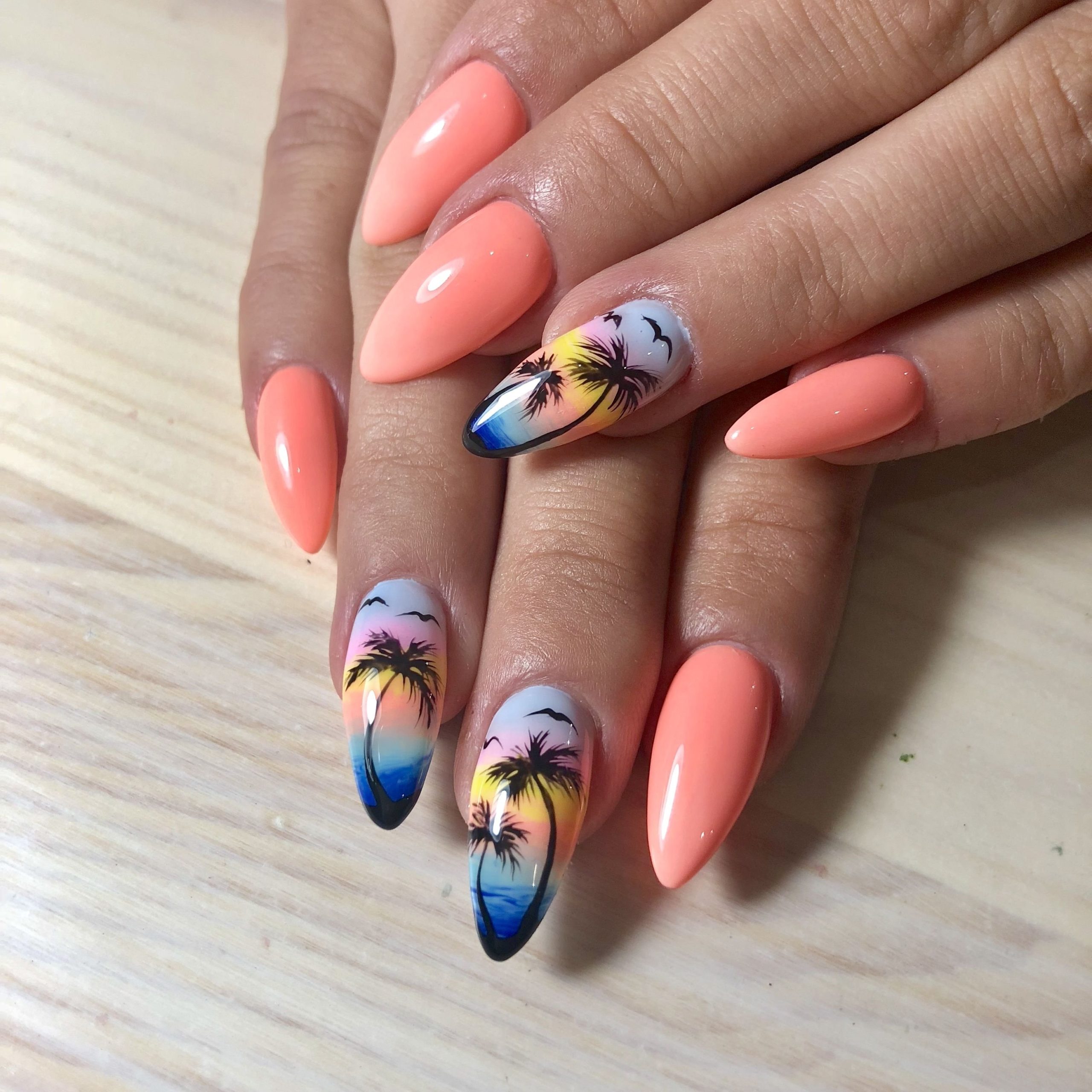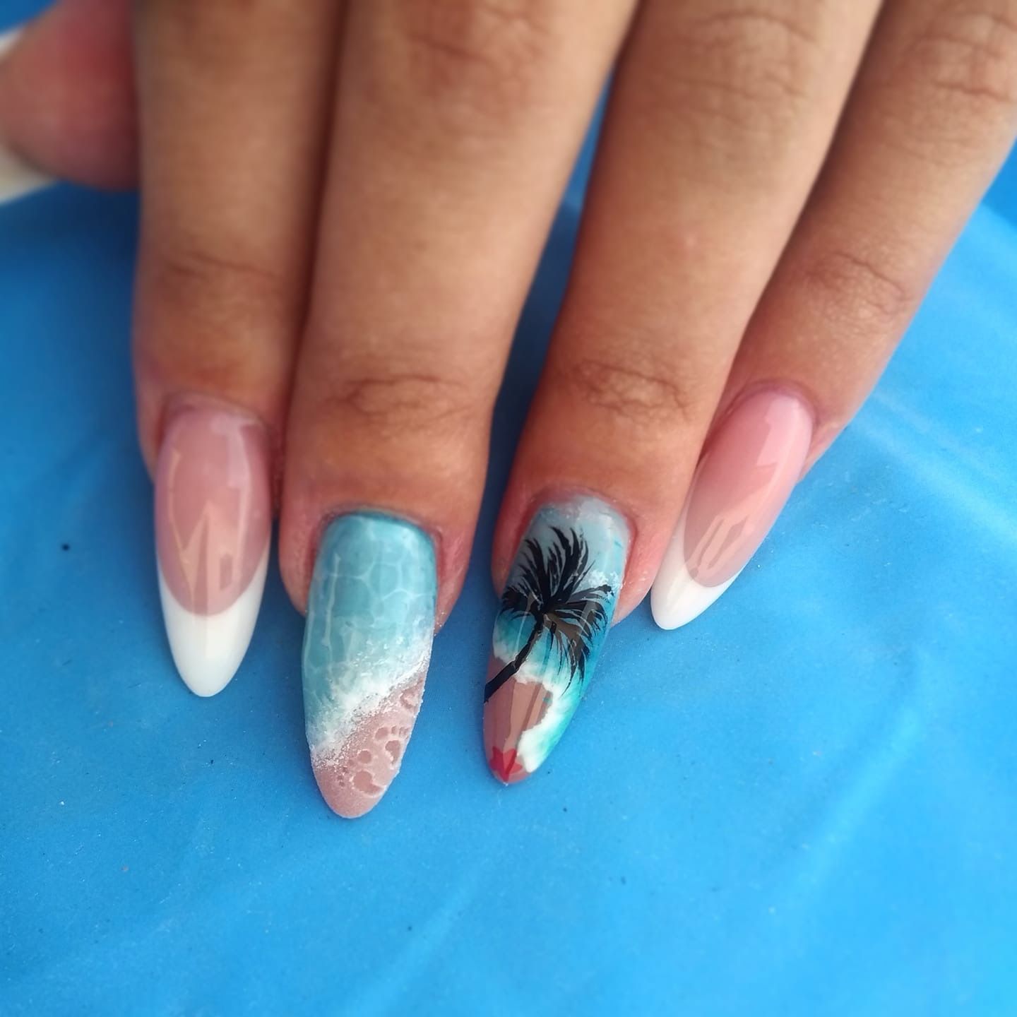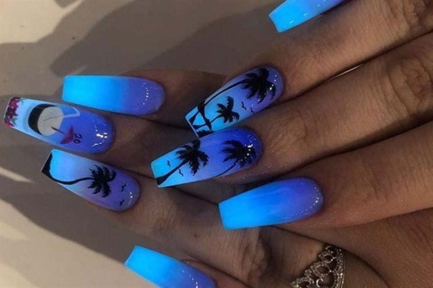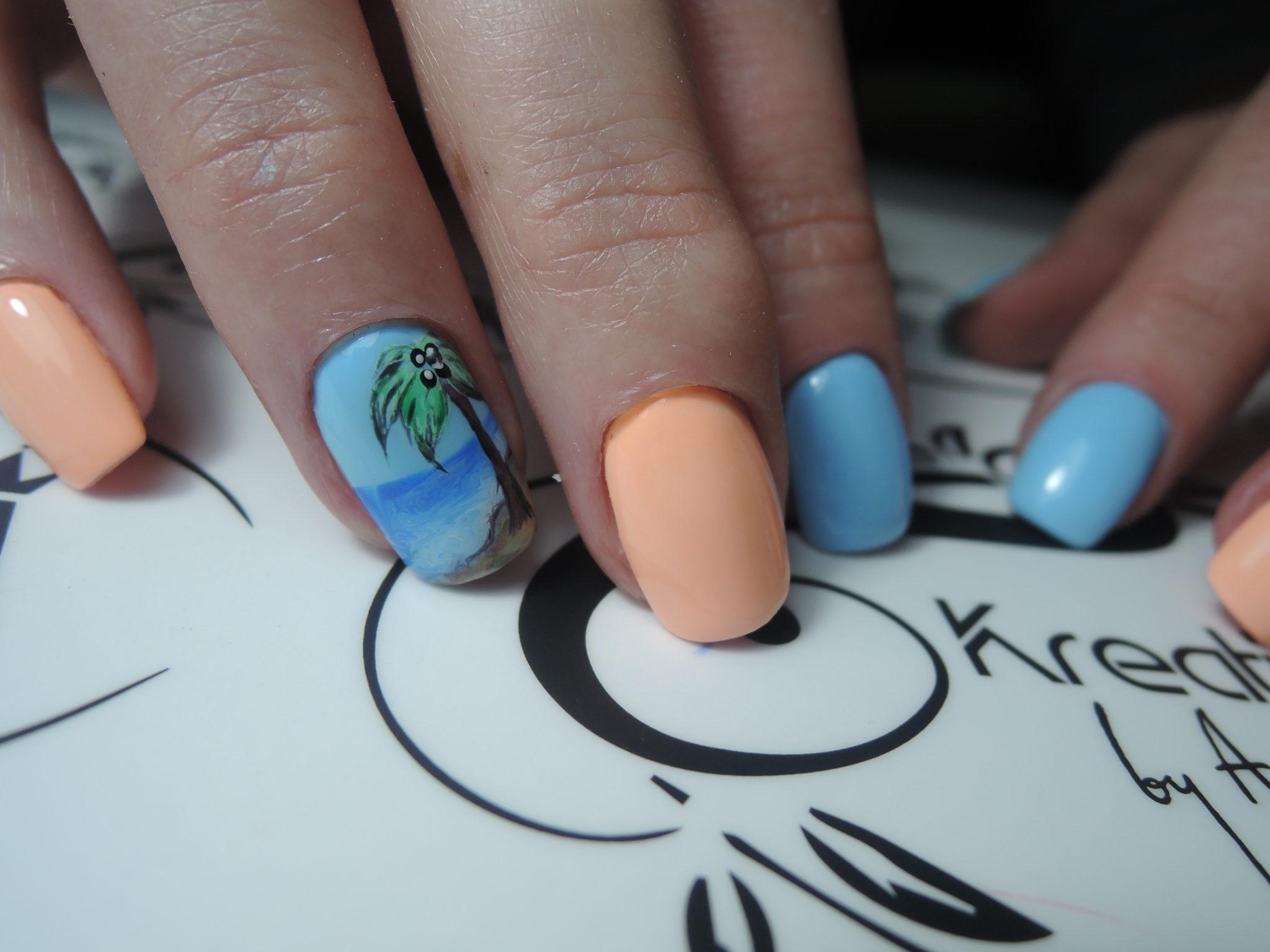 Длинные ногти требуют особого ухода и укрепления. Если не хотите отказываться от большой длины, для отпускного дизайна выбирайте не обычный, а гель-лак. Он более стойкий и позволит защитить пластину от воздействия внешних факторов. Что касается дизайна, на большой пластине можно нарисовать не только пальмы, но и целый морской пейзаж с чайками или альбатросами, океанскими волнами, песком и людьми, отдыхающими на пляже.