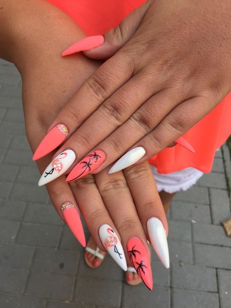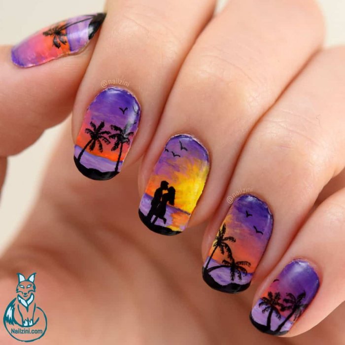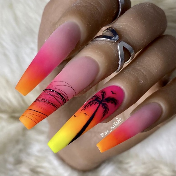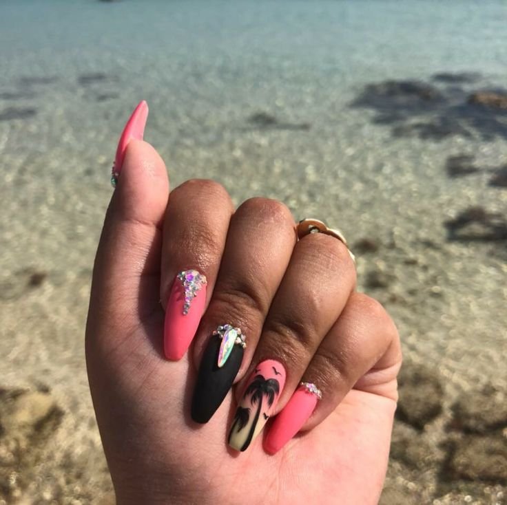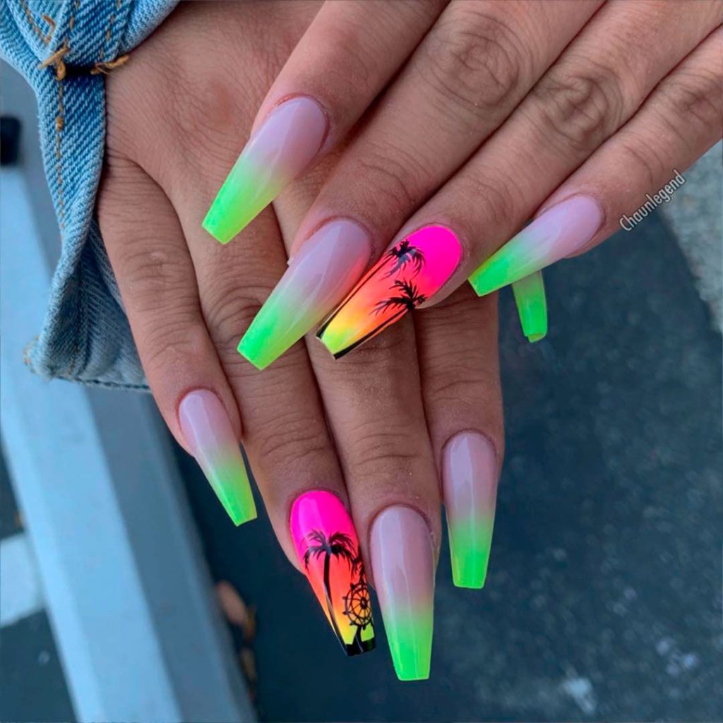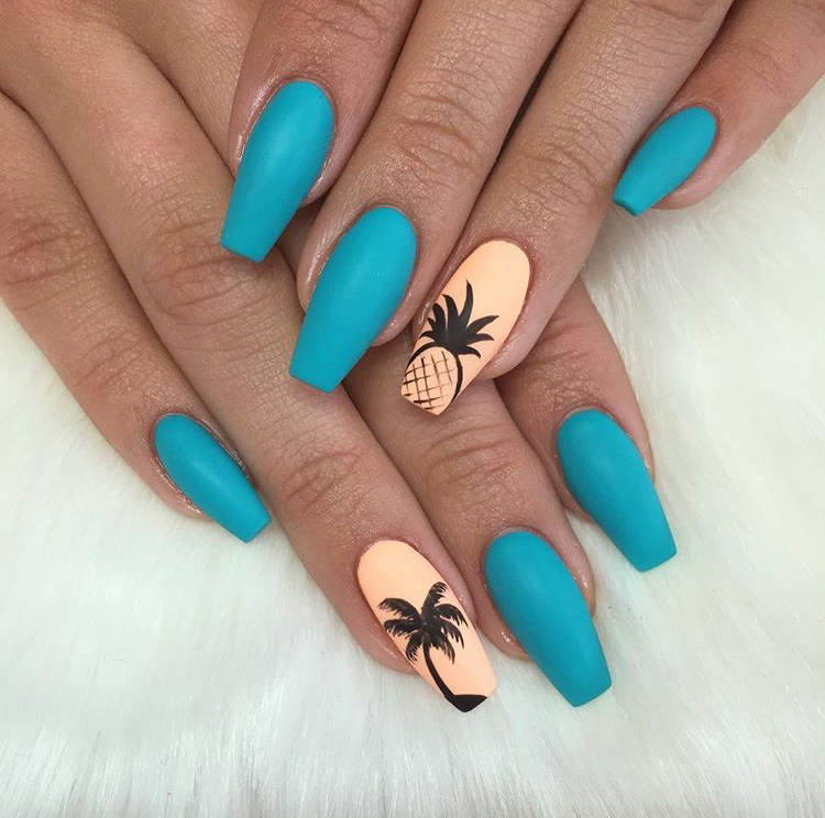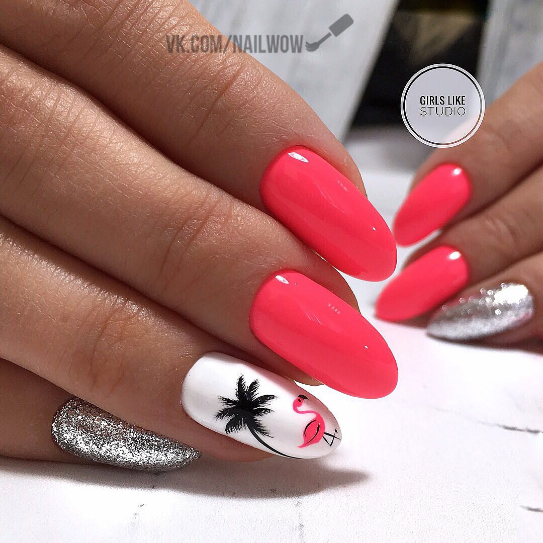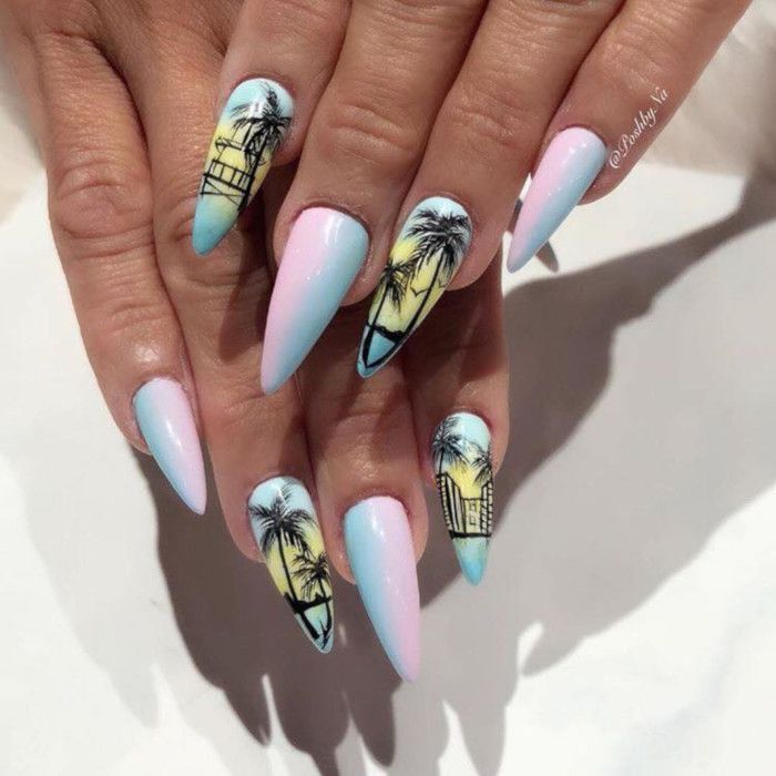 Длинные ногти требуют особого ухода и укрепления. Если не хотите отказываться от большой длины, для отпускного дизайна выбирайте не обычный, а гель-лак. Он более стойкий и позволит защитить пластину от воздействия внешних факторов. Что касается дизайна, на большой пластине можно нарисовать не только пальмы, но и целый морской пейзаж с чайками или альбатросами, океанскими волнами, песком и людьми, отдыхающими на пляже.
