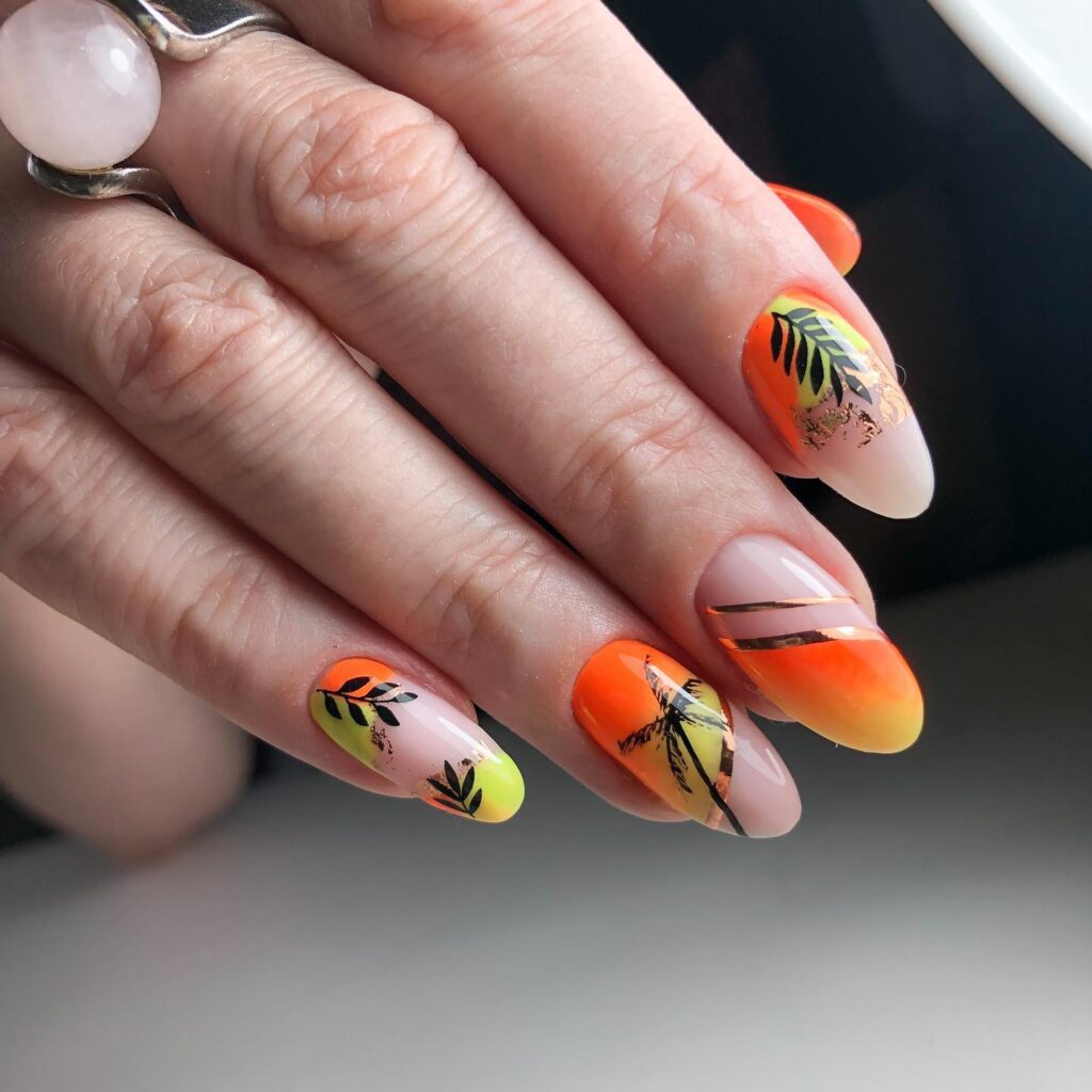 - Создание эффекта омбре. Градиент в нашем случае будет двухцветным. Выбираем два акцентных пальчика на руке (но вы можете оформить в технике омбре все). Аккуратно наносим на половину пластины оранжевый пигмент со стороны лунки и еще один желтый слой — от кончика ногтя до середины. Теперь сухой широкой кисточкой аккуратно растушевываем границу двух цветов. Если получившийся результат показался вам слишком бледным, добавляем еще цвета и не забываем «смешать» границу.