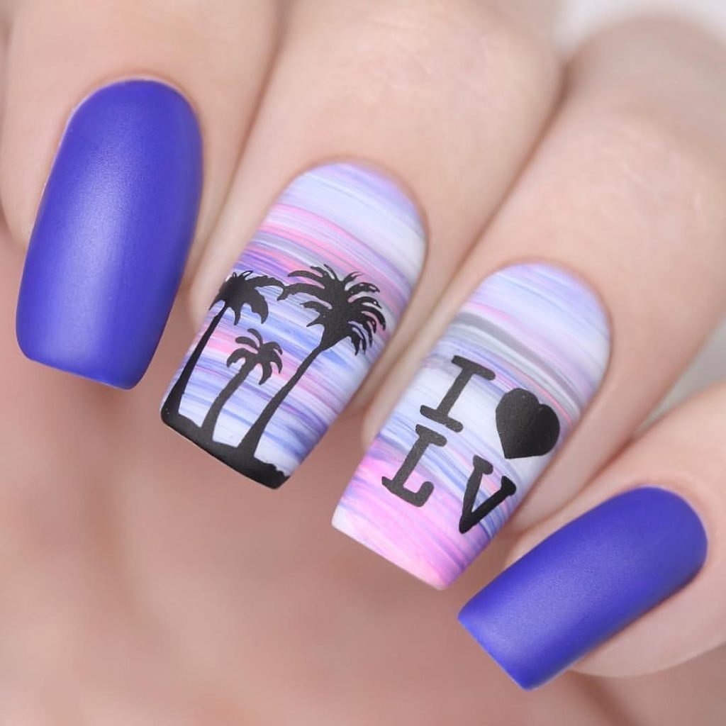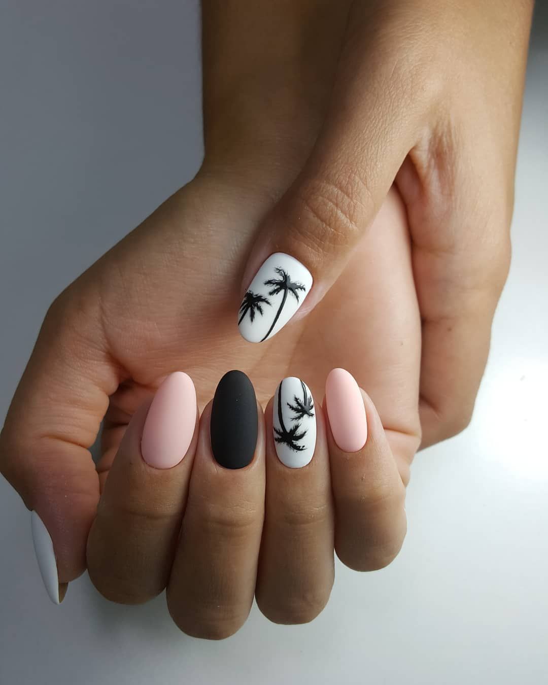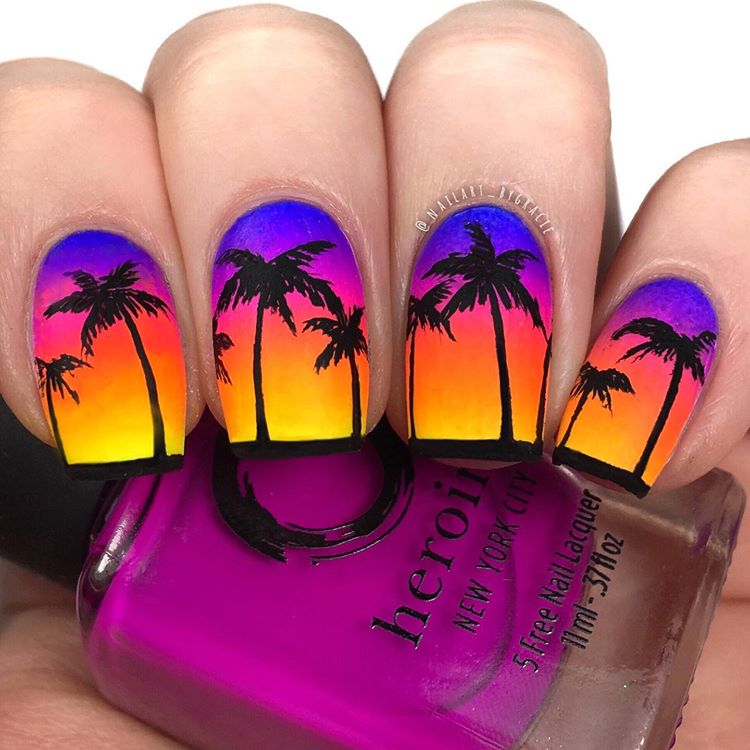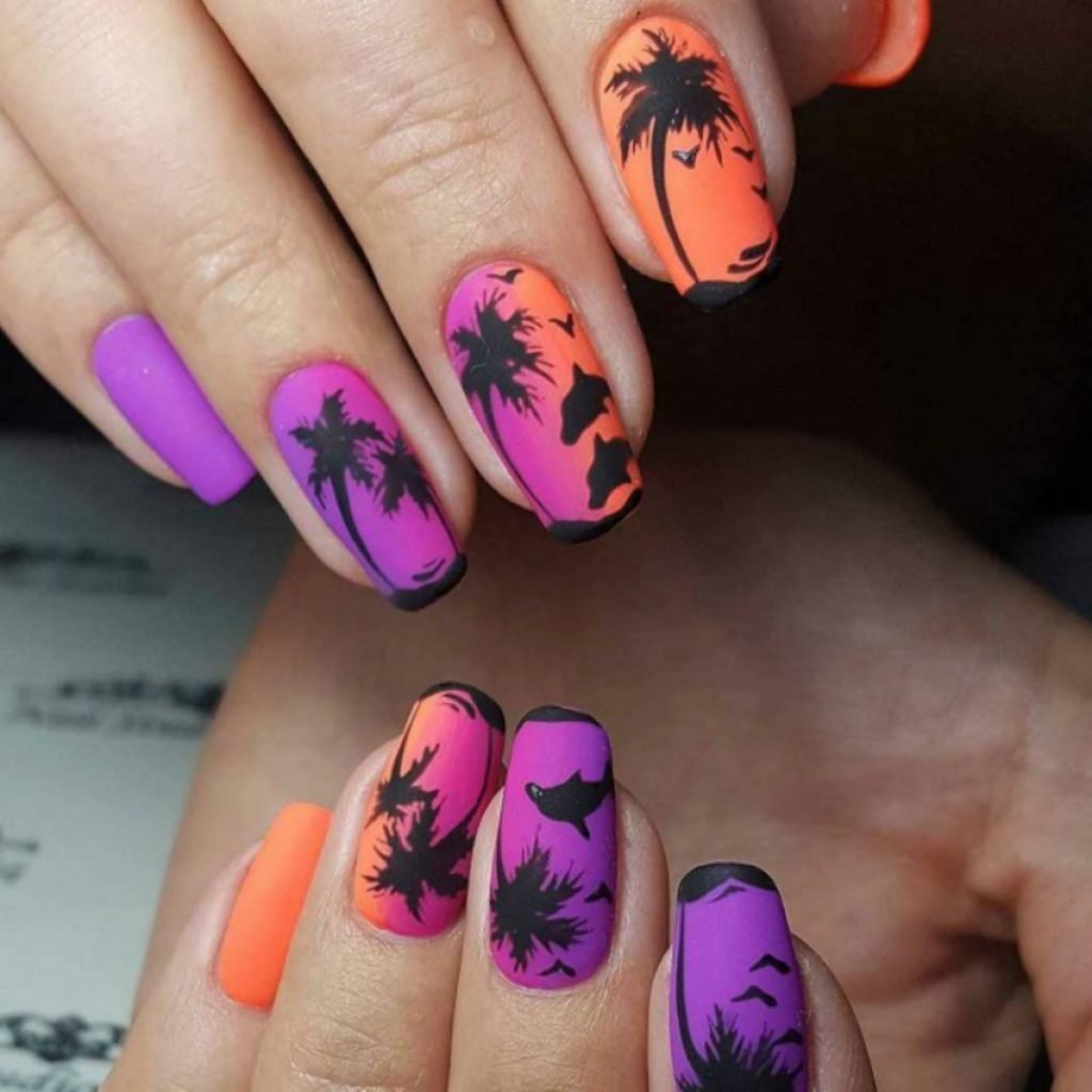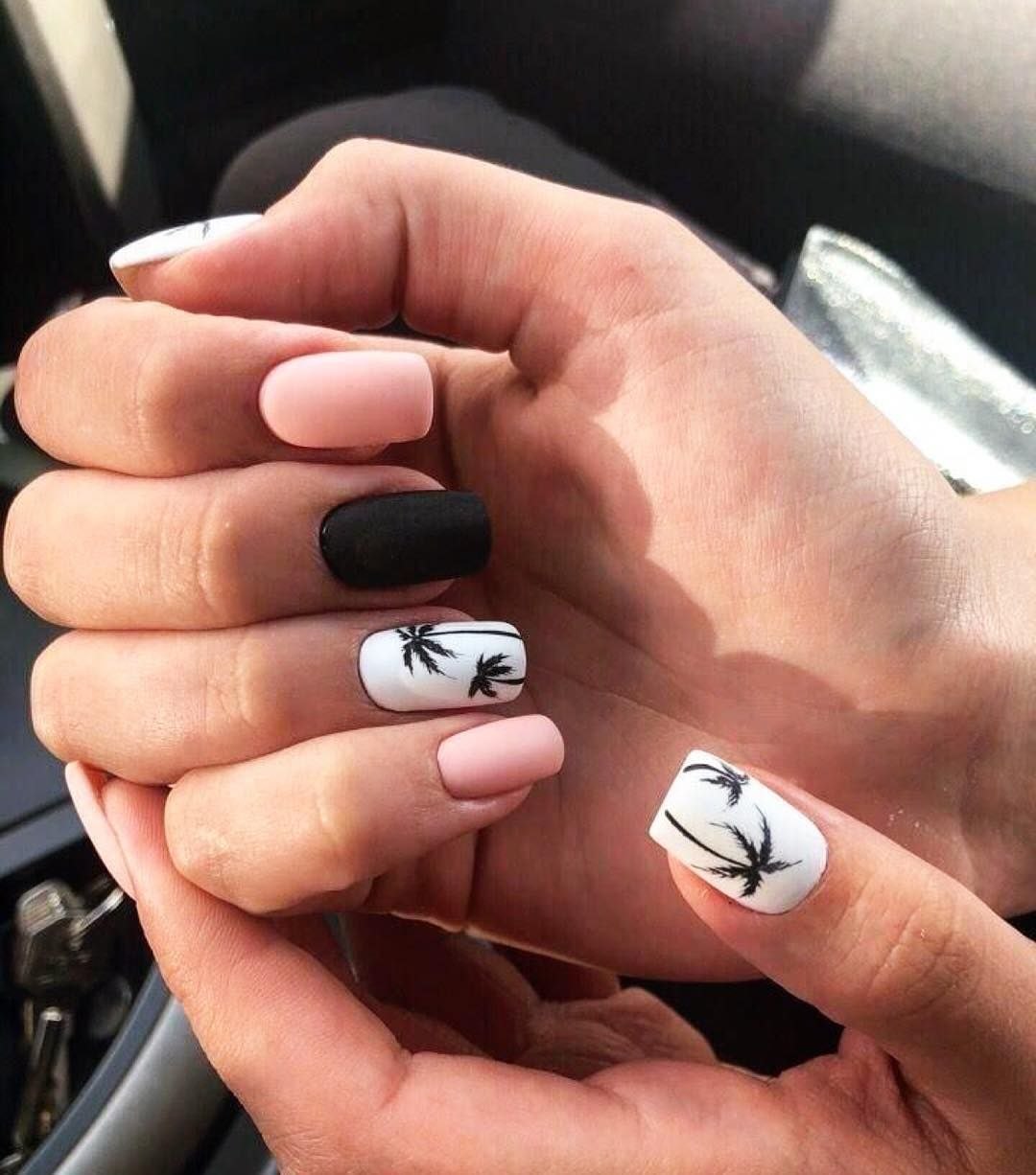 Глянцевые ноготки, несомненно, хороши. Но для рисунка пальмы рекомендуем выбрать матовую текстуру. Она похожа на мягкий бархатный песок пляжа, который вы мечтаете посетить летом. Пальмы на таком фоне выглядят особенно естественно и интересно.