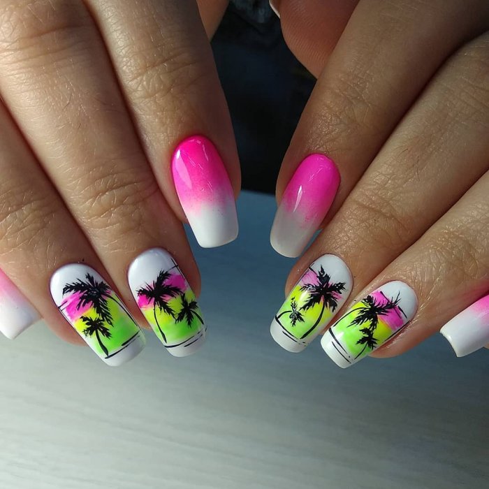 Наступают летние деньки, а это значит, что в образах появляются самые смелые и яркие сочетания цветов. Макияж становится максимально естественным, а вот в маникюре появляются яркие краски, от которых модницы воздерживались даже весной. Меняются и рисунки, которые выбирают для создания трендового нейл-арта. Одним из несомненных лидеров являются пальмы — отдельные листья или сами деревья. Они отлично подходят для маникюра на отдыхе и сочетаются с разными техниками. Расскажем подробнее о том, как создать требований маникюр с пальмами и на что обратить особое внимание.