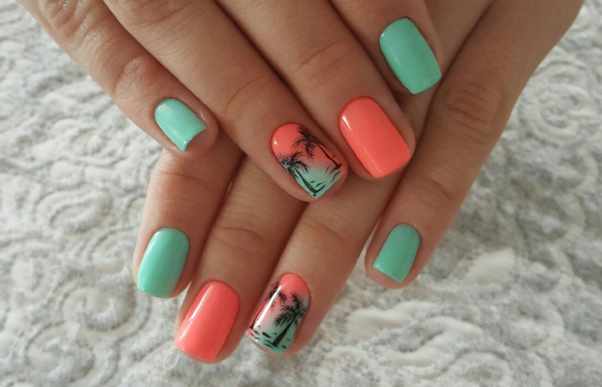 Не хочется делать однотонный дизайн с рисунком пальмы? Тогда выбирайте сочетание цветов. Начать стоит именно с подбора оттенков — для базы и рисунка. Лак можно сочетать как близкий по тону, так и выбрать контрастное сочетание. В любом случае дизайн с пальмами будет смотреться здорово. Кстати, вы можете рисовать на ноготках не целые деревья, а просто ветки.