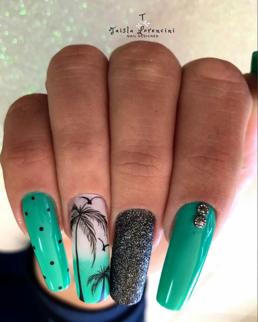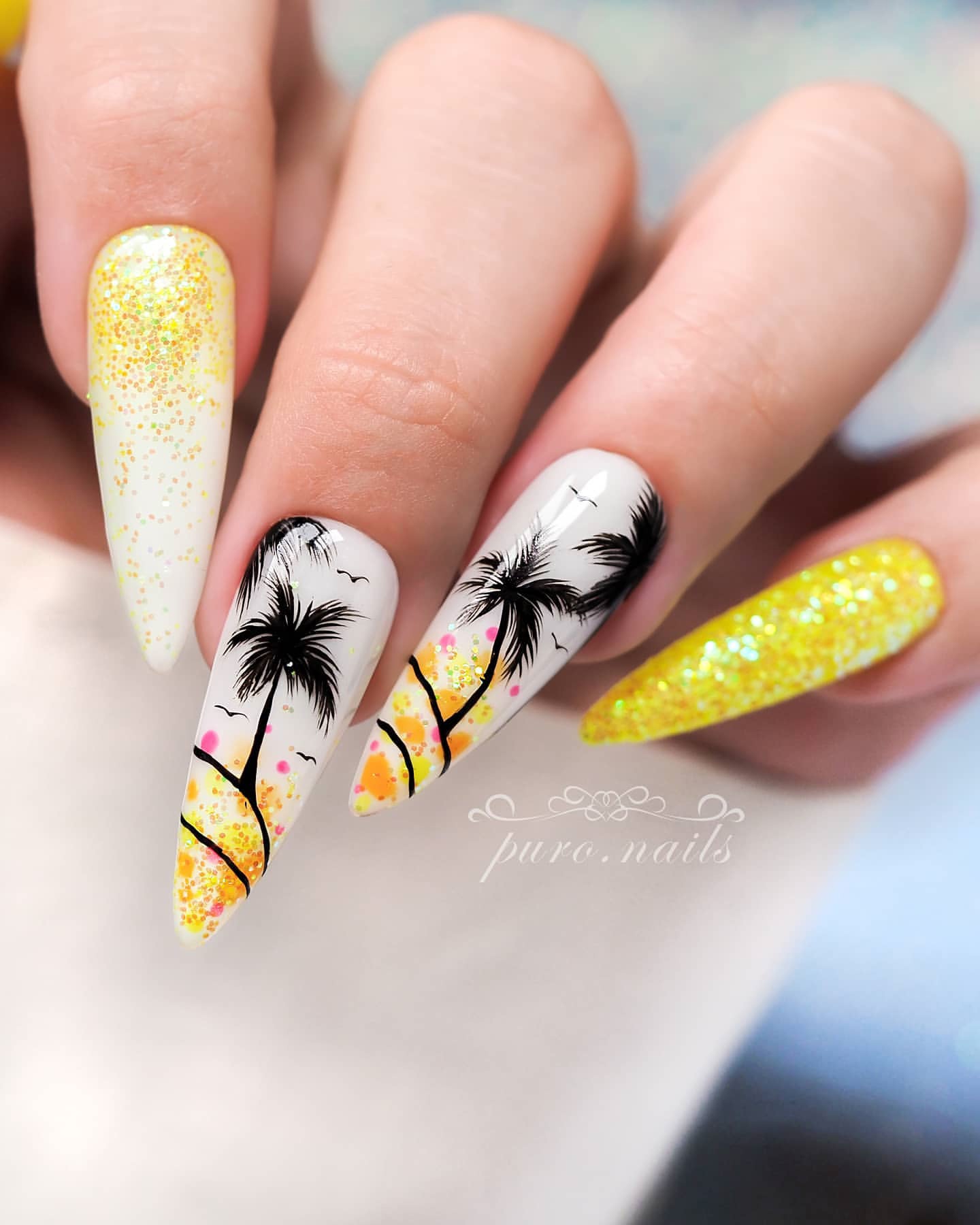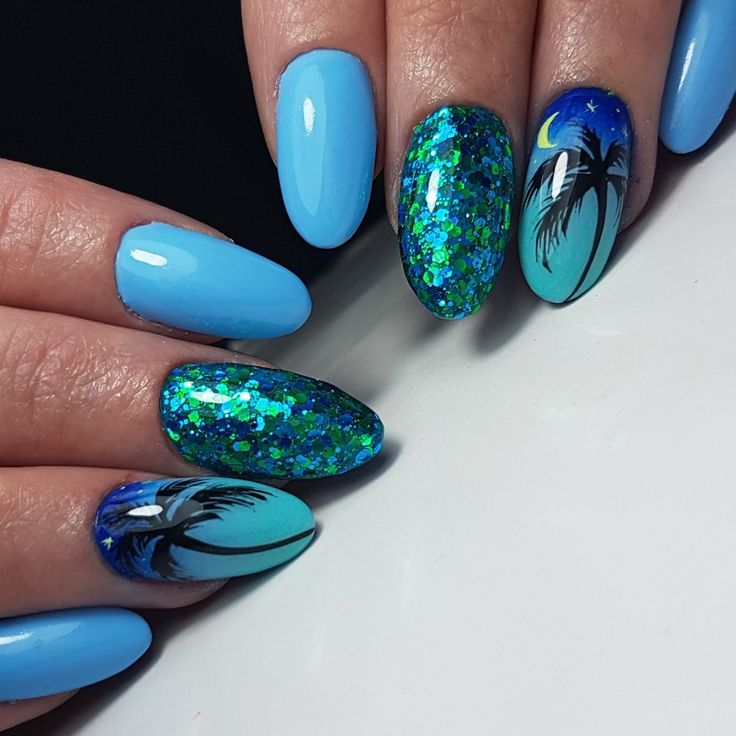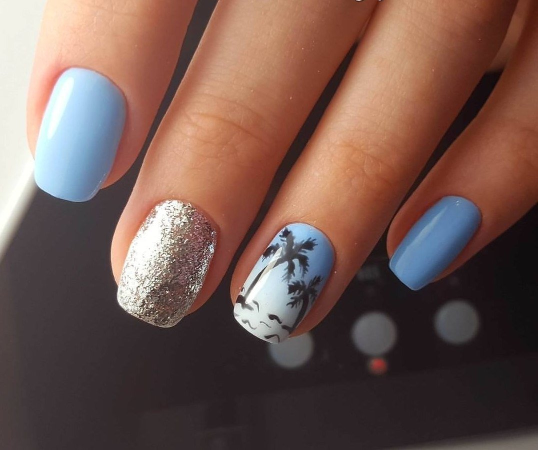 Хотите добавить немного блеска дизайну с пальмами? Обратите внимание на глиттер или фольгу. Стразы — это too much для такого дизайна. Кроме того, камни сложно закрепить таким образом, чтобы они пережили активный отдых и не повредили пластину, не отвалились. Особенно эффектно смотрится вариант с фольгой, если вместо целой пальмы вы нарисуете на ногтях только ее ветки.