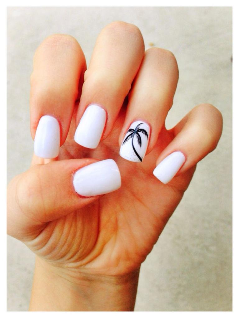Конечно, никаких особенностей в плане техники исполнения здесь нет. Как и любой другой рисунок пальму можно нанести разными способами. Что можно сказать о таком дизайне? Маникюр с пальмами подходит как для коротких, так и для длинных ногтей, независимо от их формы. Пальмы обычно рисуют на ногтях непосредственно перед поездкой в отпуск или, наоборот, носят уже после него. Такой дизайн отлично смотрится с загорелой кожей рук и напоминает о теплых днях, проведенных на море.